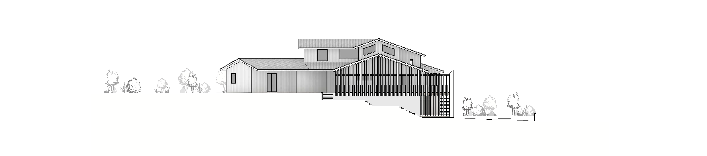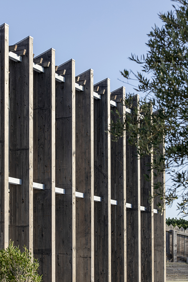 핵심 전략은 집의 크기를 적극적으로 활용하면서, 래미네이트 더글러스 목재로 만든 대형 차양 구조물을 도입하는 것이었다. 이 수직 목재 루버는 집 전체의 다양한 매스를 하나의 선으로 통합하면서도, 여러 기능을 수행한다.