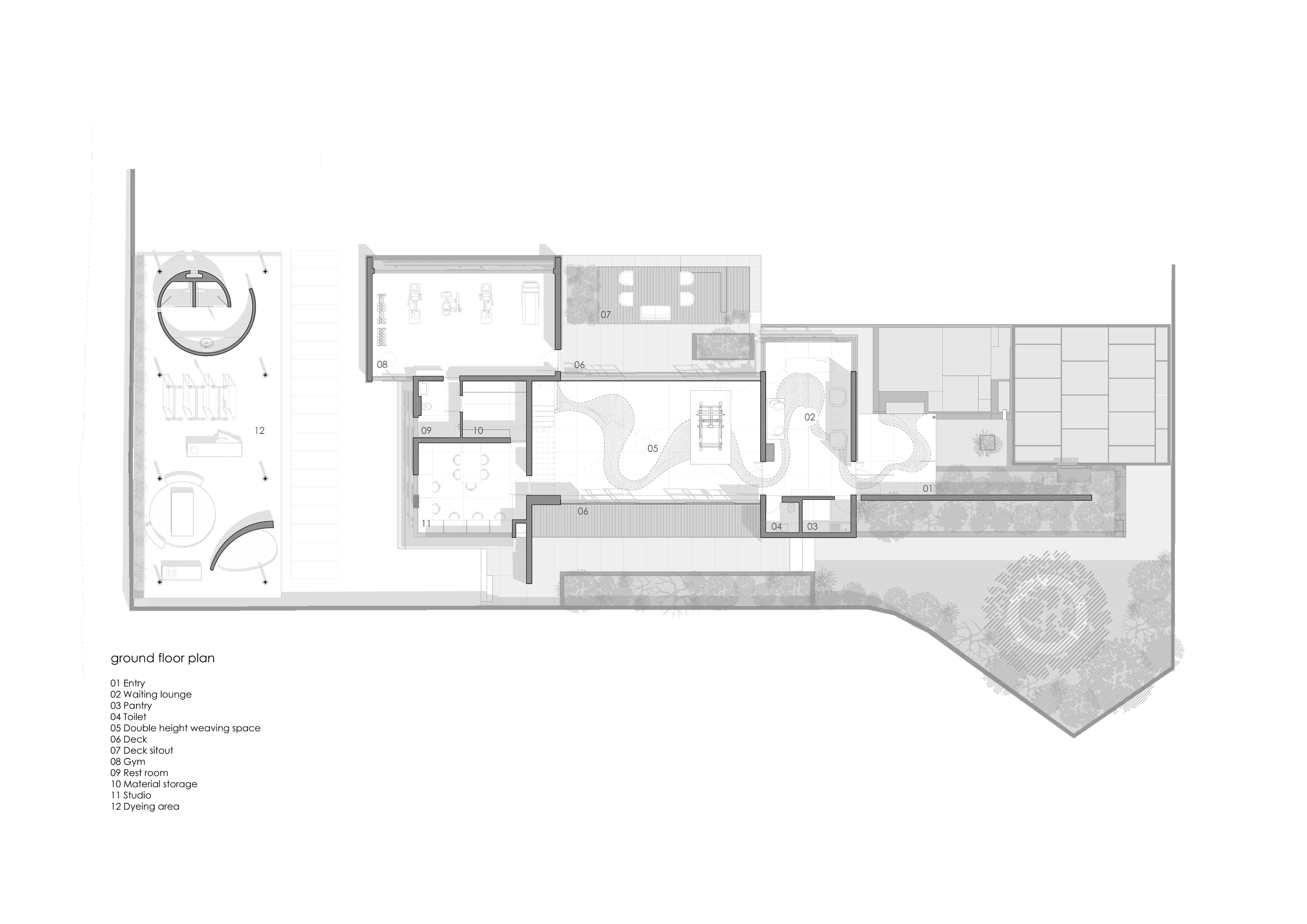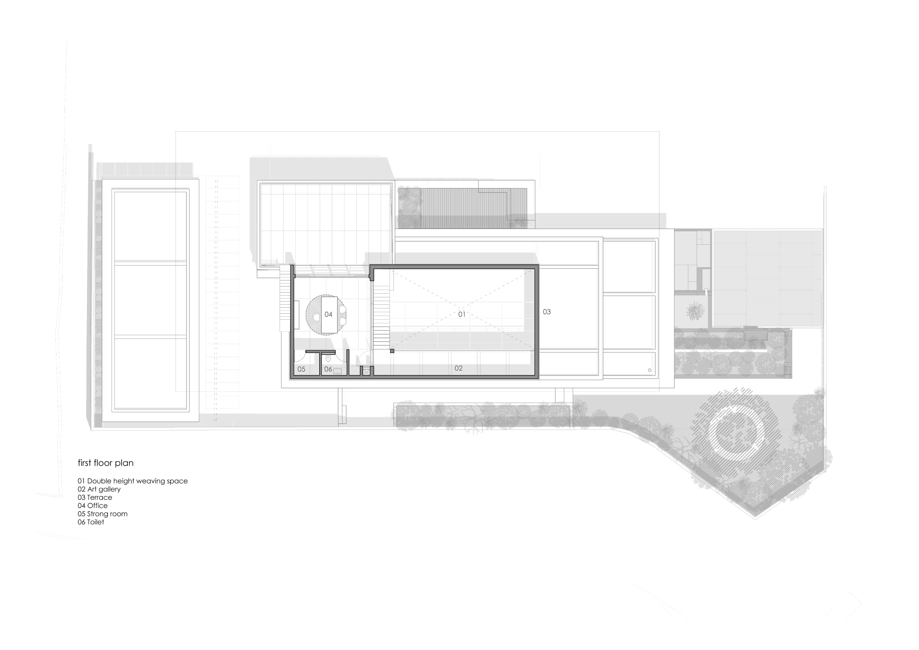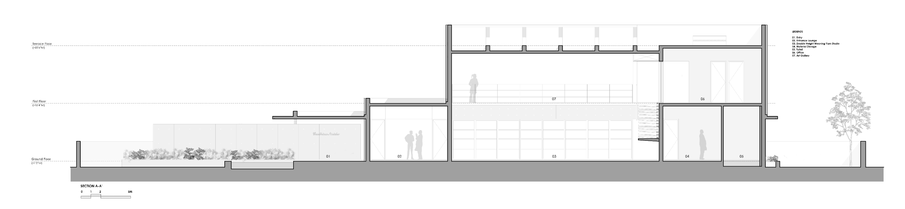 전체 공간은 동서 방향으로 배치되어 북쪽과 남쪽에 긴 면을 열고 자연광을 극대화했으며, 동쪽 진입부에서 서쪽의 개인 작업실로 이어지는 흐름이 직관적으로 이어진다. 주요 공간은 20×40피트 규모의 이중 높이로 직물 전시 공간으로 구성되어 있으며, 목재 창호 프레임과 유리 개구부를 통해 견고하면서도 가볍게 떠 있는 듯한 인상을 준다.