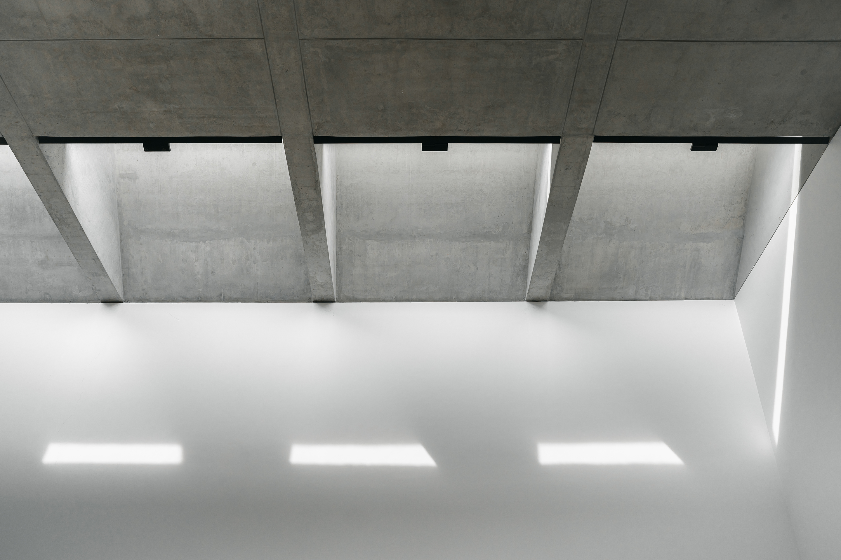 외부는 얇은 천연석 마감으로 단단한 질감을 강조했고, 내부는 흰 벽과 테라조 바닥, 목재 창호로 구성되어 작품이 돋보이도록 중립적인 배경을 제공한다. 바닥에는 섬세한 흰 대리석 인레이가 직물의 물결을 연상시키는 곡선으로 배치되어 공간을 유기적으로 연결한다.