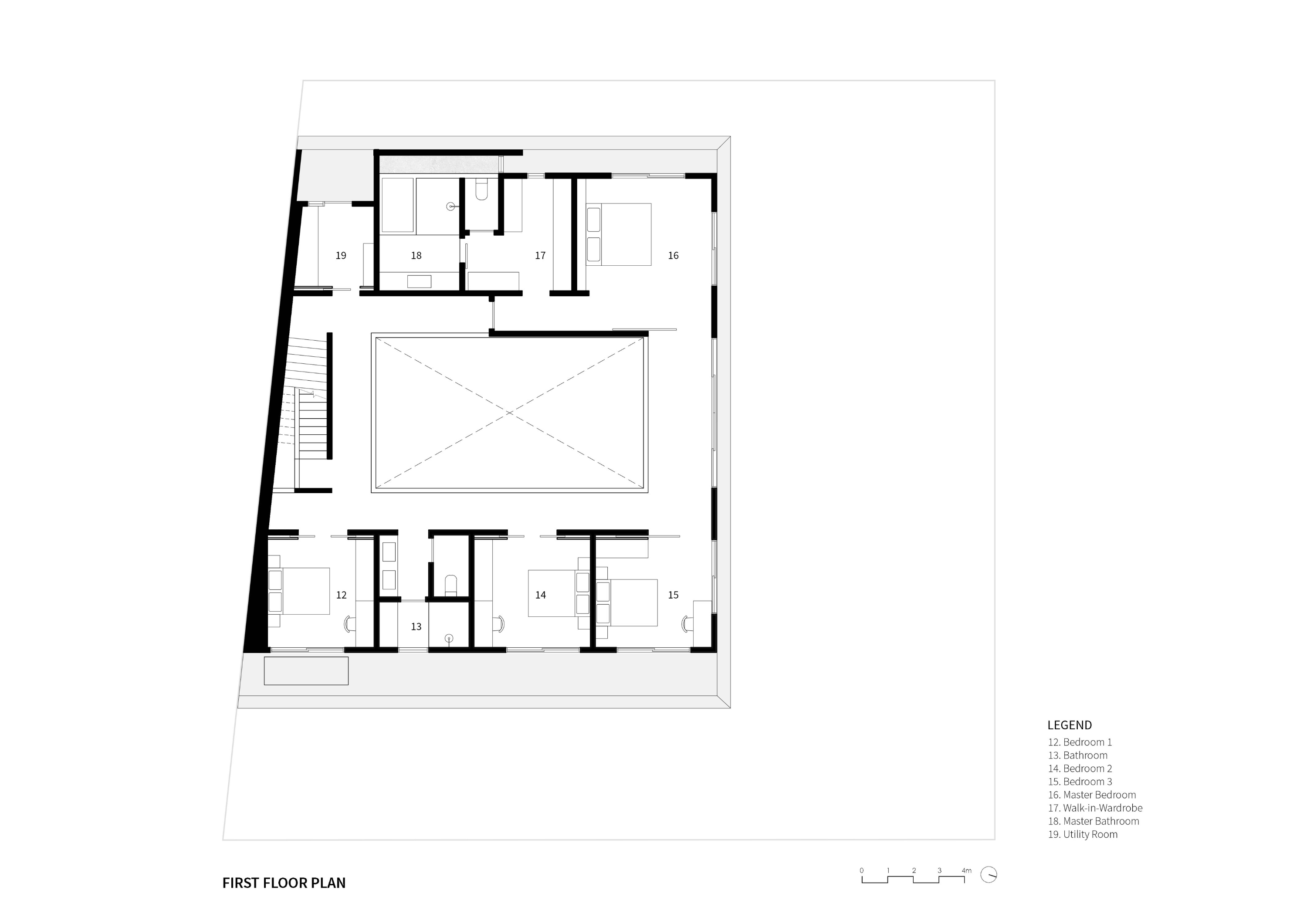 이 공간은 가족 구성원 간의 수평 및 수직적 연결을 고려하여 설계되었다. 1층으로 이어지는 계단은 대지의 경계선을 따라 배치되었고, 2층 계단은 그와 직각으로 구성되어 빛이 계단실 사이로 스며들 수 있도록 했다. 2층에는 마스터룸과 자녀 침실이 중앙 void를 따라 복도로 연결되어 있으며, 모두 큰 슬라이딩 도어로 닫거나 열 수 있다.