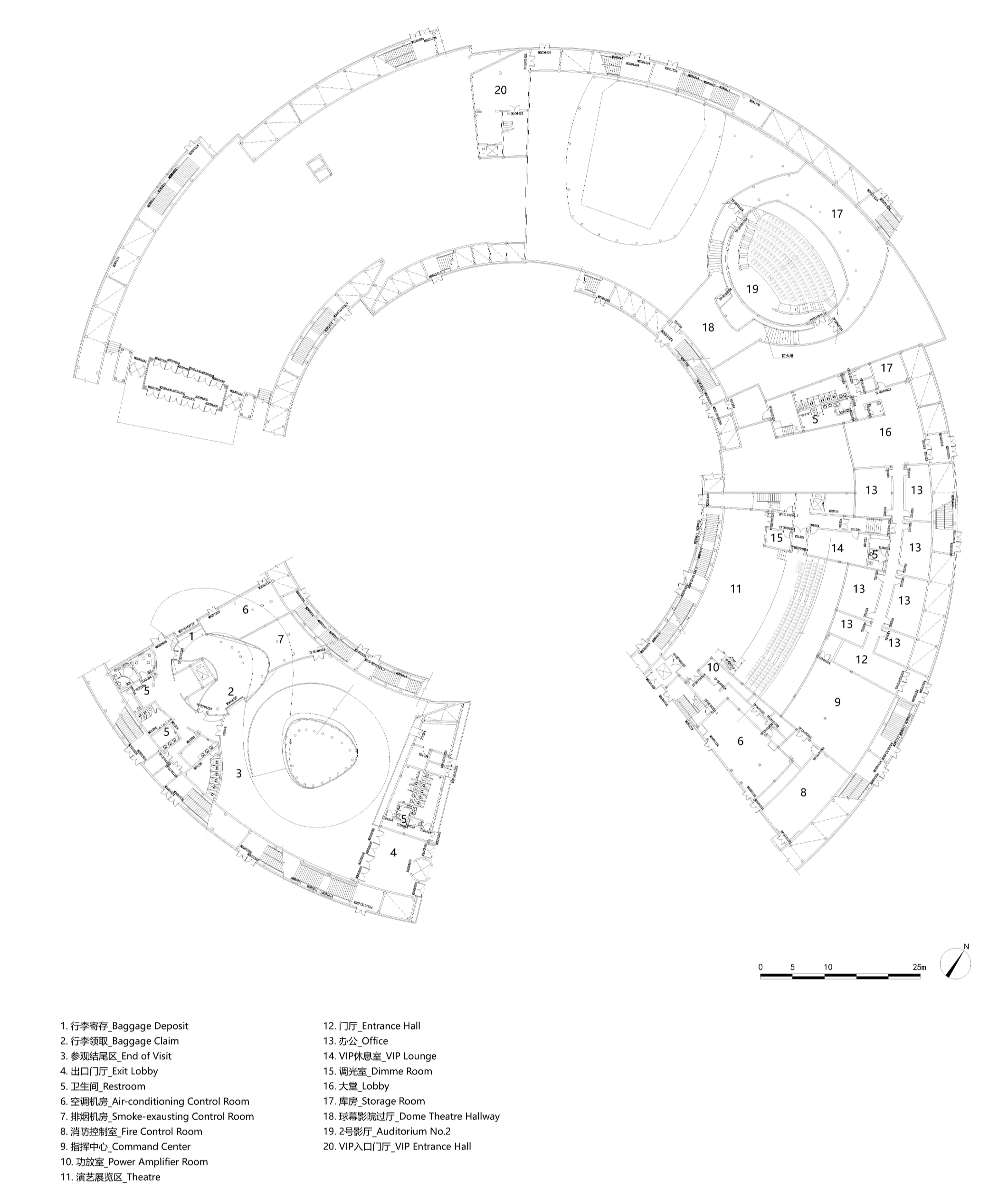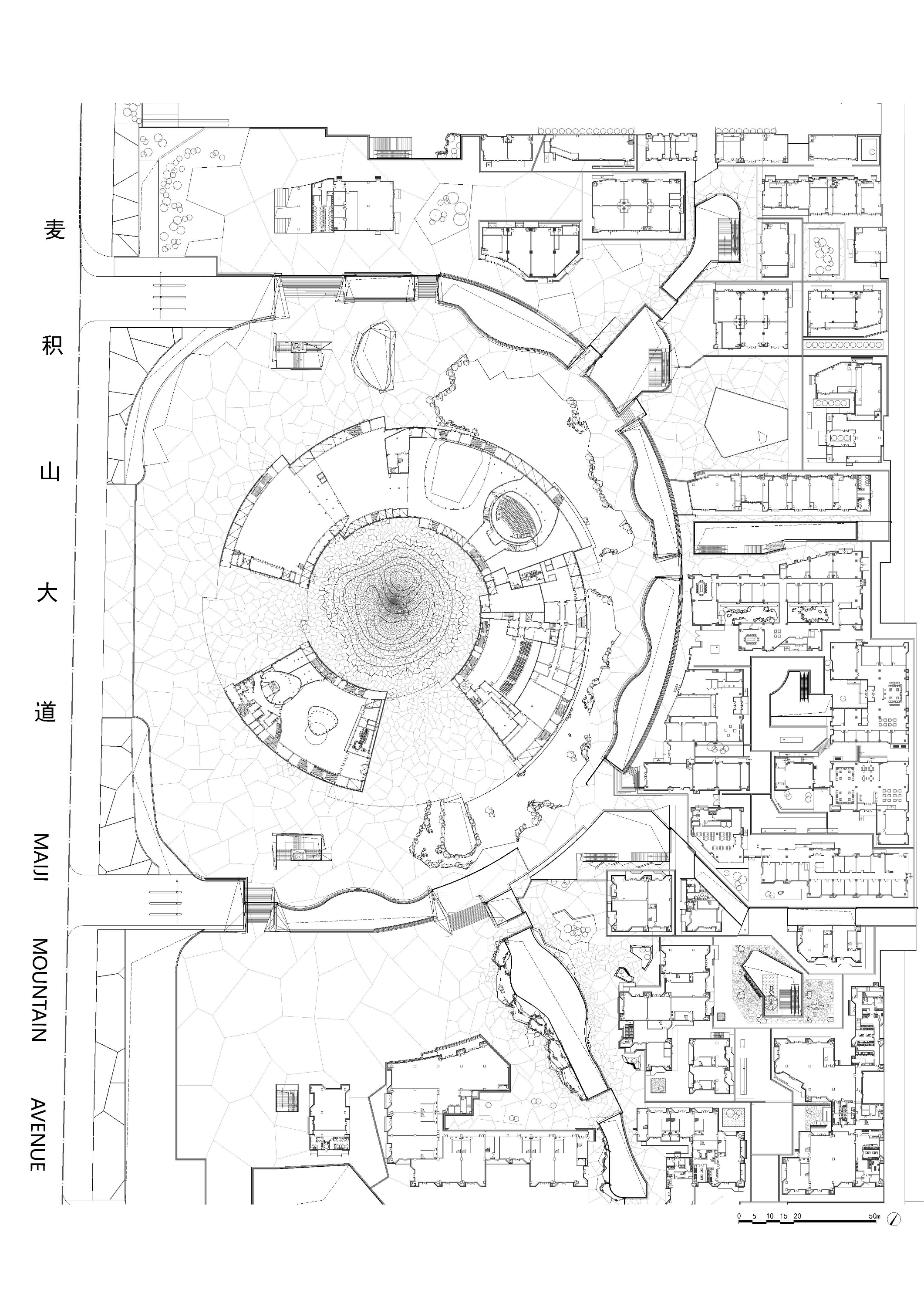 중정에는 마이지산 석굴 벽화 내용을 담은 천장 설치물이 배치되어, 회랑형 경로 위에 시각적 중심을 형성한다. 내부의 완만한 경사로는 각각의 기능 공간을 부드럽게 이어주며, 방문자가 공간을 따라 자연스럽게 이동할 수 있도록 구성되었다. 환형 구조는 방향성과 경계가 없는 형태로, 다양한 문화적 배경을 지닌 방문객이 편안하게 머무를 수 있는 포용적인 공간을 제공한다. 부드러운 곡선 흐름과 회랑형 동선은 외부와 단절된 평온한 분위기를 조성하며, 관람객에게 집중과 휴식을 동시에 제공하는 환경으로 설계되었다.