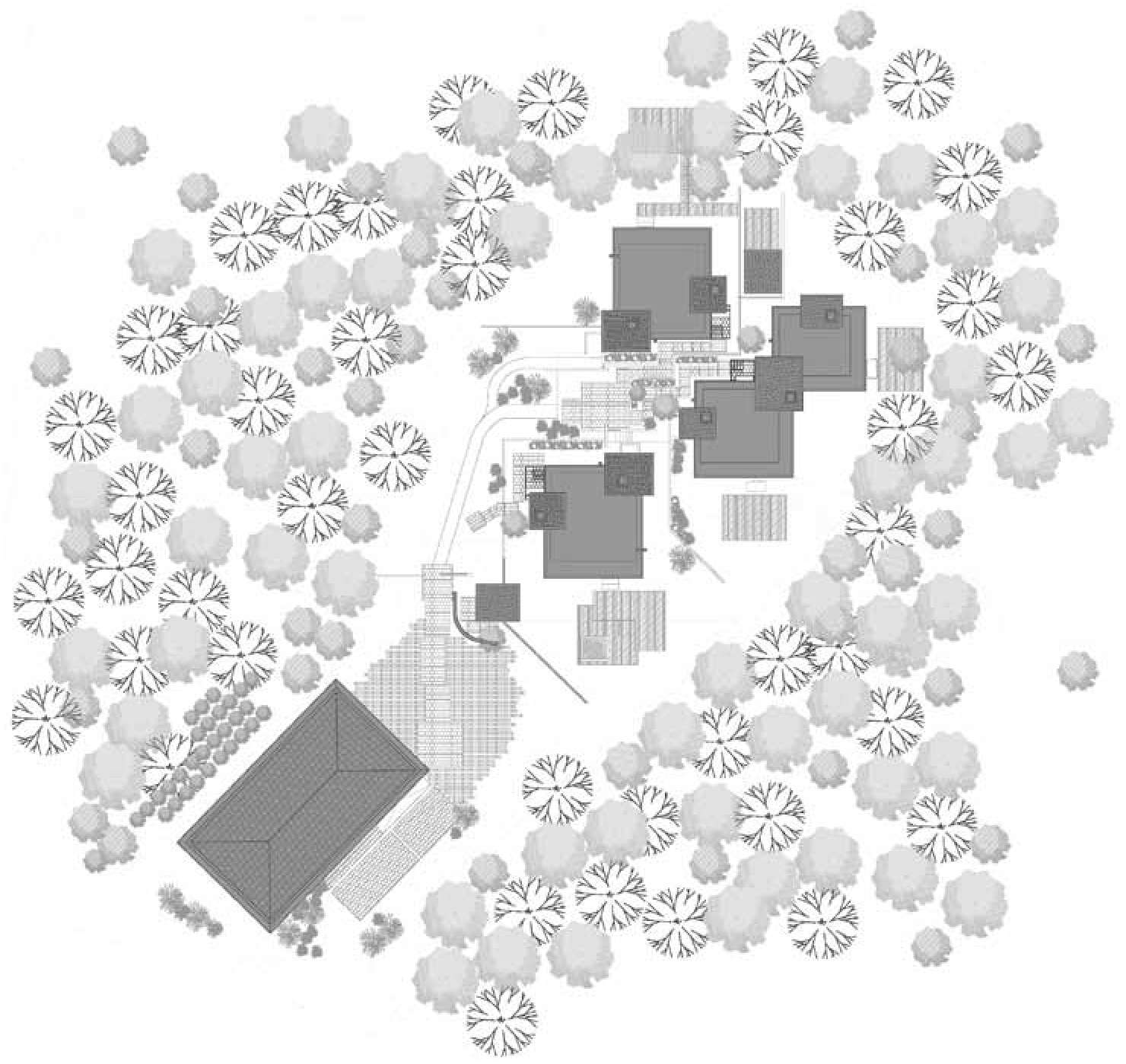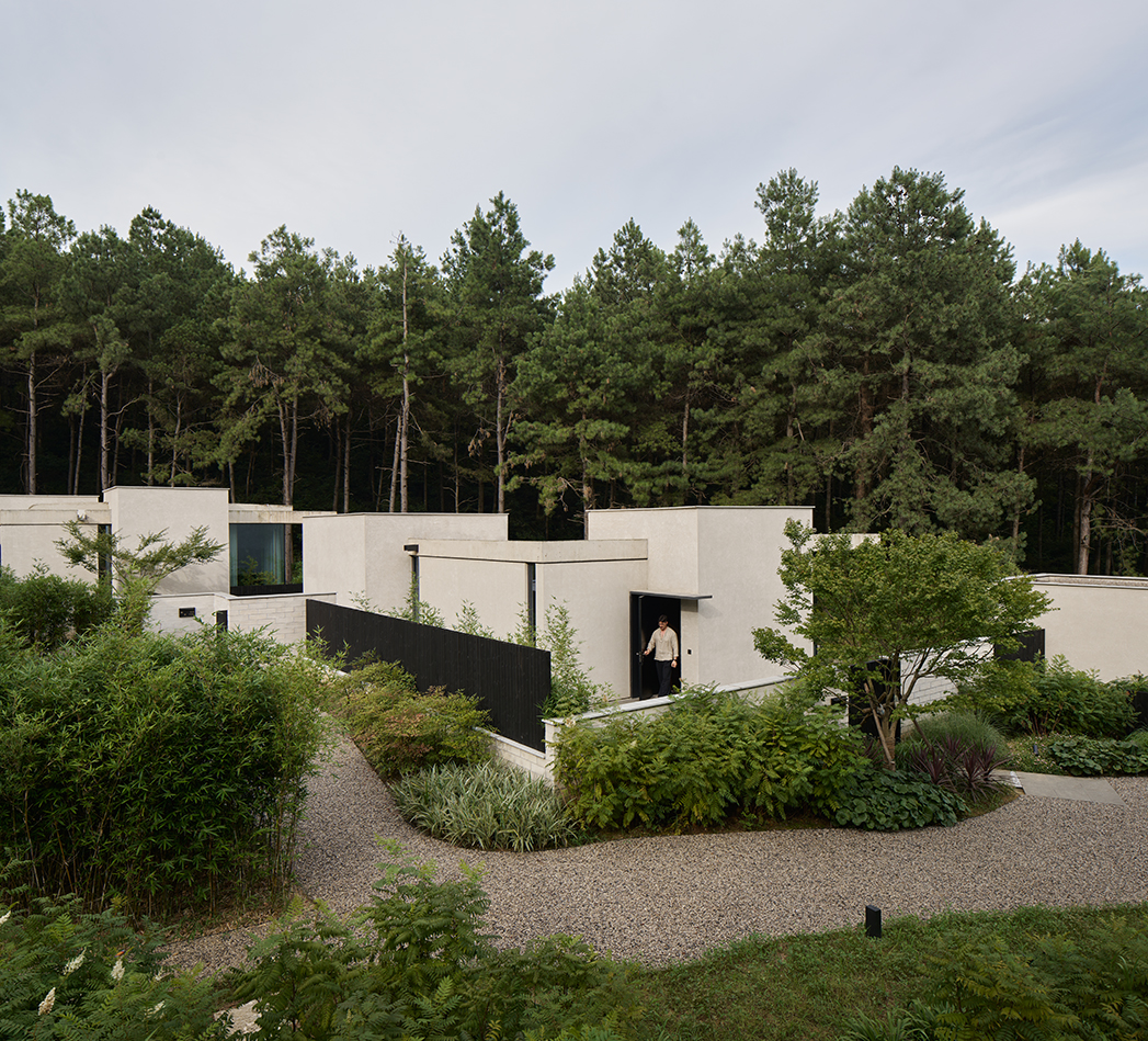 기존의 와인 하우스가 있던 자리에는 버려진 고택이 있었는데, 장소가 지닌 역사를 존중하는 의미에서 기존 건축물의 박공지붕을 유지하고 재해석했다. 와인 하우스에서 객실 구역으로 이어지는 길은 곡선 형태의 대나무 질감 벽을 따라 펼쳐진다.