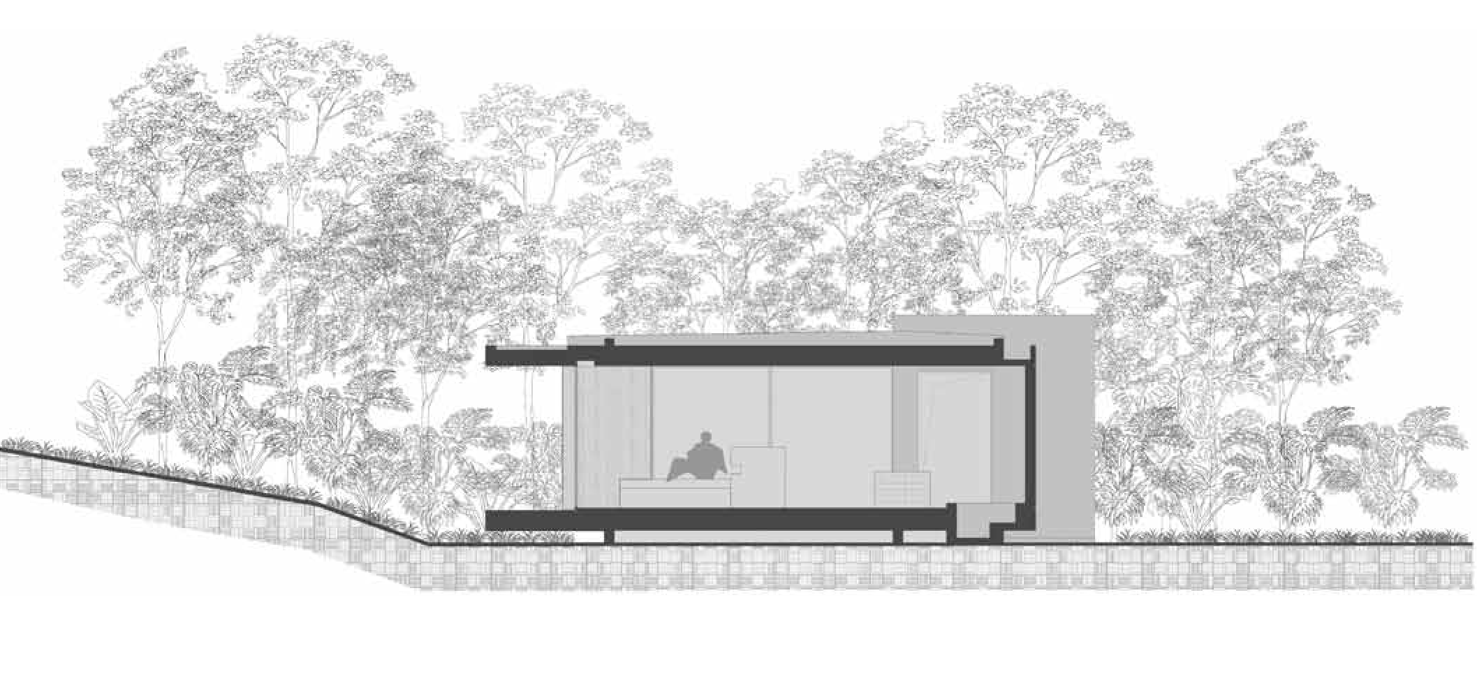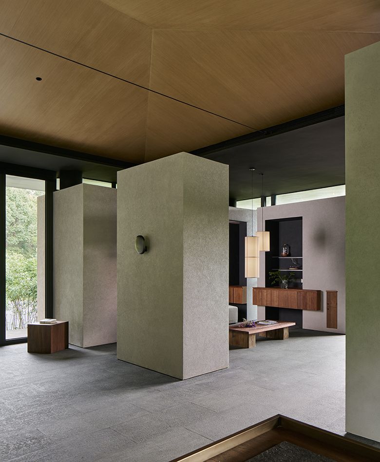 실내와 광장은 유리문을 개방하여 하나로 연결할 수 있으며, 전면부의 유리벽을 통해 탁 트인 전망을 극대화했다. 입구에는 대나무 질감을 살린 콘크리트와 탄화목으로 만든 ‘L’자형 게이트는 반개방형의 라운지에 사적인 분위기를 제공한다. 다이닝 공간은 동북측의 언덕을 향해 배치되어 있어 조용하게 이용할 수 있다.