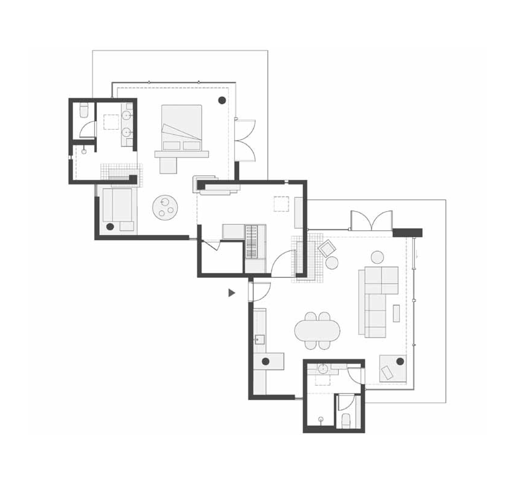 이 길의 끝에는 작은 공용 공간이 있어서 객실로 들어가기 전 잠시 동안 공간의 고요함을 느낄 수 있다. 통로를 지나 객실로 들어서는 순간 시야는 한층 확장된다. 두 개의 콘크리트 슬래브는 계곡을 향해 완전히 열려 있으며, 파노라마 전망과 자연스럽게 연결된다. 각 객실은 세 면이 자연을 향해 열려 있어 고유한 경관을 담아낸다.