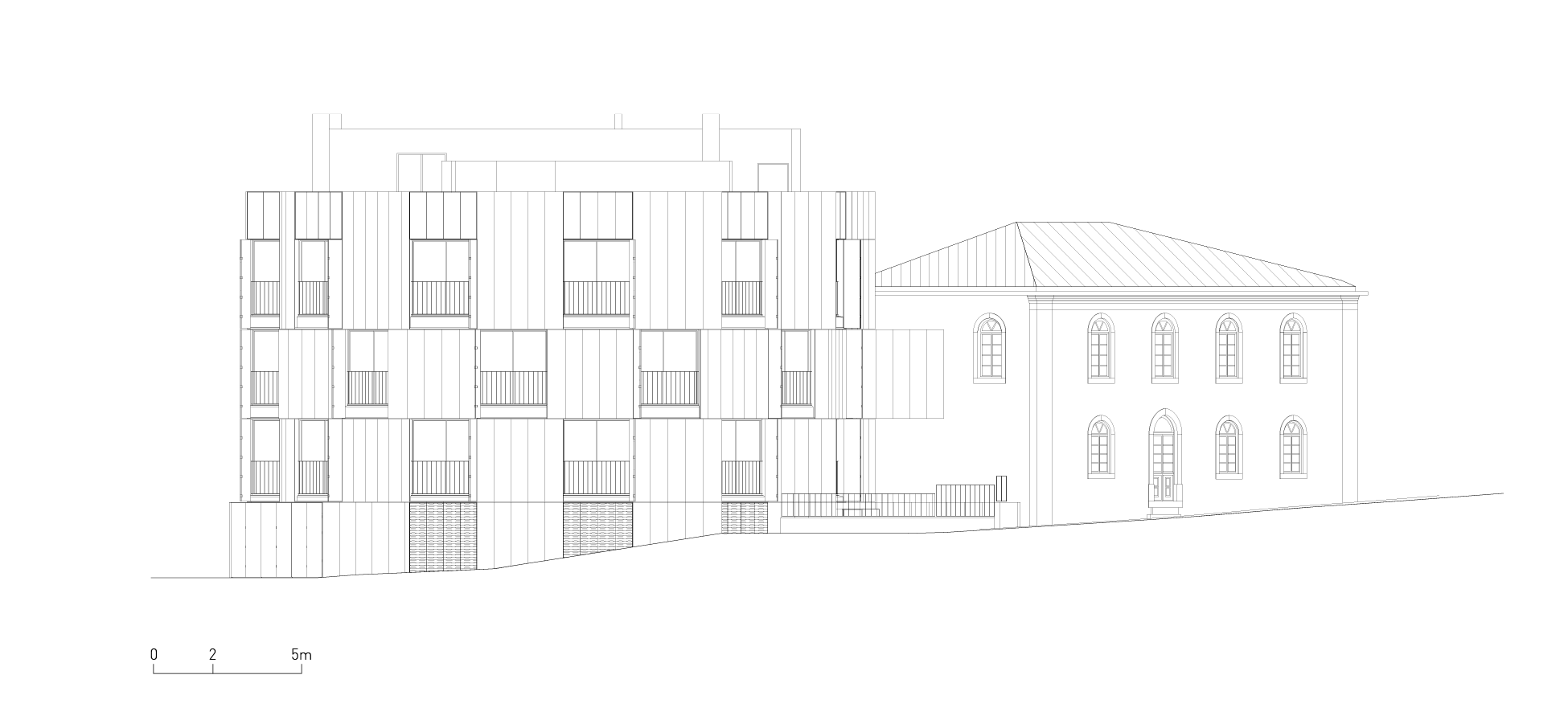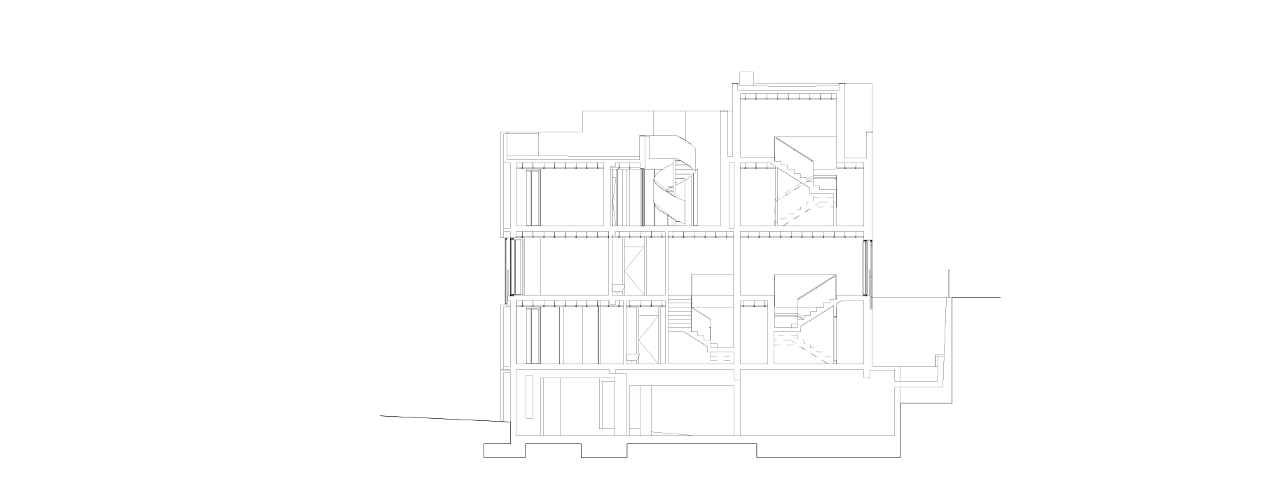 정밀한 기하학적 패턴과 재료적 특성을 지닌 패널형 외관을 통해 대조적인 도시의 풍경을 풀어냈다. 곡선형 건물 배치와 겹겹이 쌓인 콘크리트 패널은 두 상반된 도시 구조를 자연스럽게 연결하는 요소로 작용한다. 기존 건물은 20세기 초에 지어진 작은 주택으로, 기와 지붕과 노란색 외관이 특징적이었다. 새롭게 증축된 부분에는 5개의 아파트가 추가되었으며, 2개의 4베드룸 유닛, 2개의 2베드룸 유닛, 1개의 3베드룸 유닛으로 구성되어 있다. 기존 건물과 새 확장 건물은 공용 계단실을 통해 연결된다. 이러한 설계 덕분에 건물은 끊임없이 변화하며, 햇빛이 곡선형 외관을 따라 이동하면서 다양한 색조와 반사 효과를 만들어낸다. 레이리아 주거 단지는 보호와 개방성 사이의 균형을 모색하며, 현대 도시 주거 공간이 직면한 주요 문제들을 담아낸다.