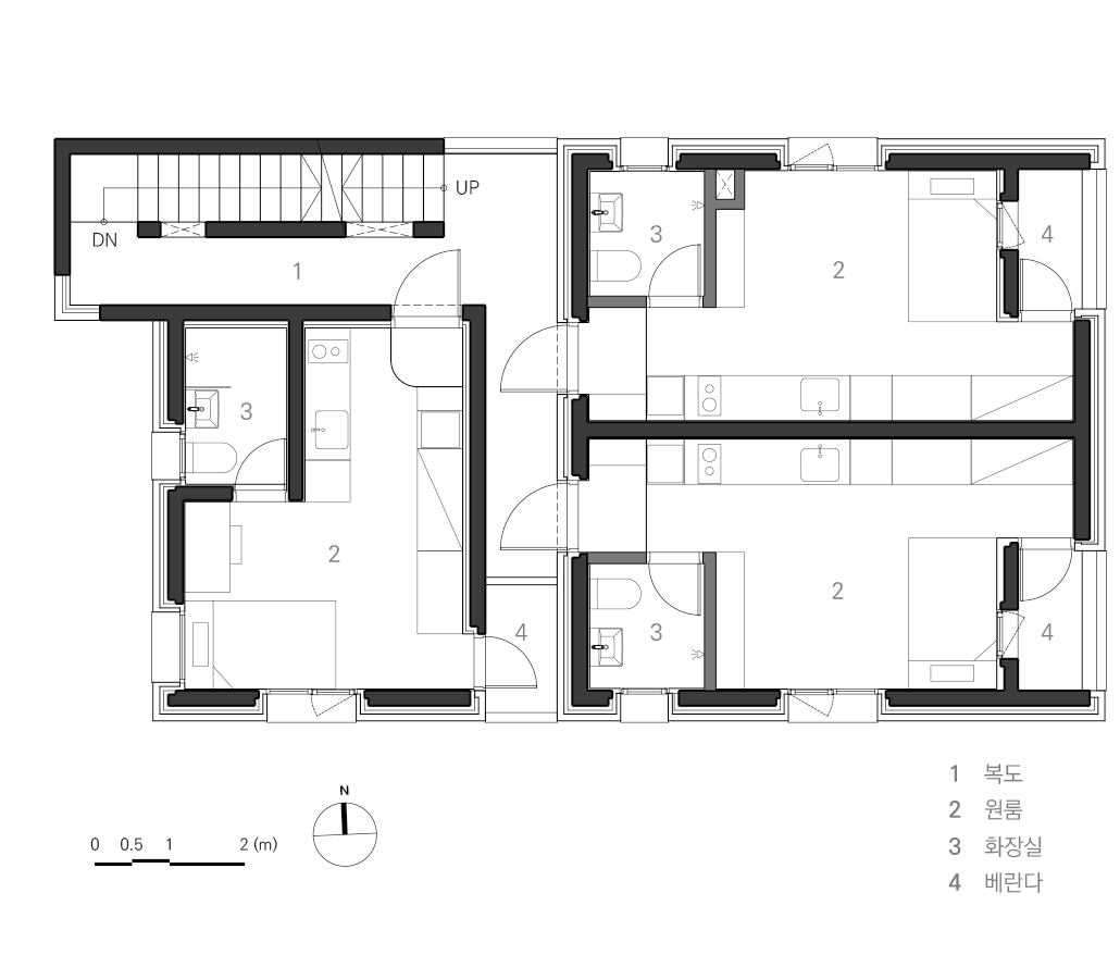 협소한 대지 내에서의 계단실은 최대한 북측으로 배치되어야 했다. 전용면적을 최대한 많이 확보하기 위해 공용부의 내·외부 마감을 유로폼 노출 콘크리트로 처리하여 조금이라도 거주자를 위해 쓰이도록 하였다. 북측의 계단실이 어두컴컴하고 단순히 수직 이동의 목적만으로 사용되지 않도록 적절한 위치에 자유로운 형태의 개구부를 뚫어 채광을 확보하고, 외부와의 시선 주고받음이 가능하도록 하였다. 내력벽 사이의 개구부(Cheese Eyes)는 빛의 관통뿐 아니라 오가는 거주자들이 갑자기 마주쳐 놀라게 되는 상황을 사전에 방지하는 “눈”으로서의 장치이다.
