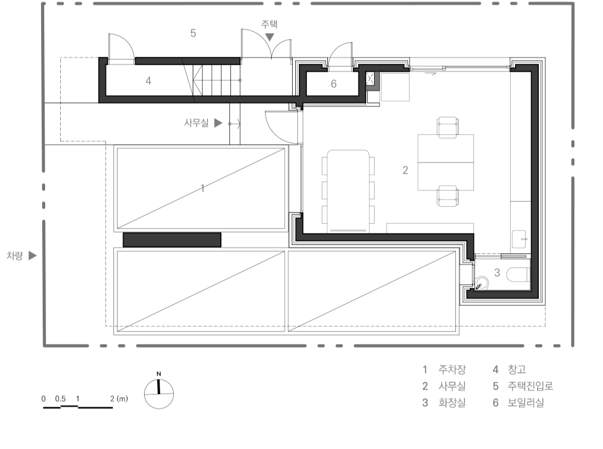 사업대지는 부산시 기장읍 대라리 중에서도 주거지역과 자연녹지지역이 만나는 경계 부근에 위치해 있다. 부산 중심지에서는 꽤 떨어진 곳이지만, 반대로 기장군 전역으로 보면 부산 도심으로 나가기 용이한 위치적 장점 때문에 많은 공장과 창고들이 주거지역과 한데 어우러져 형성되었다. 하지만 동해남부선 기장역이 개통되어 이 일대의 대중교통 환경이 개선되며 거주성이 높아진 데다, 토지가격 상승 등의 이유로 최근 많은 공장과 창고들이 철거되고 다가구, 다세대 주택과 이에 따른 근린생활시설 등이 속속 생겨나고 있다. 이러한 도시 맥락을 충분히 감안하여 작은 규모의 건물이지만 공장과 창고를 대체하는 주거 친화적 분위기의 건축물을 계획하고자 하였다.