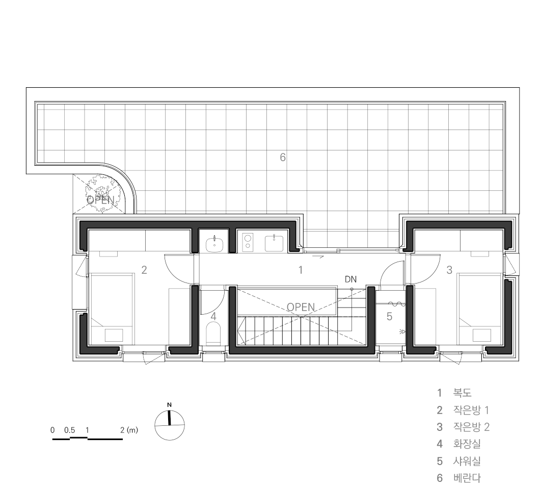 넓지 않은 주택 내에서 공간을 풍성하게 느끼기 위해 시선이 멀리 뻗어나갈 수 있는 동-서 축을 형성하였다. 집 내부로 들어오면 복도를 통한 깊이 있는 공간을 볼 수 있고, 반대로 집을 나갈 때도 현관에 위치한 창을 통해 서측의 먼 곳을 바라볼 수 있다. 이 축을 기준으로 남측에는 밝은 공간이 필요한 안방과 거실, 식탁 등을 배치하였고, 북측에는 기능적인 드레스룸, 화장실, 주방 등을 배치하여 빛에 의해 공간이 좀 더 명확히 규정될 수 있도록 하였다.