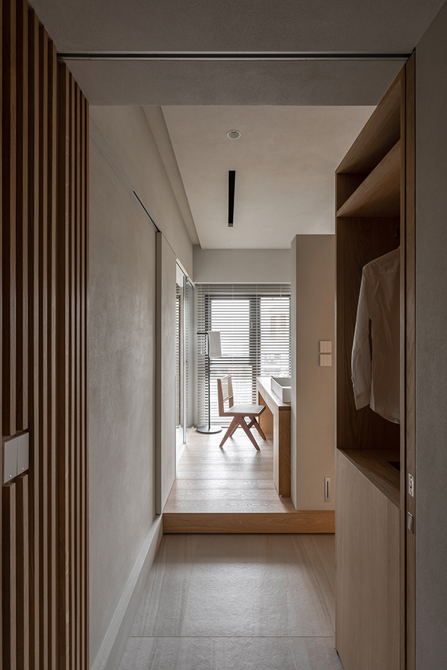 공간 구성 면에서는 서재를 중심에 두고 순환형 동선을 형성해 다른 기능 공간과 연결했다. 안방은 바닥을 단차로 높이고 복도를 직선으로 배치하여 기능 분리를 강화했으며, 동시에 시각적 개방감을 유지했다. 전체 공간은 부드러운 곡선과 따뜻한 색조를 중심으로 구성되었고, 다양한 색상의 조합을 통해 층위를 형성하며 정돈된 분위기를 조성했다.