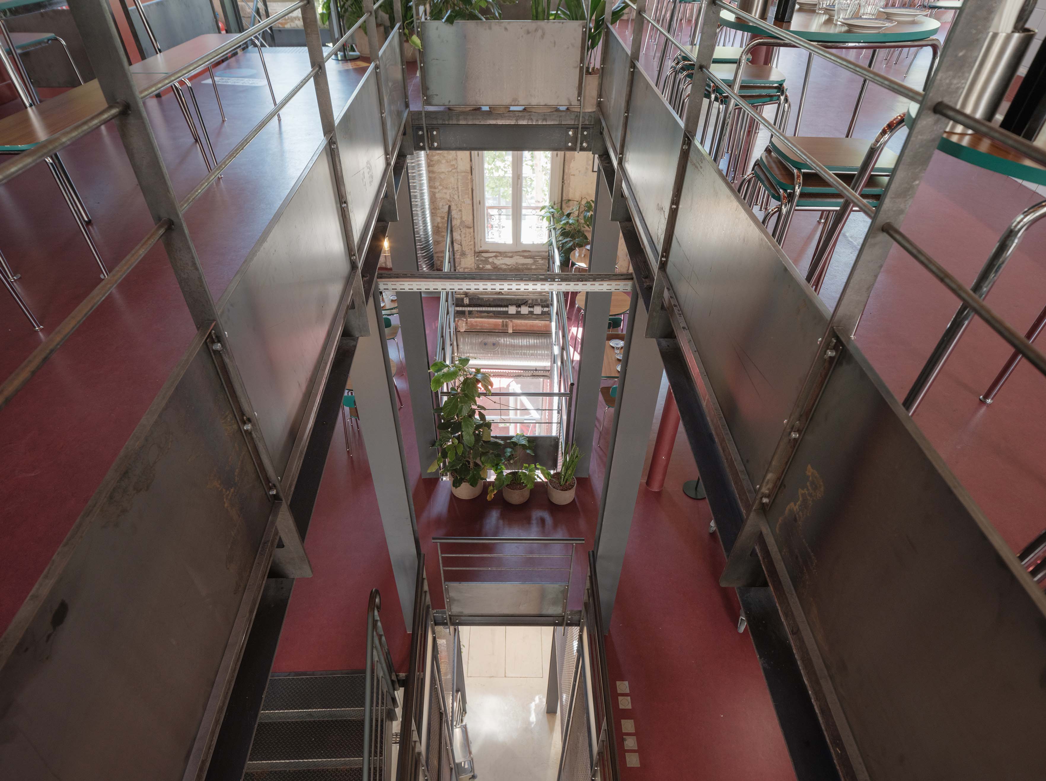 실내는 주방과 식당, 공적 공간과 사적 공간이 유기적으로 연결되며, 방문자가 공간을 따라 걸으며 지역성과 문화적 분위기를 체감할 수 있도록 구성되었다. 마감은 노출 철재, 흰색 사각 타일, 아연 도금 강판, 붉은 리놀륨, 기존 석재 벽 등 다양한 재료를 조합하여 조리 공간과 음식 콘셉트의 투박함과 진정성을 반영했다.