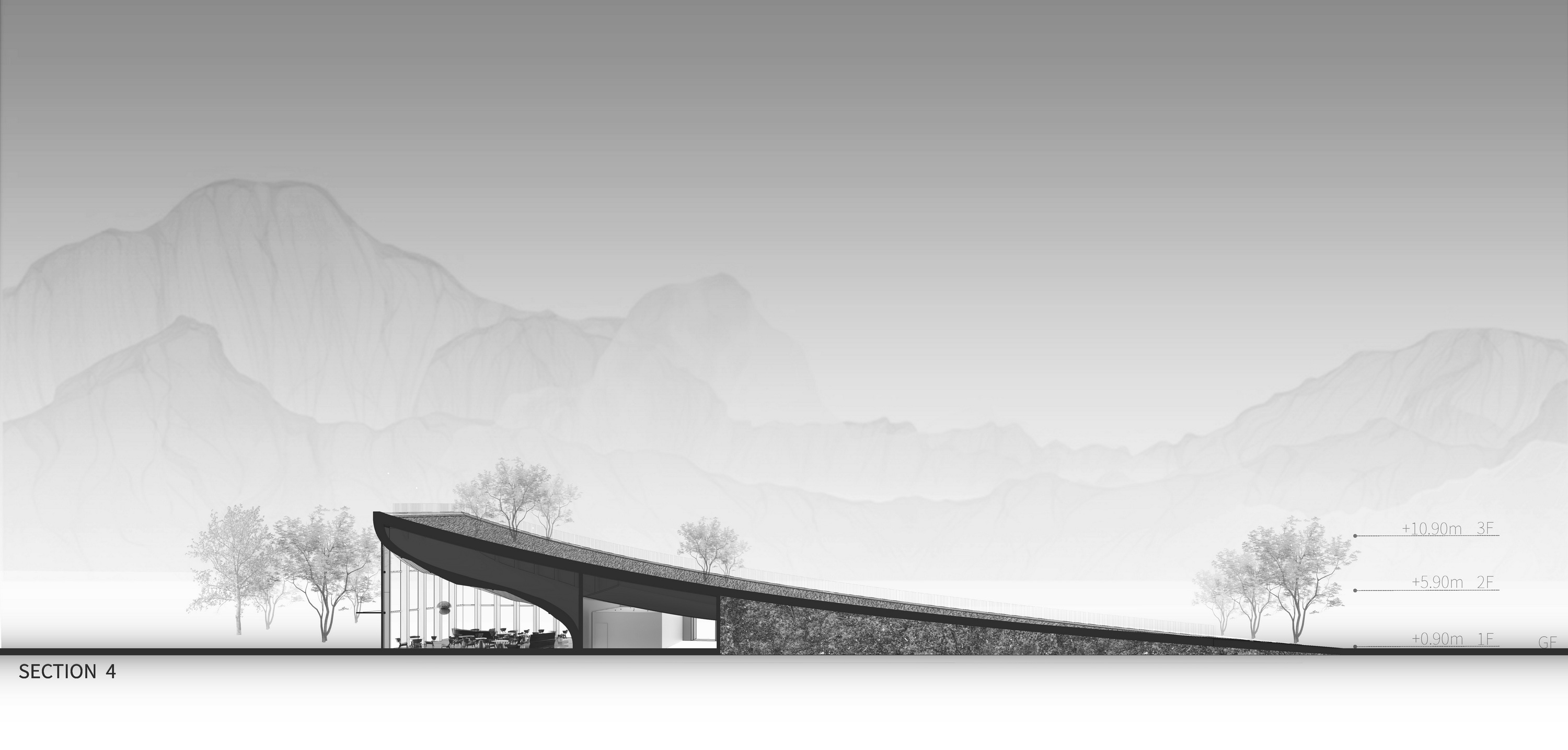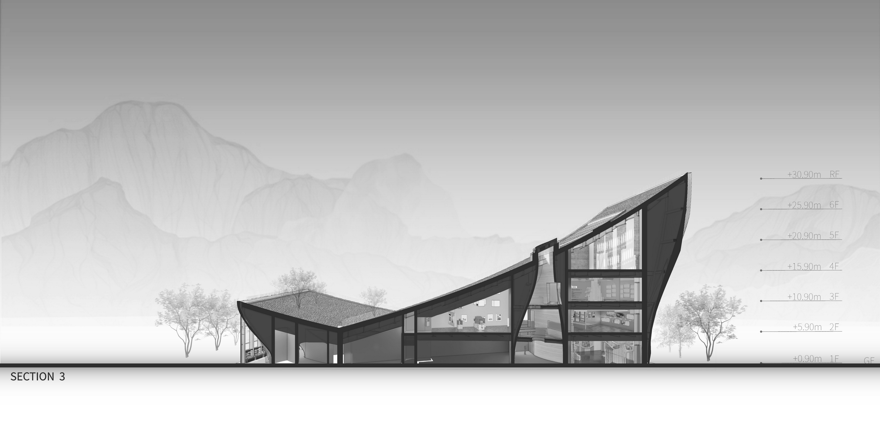 건물의 외벽은 옹벽에서 착안한 접힌 형태의 콘크리트 패널로 구성되어, 낮은 층에서는 땅에 밀착되고, 진입부에서는 유리 커튼월과 결합되어 실내 공간을 형성한다.