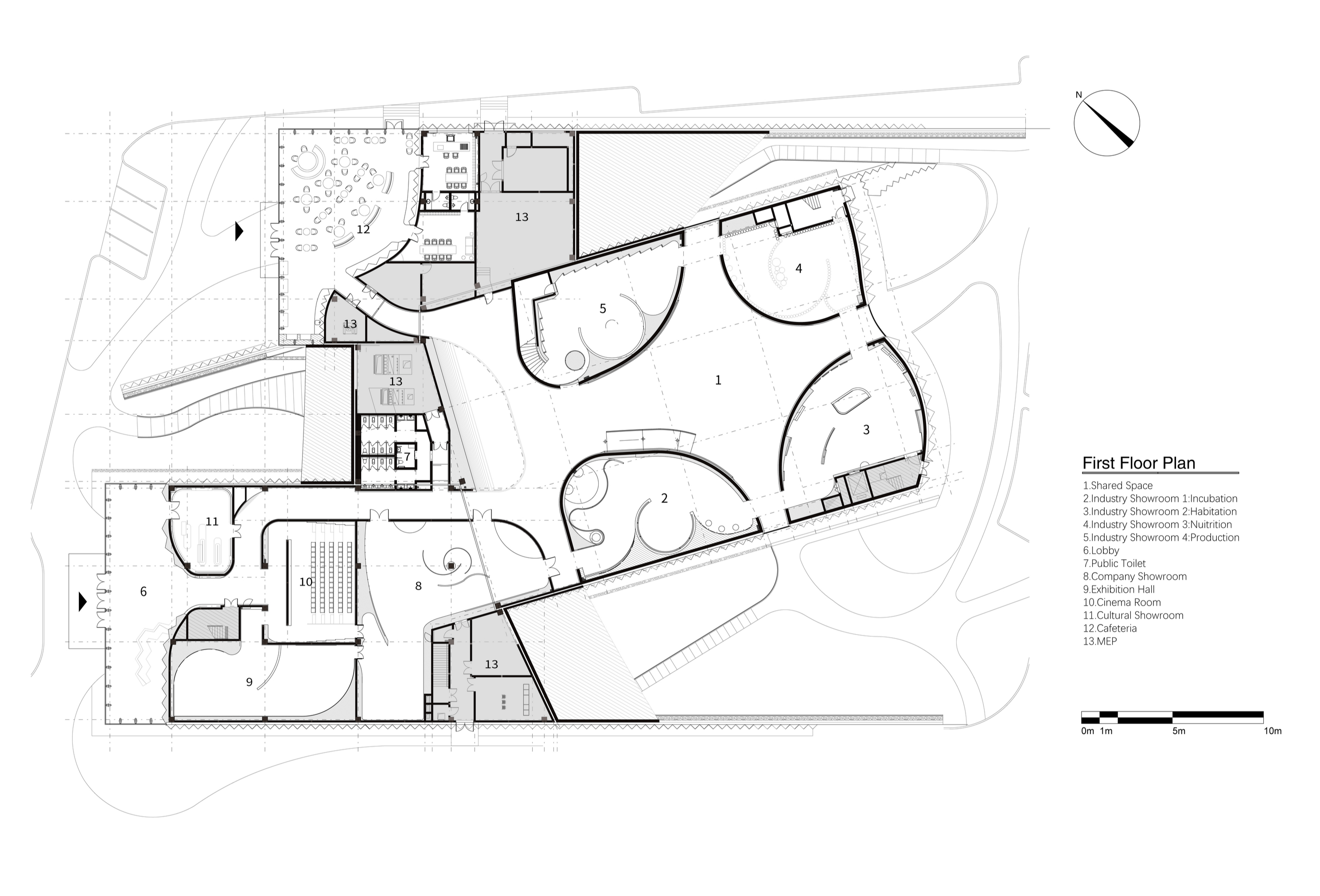 주요 전시 공간은 직경 25m의 원형 전단벽 네 개로 구성된 실린더 구조로 이루어져, 이 구조가 전시공간과 수직 동선을 포함하고, 그 사이에는 높이 30m의 아트리움이 형성된다. 이 구조는 기둥 없는 전시 동선을 확보하며, 천창과 루버를 통해 자연광을 유입시킨다. 건물은 열대 몬순 기후에 대응하기 위해 경사지붕 배수, 두꺼운 토양층 지붕, 폐쇄형 전시구역과 북측 개방부를 조합한 방식으로 열과 습기를 조절하며, 기계 설비는 지붕 아래 숨겨진 층에 배치되어 외관과의 간섭을 최소화했다. 완공 이후 이 전시관은 낮에는 산업 박물관, 밤에는 시민들이 지붕 위에서 별을 보고 산책하는 공공 공간으로 기능하며, 지역의 일상에 깊숙이 녹아든 복합 문화시설로 자리 잡고 있다.