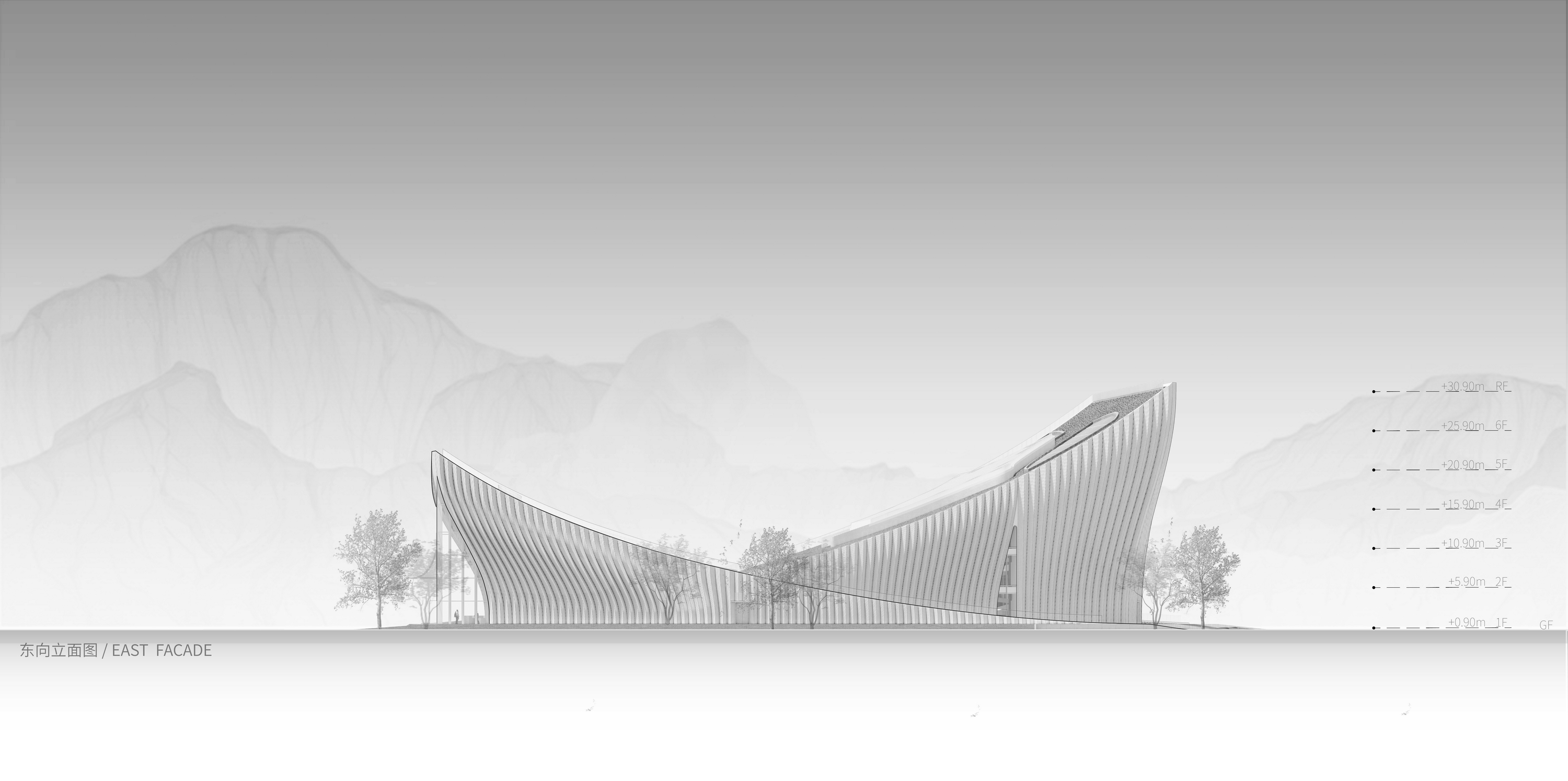 건물은 유려한 곡선의 세 지붕으로 구성되며, 이는 무이산맥의 능선을 모티프로 설계된 조경형 지붕이다. 각 지붕은 땅에서 솟아오르는 듯한 형태로 구성되어 건물 내부에는 전시관, 로비, 레스토랑 등이 배치된다. 지붕의 최대 경사는 45도로, 식재가 가능하며 보행도 허용되어 주변 산세와 강을 조망할 수 있는 데크로 활용된다.