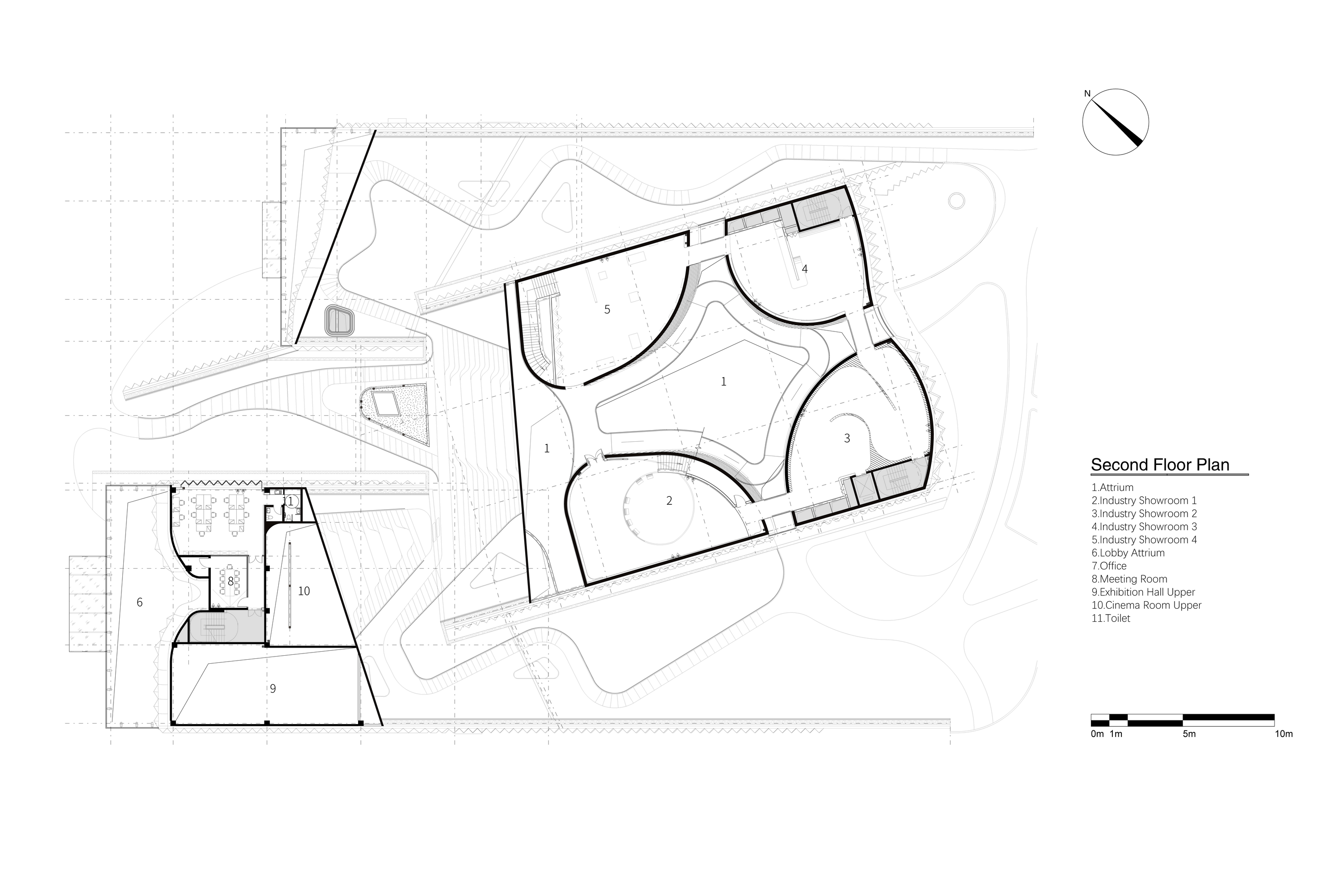 주요 전시 공간은 직경 25m의 원형 전단벽 네 개로 구성된 실린더 구조로 이루어져, 이 구조가 전시공간과 수직 동선을 포함하고, 그 사이에는 높이 30m의 아트리움이 형성된다. 이 구조는 기둥 없는 전시 동선을 확보하며, 천창과 루버를 통해 자연광을 유입시킨다. 건물은 열대 몬순 기후에 대응하기 위해 경사지붕 배수, 두꺼운 토양층 지붕, 폐쇄형 전시구역과 북측 개방부를 조합한 방식으로 열과 습기를 조절하며, 기계 설비는 지붕 아래 숨겨진 층에 배치되어 외관과의 간섭을 최소화했다. 완공 이후 이 전시관은 낮에는 산업 박물관, 밤에는 시민들이 지붕 위에서 별을 보고 산책하는 공공 공간으로 기능하며, 지역의 일상에 깊숙이 녹아든 복합 문화시설로 자리 잡고 있다.