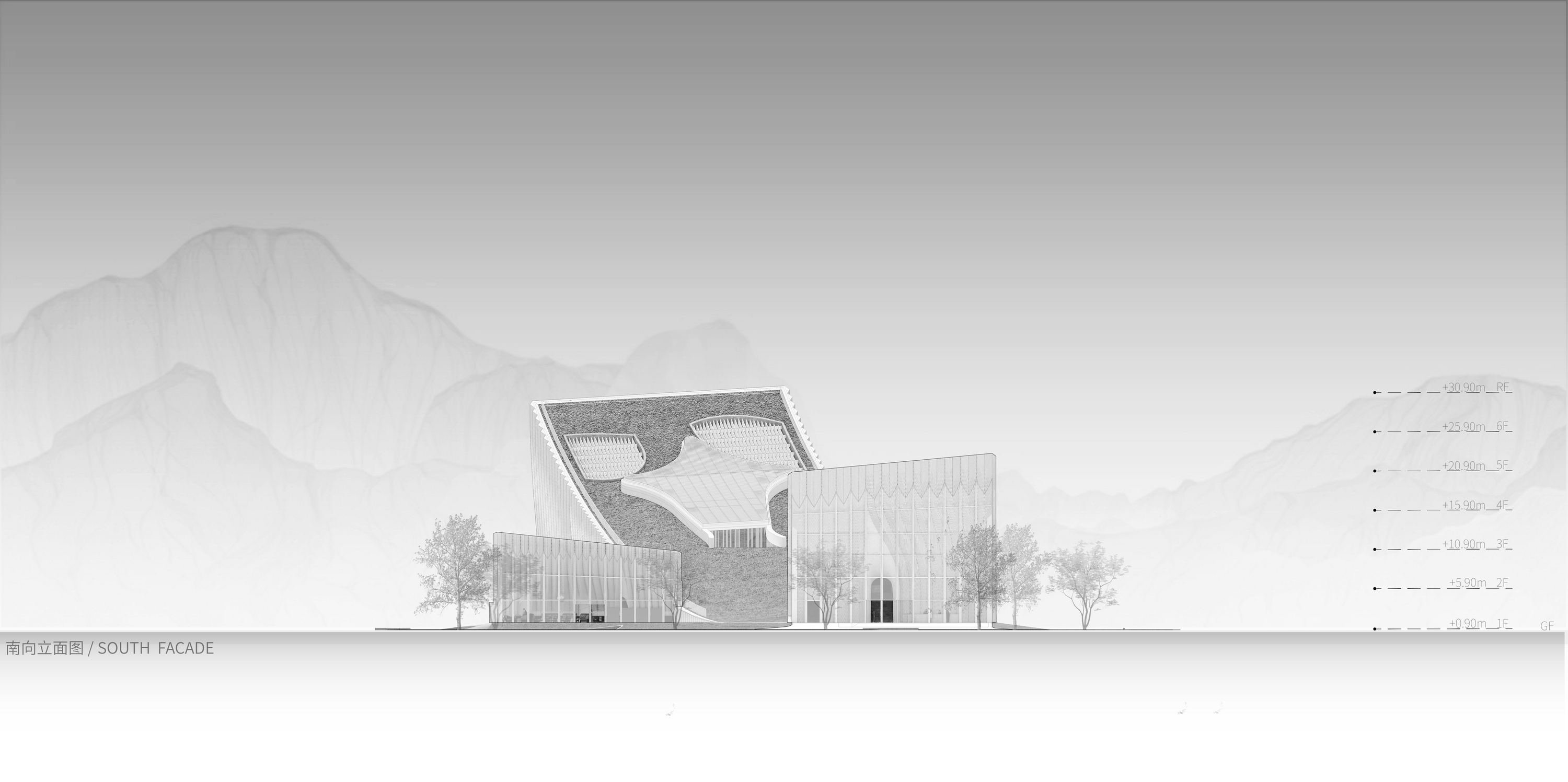 건물은 유려한 곡선의 세 지붕으로 구성되며, 이는 무이산맥의 능선을 모티프로 설계된 조경형 지붕이다. 각 지붕은 땅에서 솟아오르는 듯한 형태로 구성되어 건물 내부에는 전시관, 로비, 레스토랑 등이 배치된다. 지붕의 최대 경사는 45도로, 식재가 가능하며 보행도 허용되어 주변 산세와 강을 조망할 수 있는 데크로 활용된다.