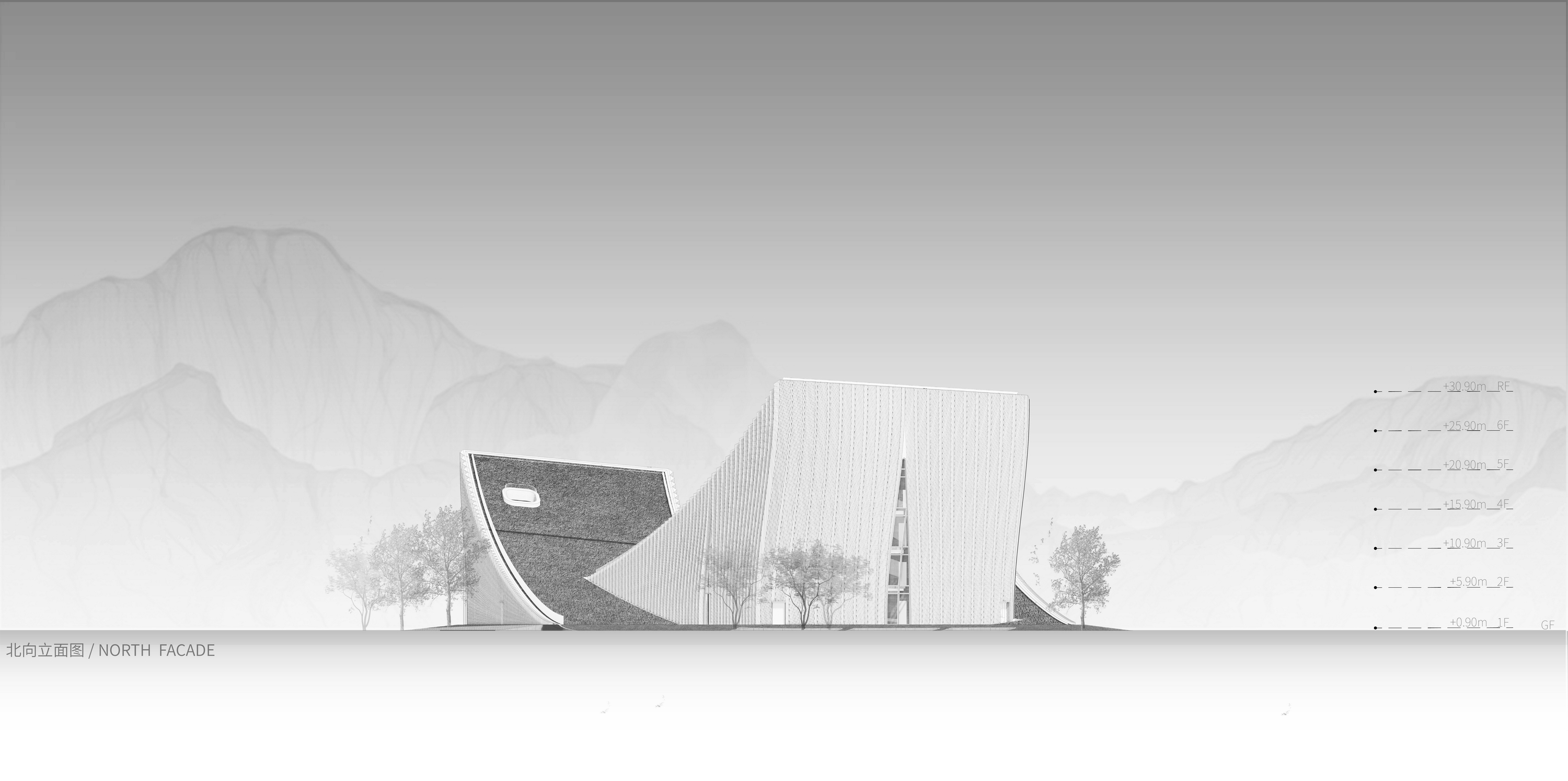 건물의 외벽은 옹벽에서 착안한 접힌 형태의 콘크리트 패널로 구성되어, 낮은 층에서는 땅에 밀착되고, 진입부에서는 유리 커튼월과 결합되어 실내 공간을 형성한다.