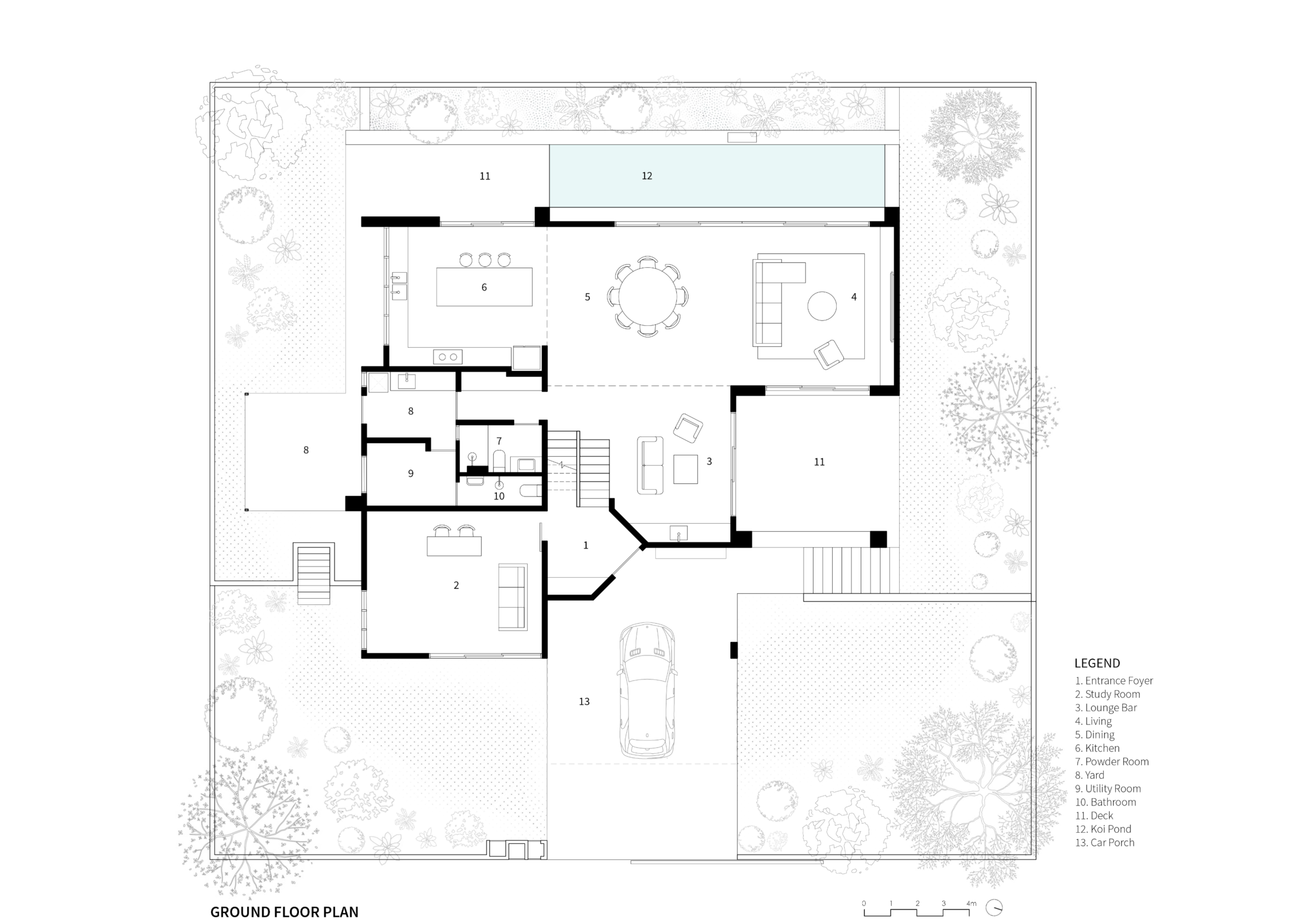 현관을 지나면 원래 거실이었던 하층 공간이 서재로 변경되었고, 상층으로 올라가면 후면부가 확장되어 연못을 바라보는 이중 높이의 거실과 식당 공간이 새롭게 조성되었다. 그 위에는 암석 정원과 식재대가 배치되었으며, 여기서 시작된 수벽이 데크의 벤치 구조로 이어진다.