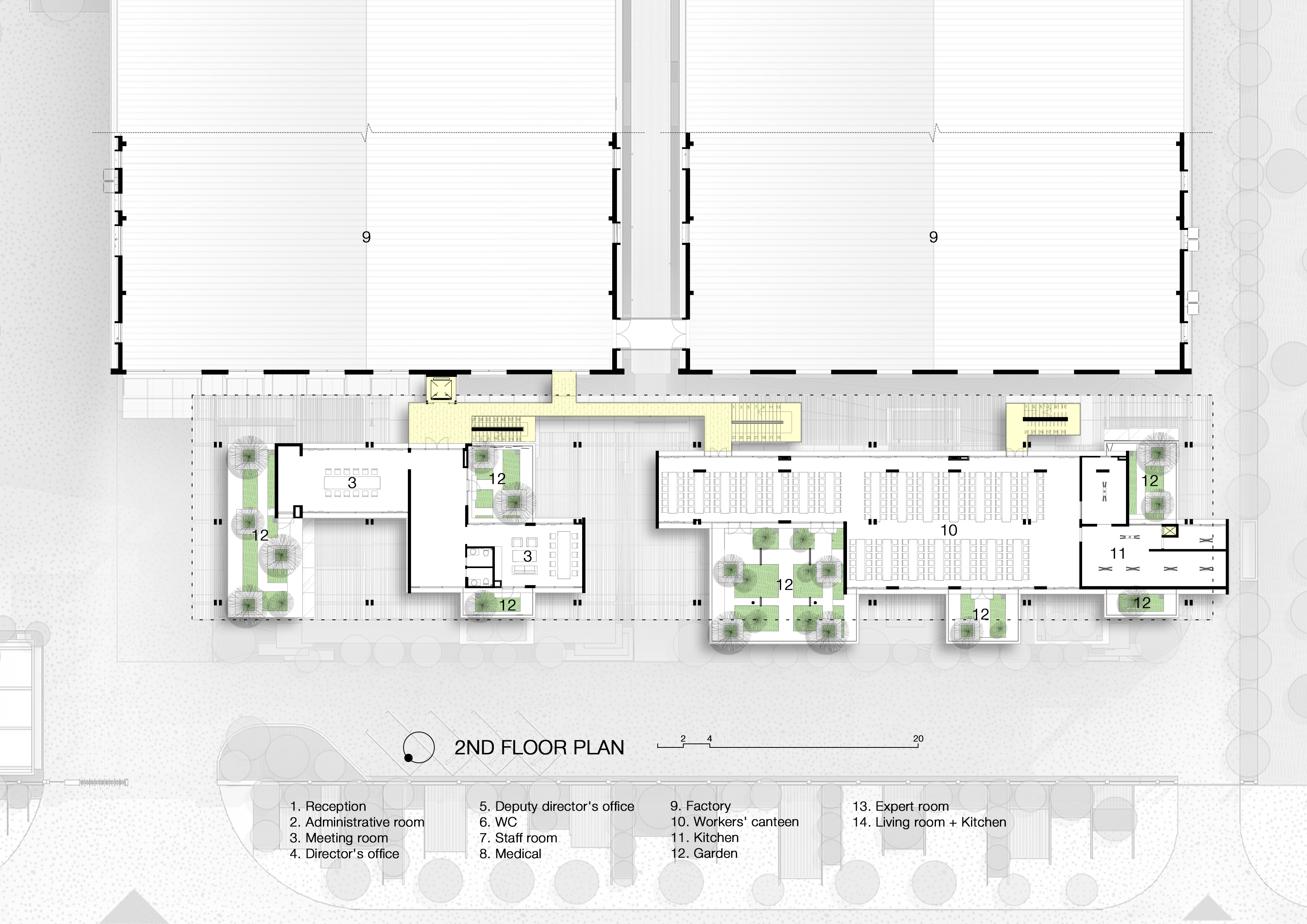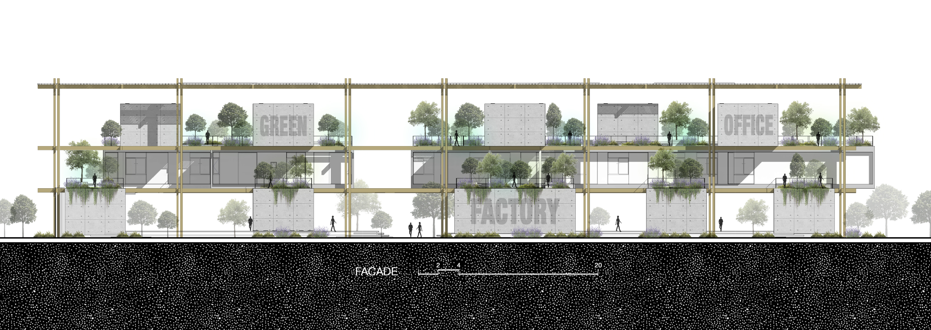 텍스타일 팩토리 오피스는 의류 제조 공장 내에 조성된 사무공간으로, 국가를 대표하는 산업 지구 중 하나에 위치한다. 이 지역은 24시간 운영되며 지역 사회에 일자리를 제공하는 중요한 역할을 하고 있다. 그러나 대규모 노동력을 수용해야 하는 여건 속에서 근무 환경과 공간의 질은 오랫동안 최소한의 수준에 머물러 있었다. 이 프로젝트는 기존 산업 시설의 틀을 넘어, 공장 내 사무공간의 가능성을 새롭게 정의한다. 사용자의 경험을 중심에 두고, 기능적 요구를 충족함과 동시에 몸과 마음을 고양시키는 환경을 제안한다. 산업 생산의 단조로운 흐름 속에서도 자연과 연결되고, 영감을 주며, 치유와 회복이 가능한 장소로서의 사무공간을 지향한다.