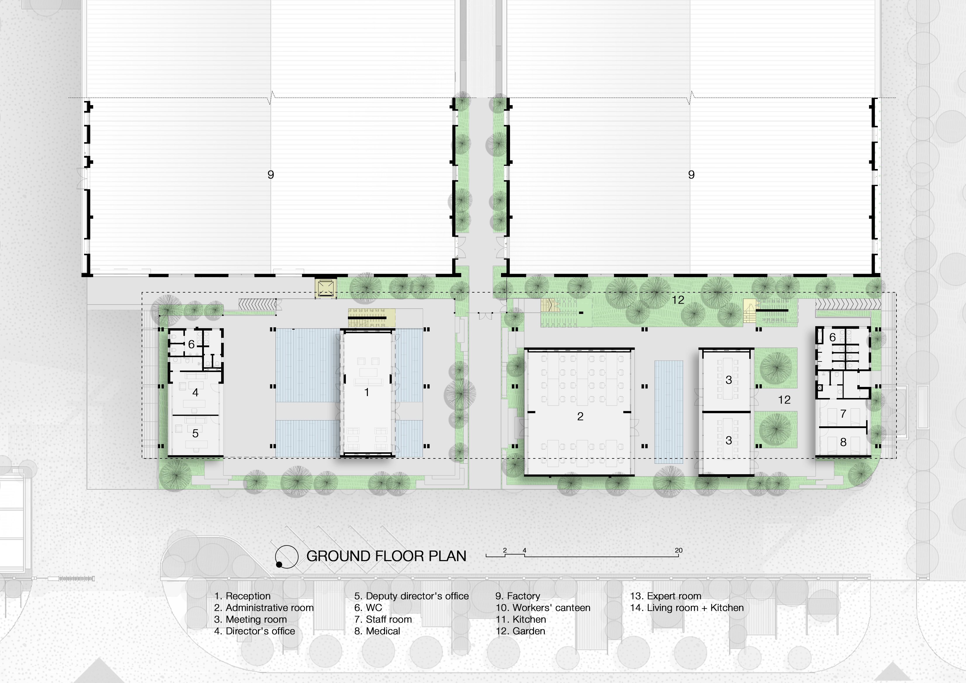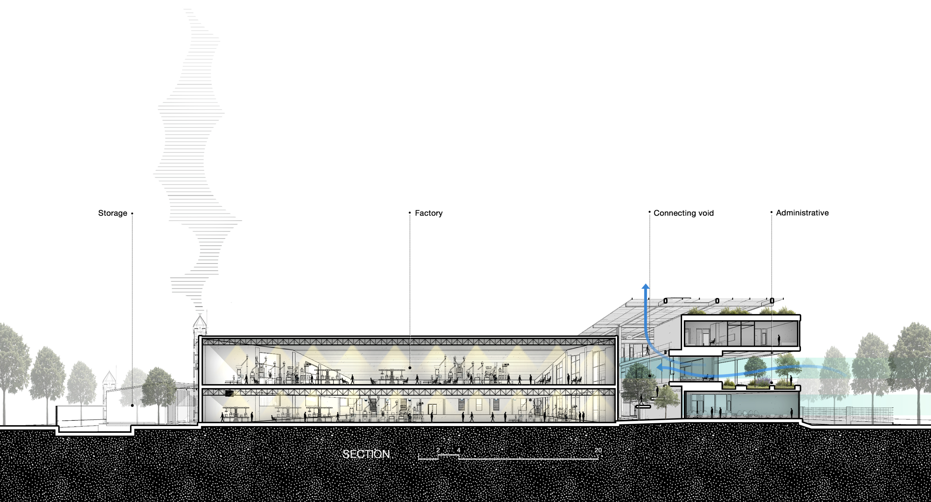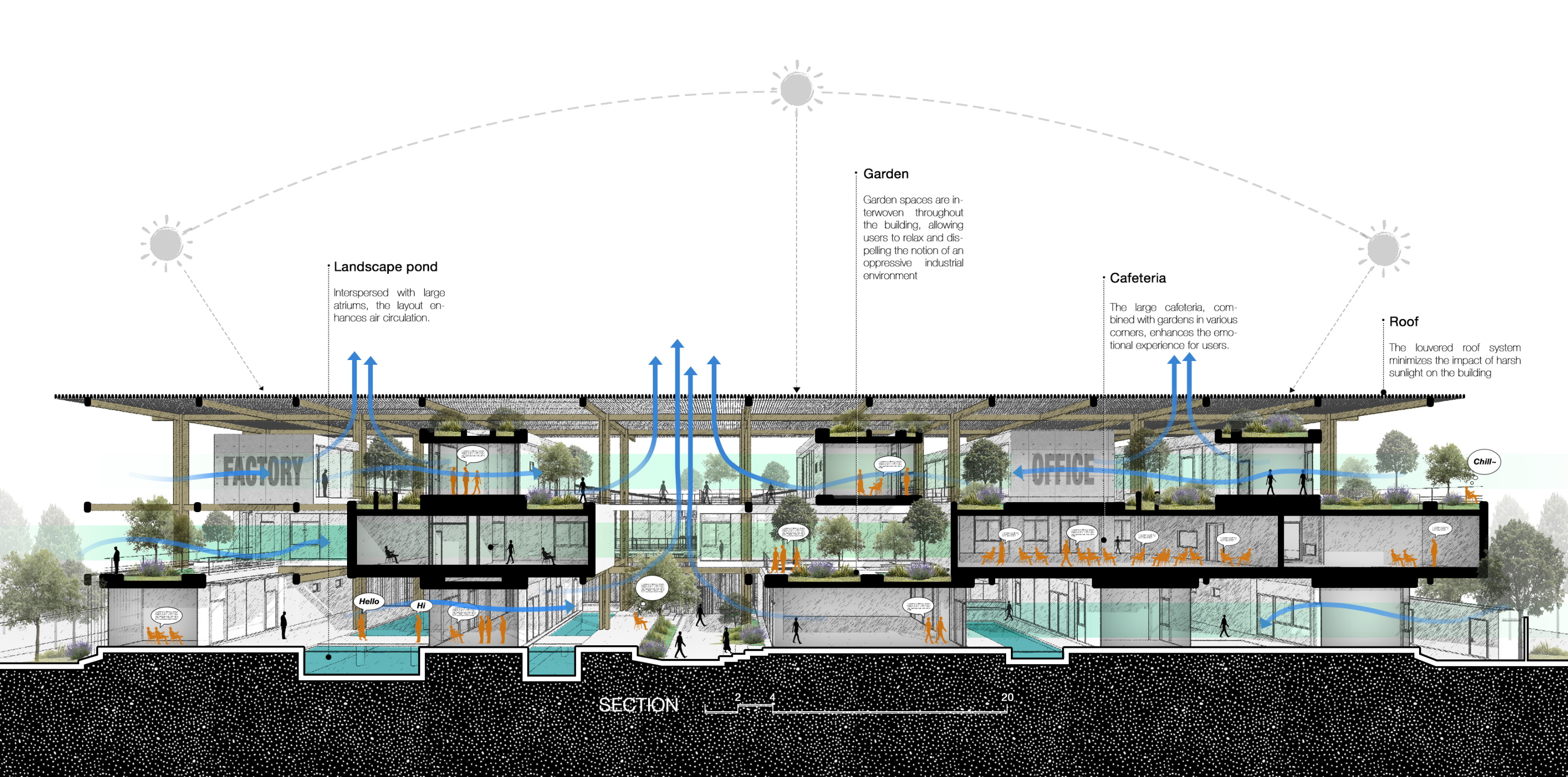 텍스타일 팩토리 오피스는 의류 제조 공장 내에 조성된 사무공간으로, 국가를 대표하는 산업 지구 중 하나에 위치한다. 이 지역은 24시간 운영되며 지역 사회에 일자리를 제공하는 중요한 역할을 하고 있다. 그러나 대규모 노동력을 수용해야 하는 여건 속에서 근무 환경과 공간의 질은 오랫동안 최소한의 수준에 머물러 있었다. 이 프로젝트는 기존 산업 시설의 틀을 넘어, 공장 내 사무공간의 가능성을 새롭게 정의한다. 사용자의 경험을 중심에 두고, 기능적 요구를 충족함과 동시에 몸과 마음을 고양시키는 환경을 제안한다. 산업 생산의 단조로운 흐름 속에서도 자연과 연결되고, 영감을 주며, 치유와 회복이 가능한 장소로서의 사무공간을 지향한다.