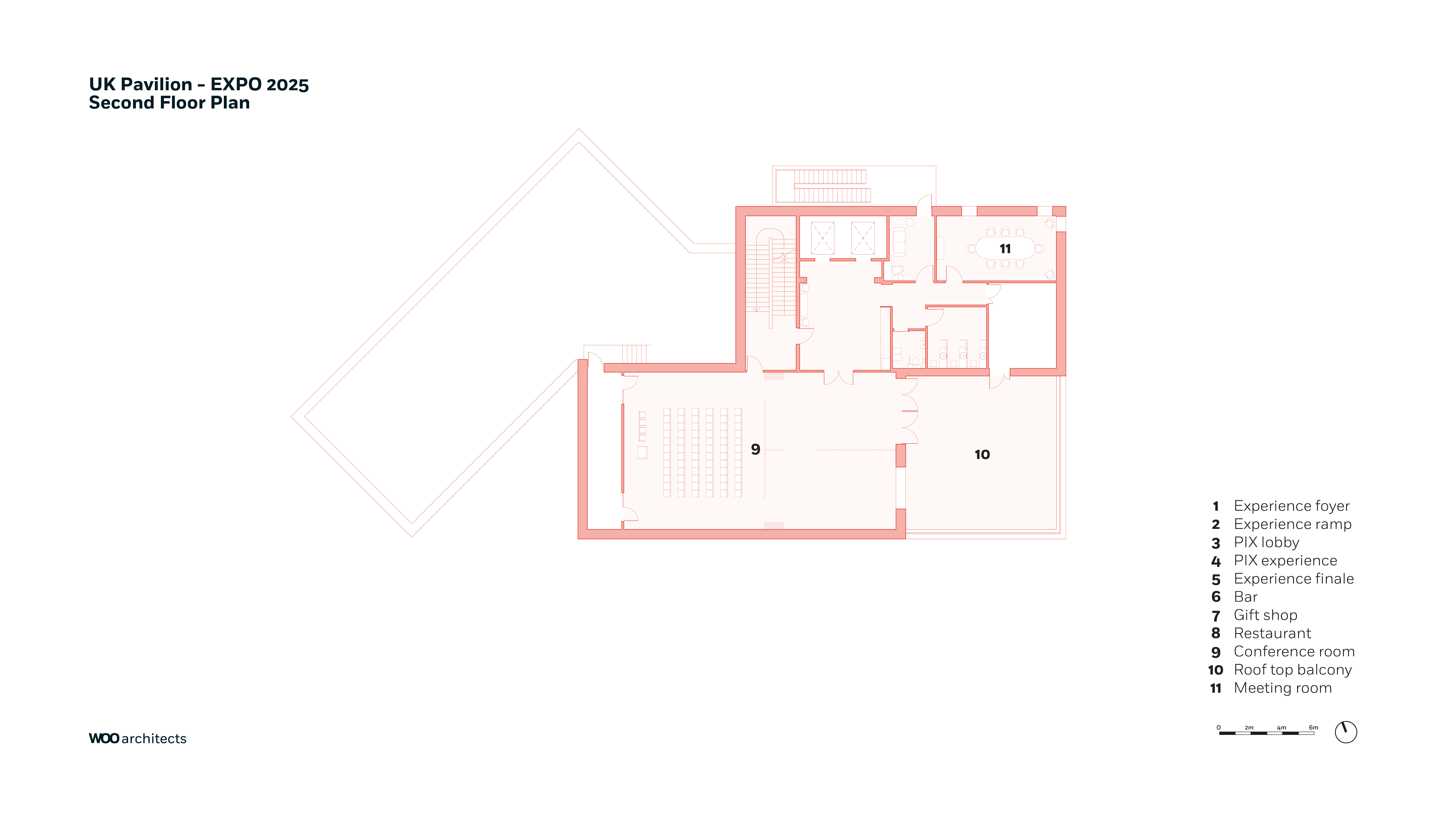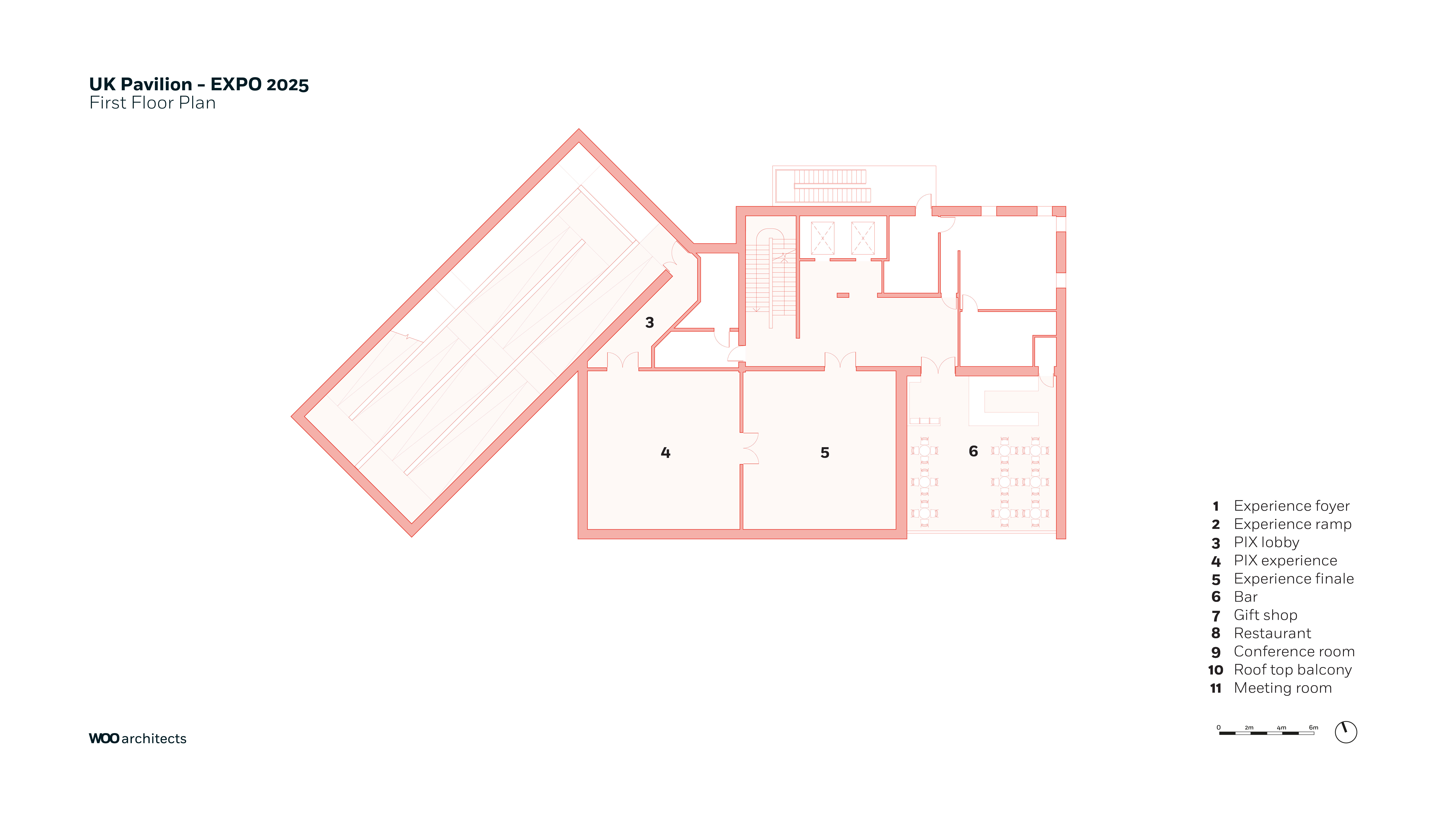 건물은 10×10m 모듈이 반복되는 구조로 구성되어 있으며, 엑스포 종료 후 재사용될 수 있도록 설계되었다. 내부는 전시 갤러리, 기프트숍, 컨퍼런스 공간, 티룸, 루프탑 바 등으로 나뉘며, 모든 공간이 유기적으로 연결된다. 전시의 중심에는 ‘Come Build the Future’라는 테마 전시가있어, 약 20분간 이어지는 여정 속에서 영국의 창의적 문화와 기술이 소개된다. 1층은 외부 정원과 자연스럽게 연결되어 방문객이 자유롭게 드나들 수 있도록 구성되어 있다.