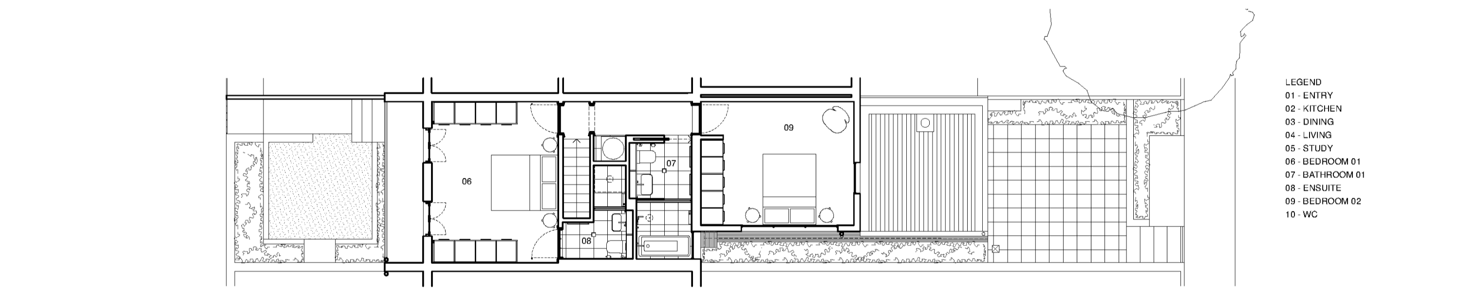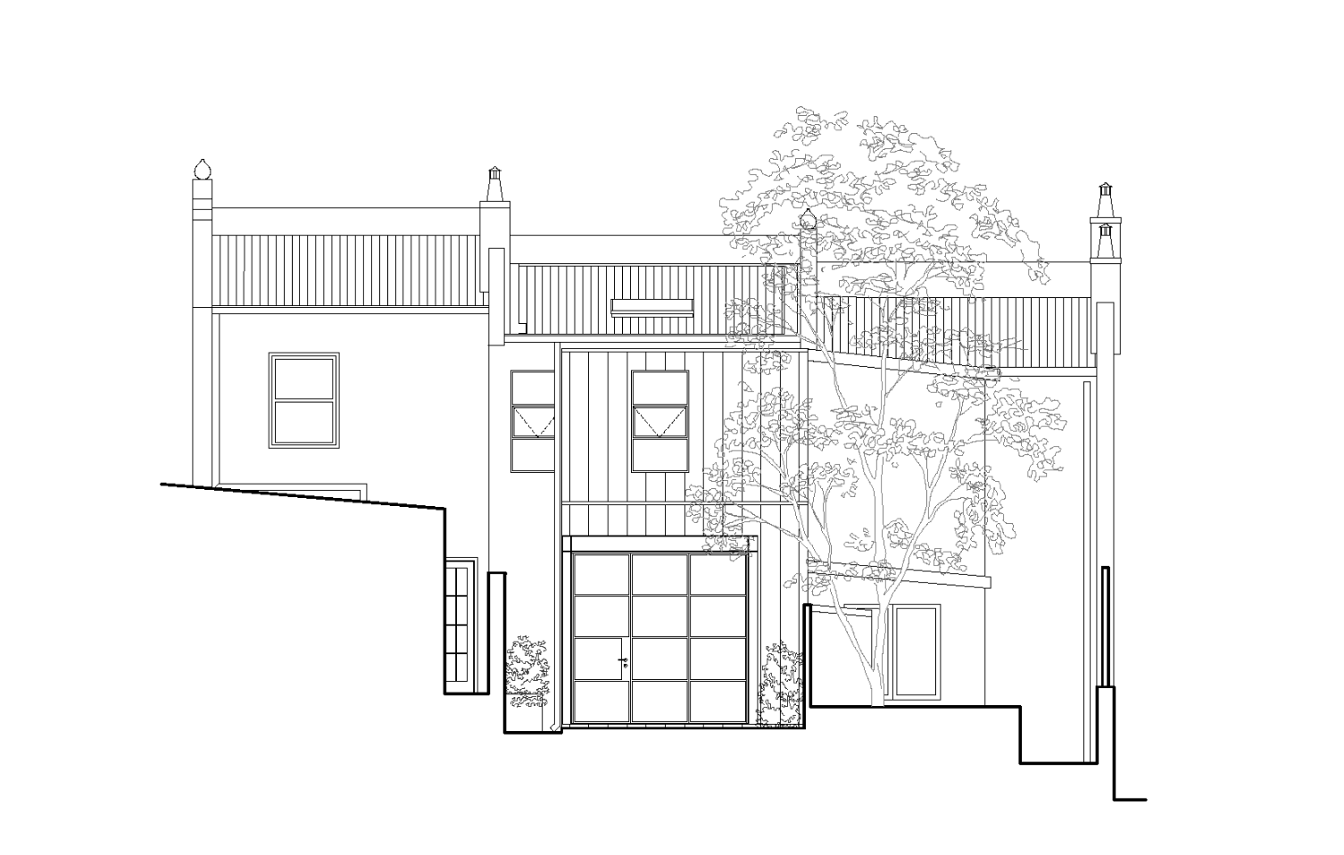이 프로젝트는 6채의 동일한 빅토리아풍 테라스 하우스 중 한 채를 리모델링하고 증축한 작업이다. 상부에는 두 개의 원래 침실 사이를 가로지르는 계단이 있어, 하층의 전면 두 방을 열어 거실과 식당으로 통합하기 어려웠다. 따라서 거실 공간을 새로 확장하는 대신, 뒷부분에 증축을 통해 새로운 생활 공간을 확보하기로 했다. 기존에 부엌과 세탁실이 있던 후면 증축부는 마당과의 연결이 부족해 철거되었고, 그 자리에 2층에 침실이 포함된 새로운 증축부가 세워졌다.