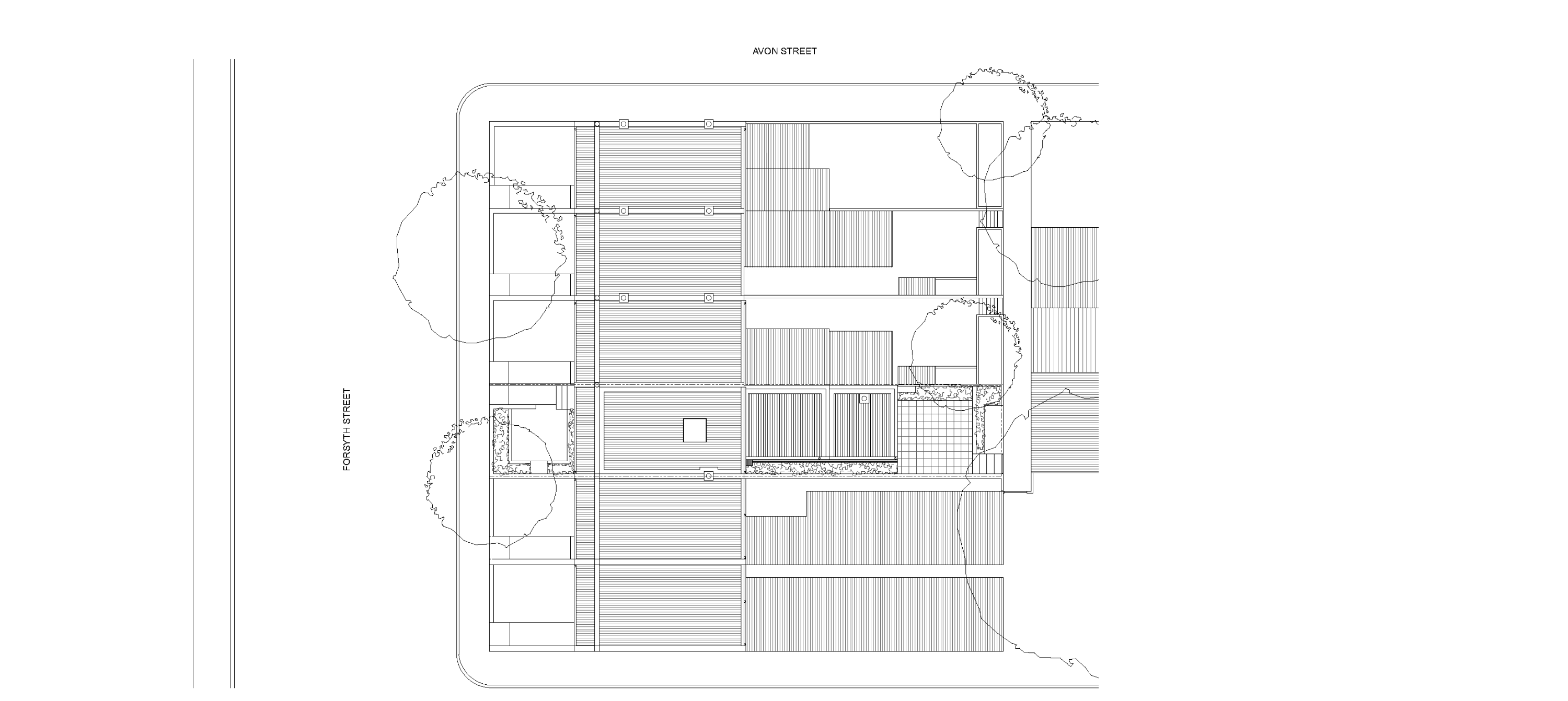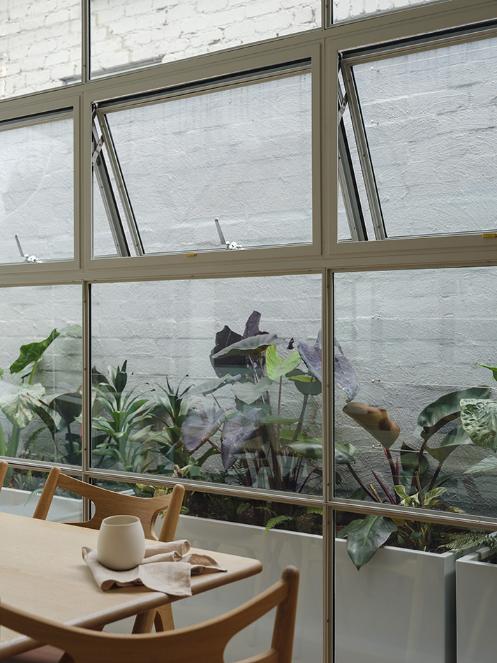 이 건물은 문화유산보존구역에 위치하고 있어, 지자체는 신축 부분이 기존 건물과 명확히 구분되도록 요구했다. 이에 따라 신축부는 기존의 회벽 벽돌 건물과 대조되도록 경량 철골 구조와 철제 외장재로 마감했으며, 철제 프레임 창과 문을 통해 후면과 측면 마당과의 개방감을 확보했다. 측면 마당에는 경계벽 하부의 콘크리트 기초 때문에 굴착이 불가능해 전 길이에 걸쳐 회색 알루미늄 화분이 배치되었다.