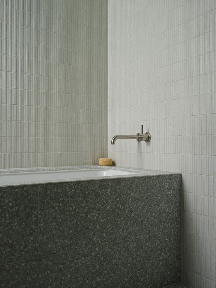 2층의 기존 뒷방은 두 개의 욕실로 리모델링 되었다. 그중 하나는 메인 침실의 욕실로, 천창을 통해 자연광을 들여 창문이 없는 공간을 밝히고 있다. 1층 신축부에는 코르크 바닥재를 사용해 기존 건물의 목재 바닥색과 시각적으로 연결되도록 했고, 주방 가구는 철제 프레임 문과 조화를 이루는 연한 회색으로 마감했으며, 측면 마당의 녹지를 반사하는 거울 백스플래시를 적용했다. 욕실에는 테라조 타일과 일본산 핑거 타일이 사용되었고, 테라조 타일은 후면 마당 바닥에도 활용되었다.