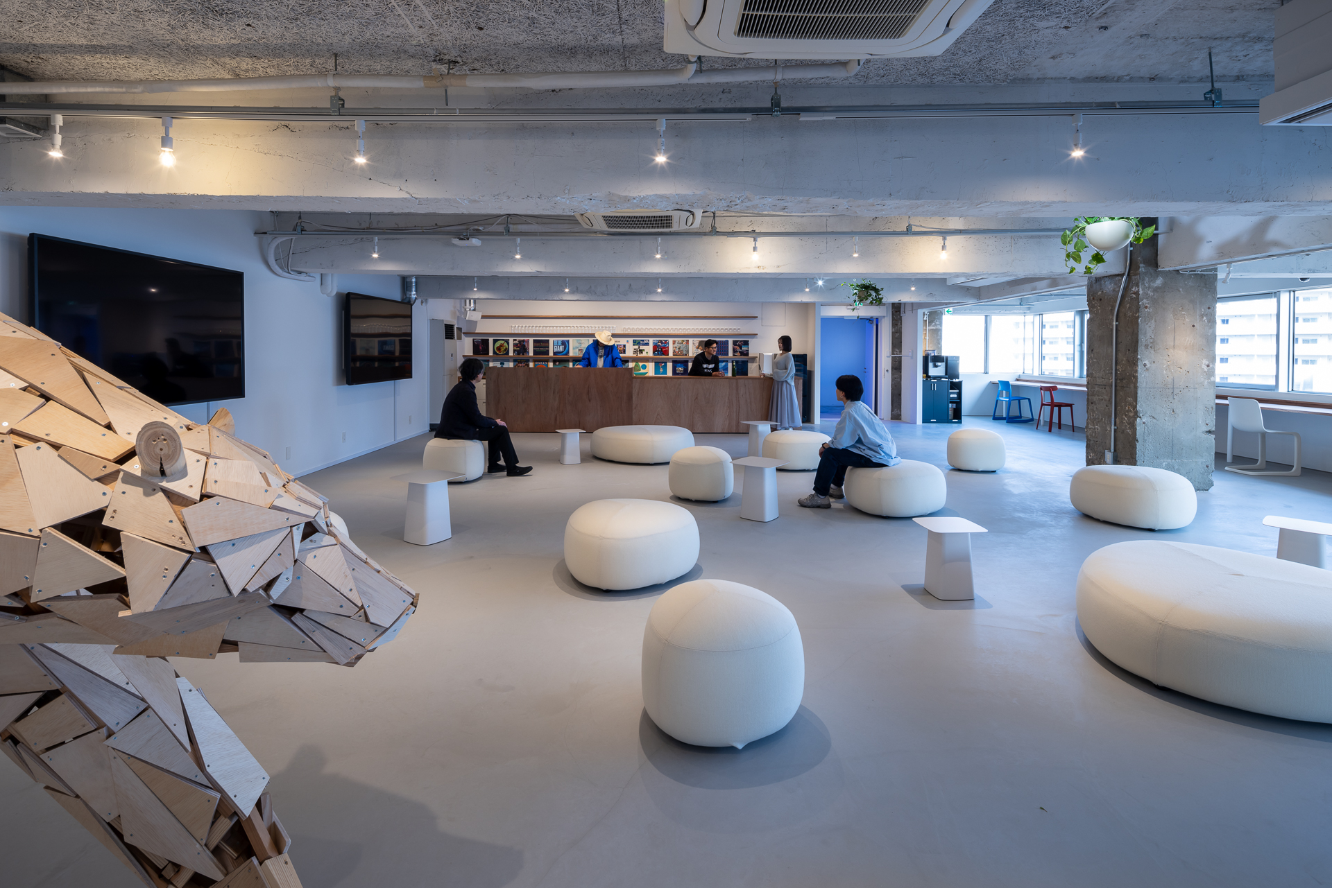 ‘Polar Bear Hall’은 폐목재로 만든 실물 크기 북극곰 조형물이 놓인 휴게 및 워크숍 공간입니다. ‘Blue Counter’는 창가에 설치되어 외부를 보며 작업할 수 있고, 저녁엔 조명이 파란빛으로 그라데이션을 이루며 분위기를 형성합니다. ‘업무 공간과 회의실’은 바닥 타일, 유리 파티션, 슬라이딩 도어, 에어컨 등 모두 재사용 자재로 구성되었습니다.