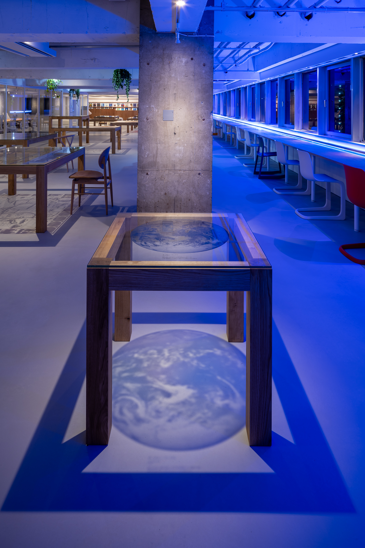 공간 구성 또한 건축적으로 중요한 의미를 지니는데, 총 여섯 개 공간이 '지구를 생각하는 시간과 장소'를 테마로 설계되었습니다. ‘Earth Space’는 고대부터 현재까지의 지도를 강화유리에 인쇄해 테이블로 제작하고, 조명 빛이 바닥에 투사되도록 설계되었습니다. ‘ECD 입구’는 타 현장에서 남은 페인트를 혼합해 벽을 칠하고, 조개껍데기를 재활용한 3D 프린팅 재료로 로고를 제작했습니다.