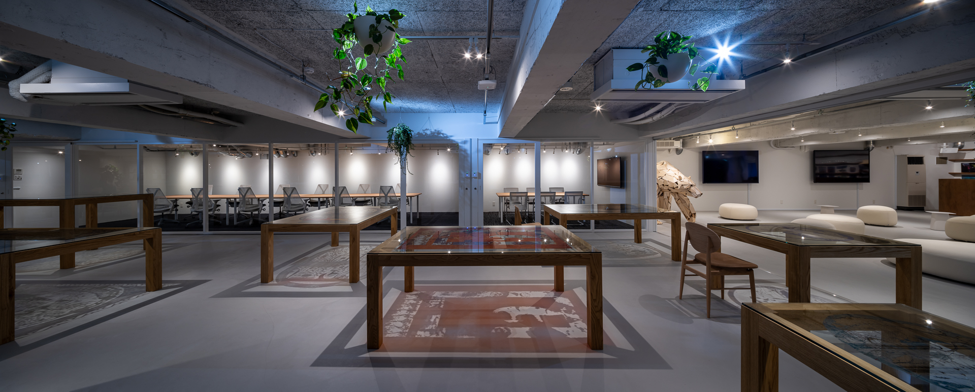 ‘Polar Bear Hall’은 폐목재로 만든 실물 크기 북극곰 조형물이 놓인 휴게 및 워크숍 공간입니다. ‘Blue Counter’는 창가에 설치되어 외부를 보며 작업할 수 있고, 저녁엔 조명이 파란빛으로 그라데이션을 이루며 분위기를 형성합니다. ‘업무 공간과 회의실’은 바닥 타일, 유리 파티션, 슬라이딩 도어, 에어컨 등 모두 재사용 자재로 구성되었습니다.