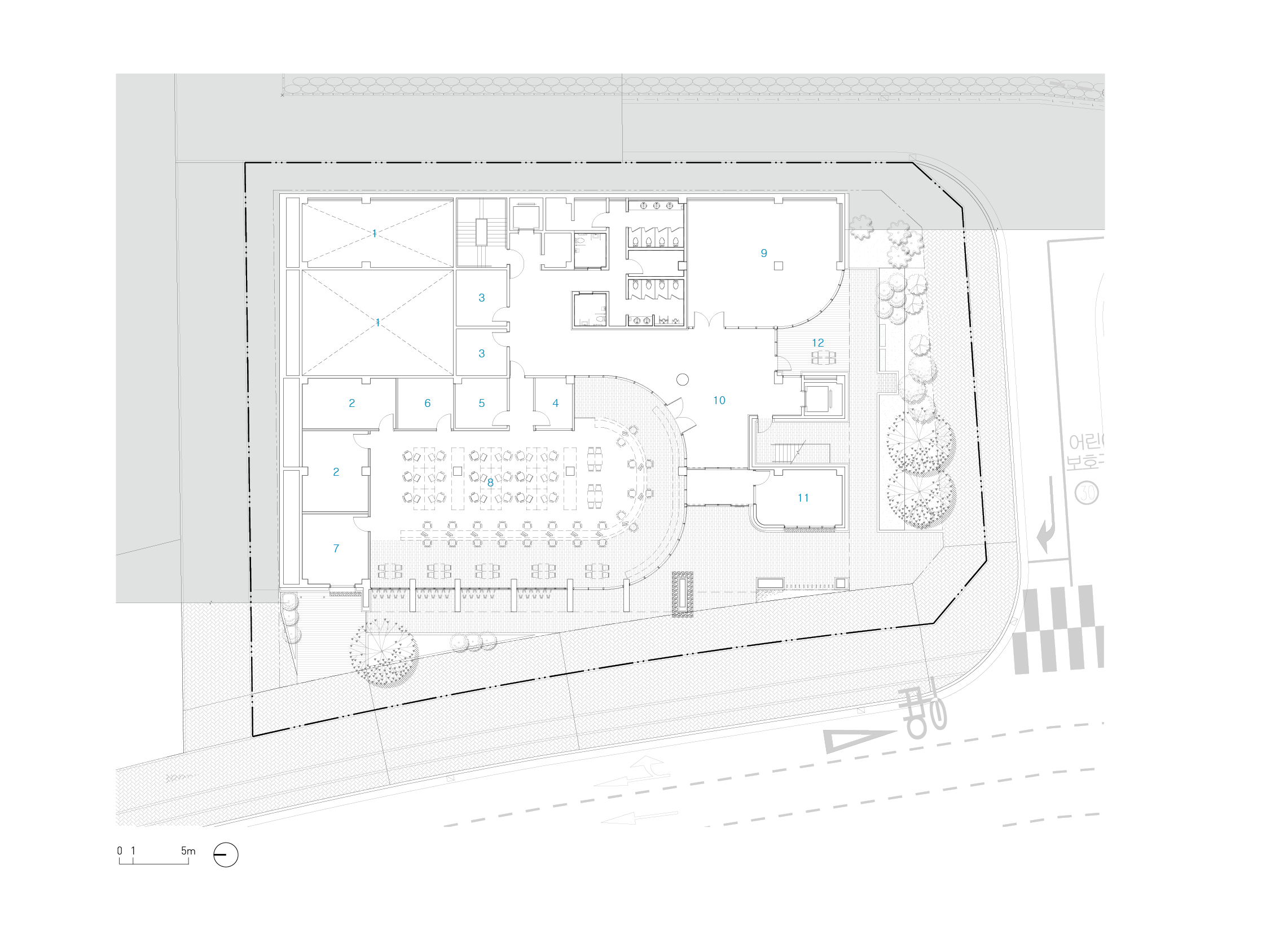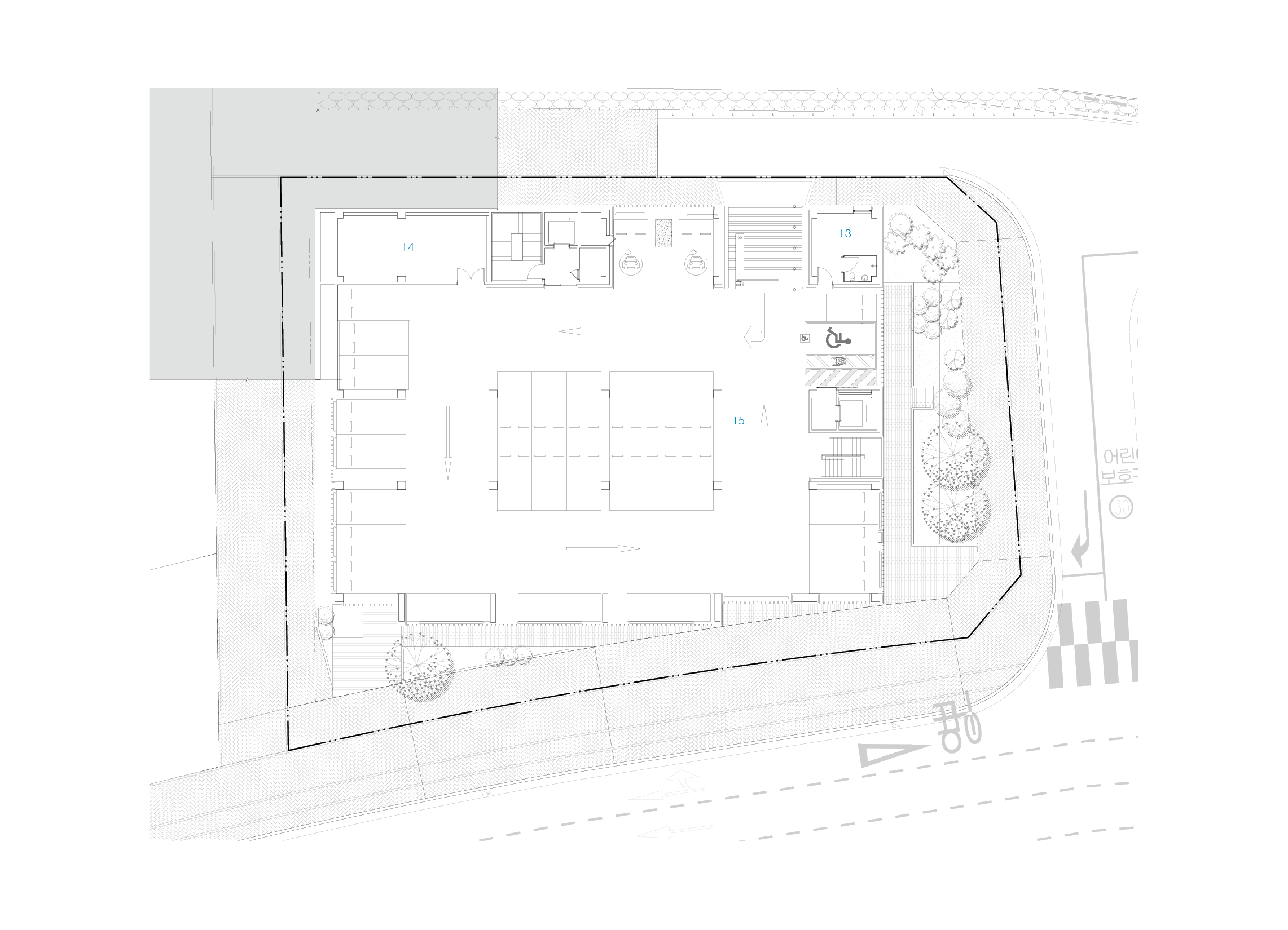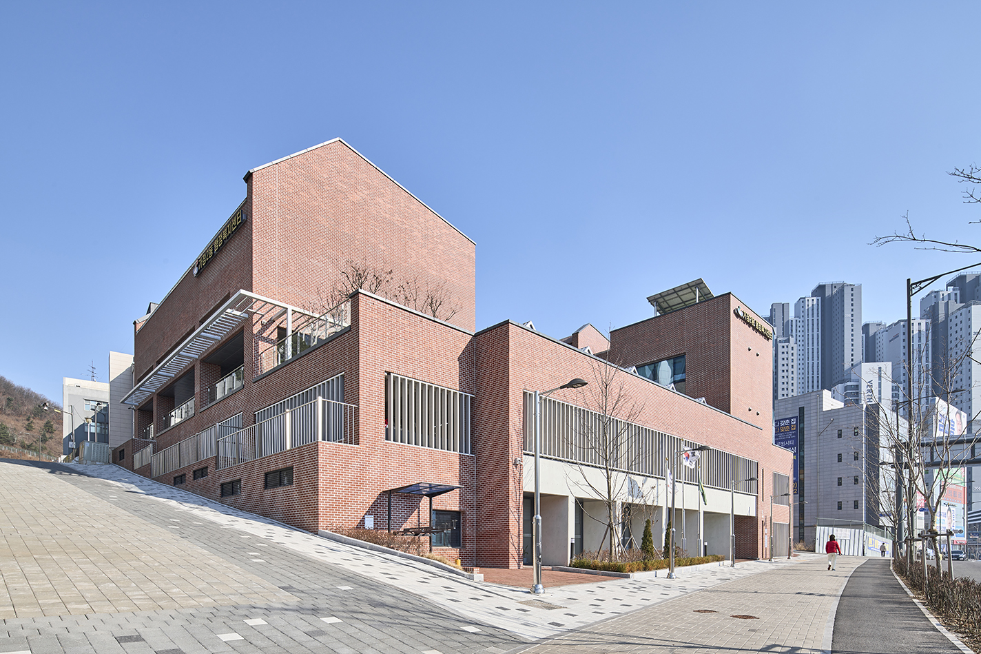 대지는 도시계획과 지형 측면에서 독특한 조건을 가지고 있다. 대지는 약 7m에 이르는 고저차가 있으며, 법적으로 차량 진입이 가능한 구간은 3m 범위로 제한되어 있다. 이러한 특성에 따라, 지상 2층에 주차장이 마련되어 있다. 이로 인해 업무 공간과 주민자치 공간이 단면상 자연스럽게 분리되고, 절토를 최소화한 지상층 중심으로 친환경 계획이 되어 있다.