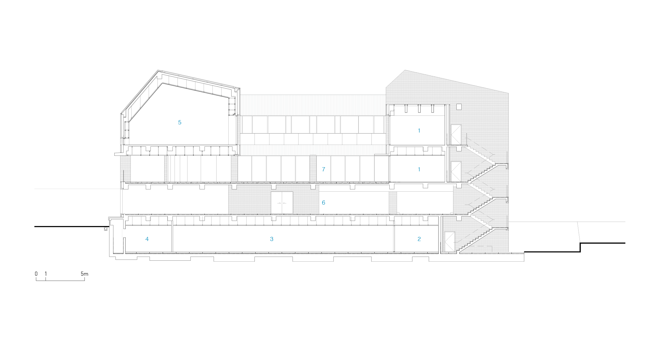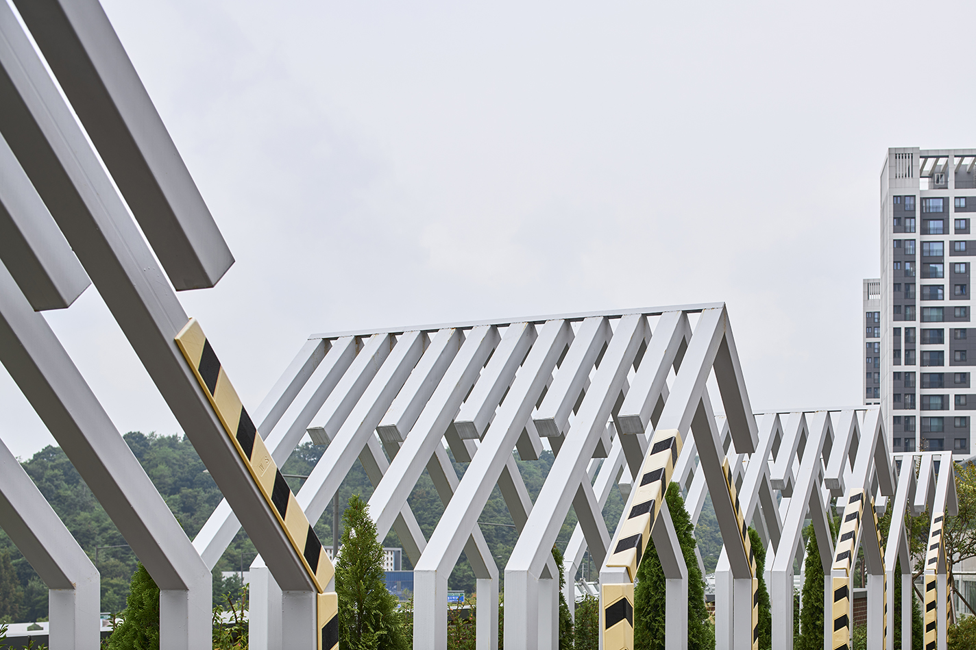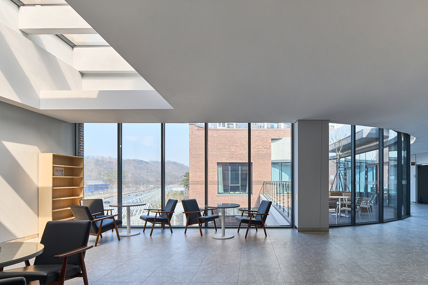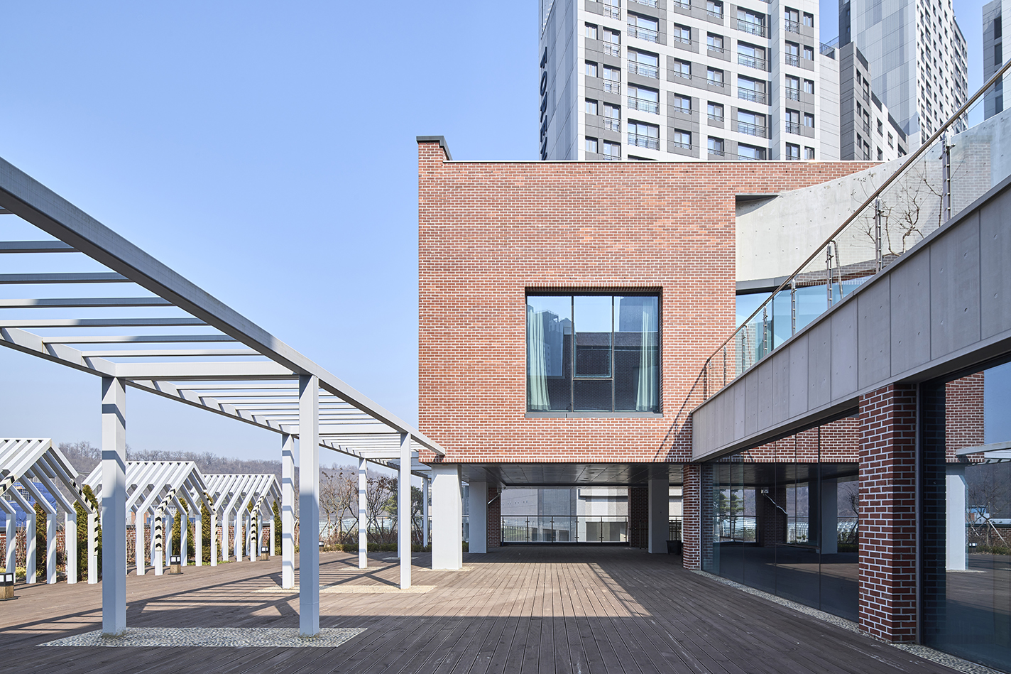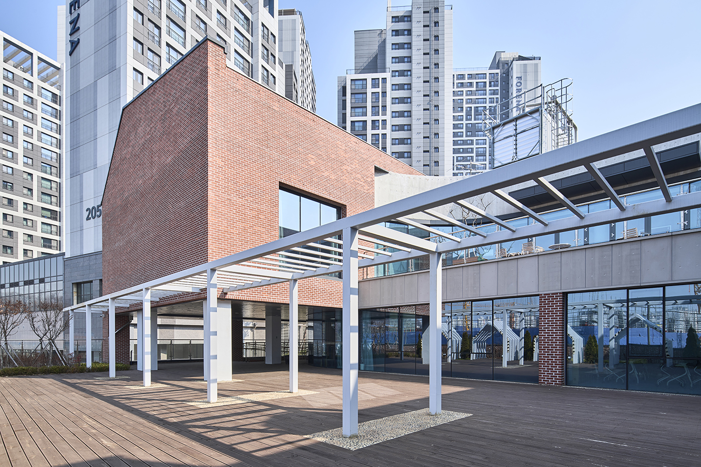 민원실은 벽돌과 조화를 이루는 노출콘크리트 마감으로, 거리와 맞닿는 보행 환경에 정돈된 분위기를 전달한다. 건물 외곽에 설치된 수직 루버들은 단순한 장식을 넘어 덩굴식물이 자랄 수 있는 구조로 활용되어, 시간이 지나며 자연과 함께 성장하는 녹색 입면을 만들어간다.