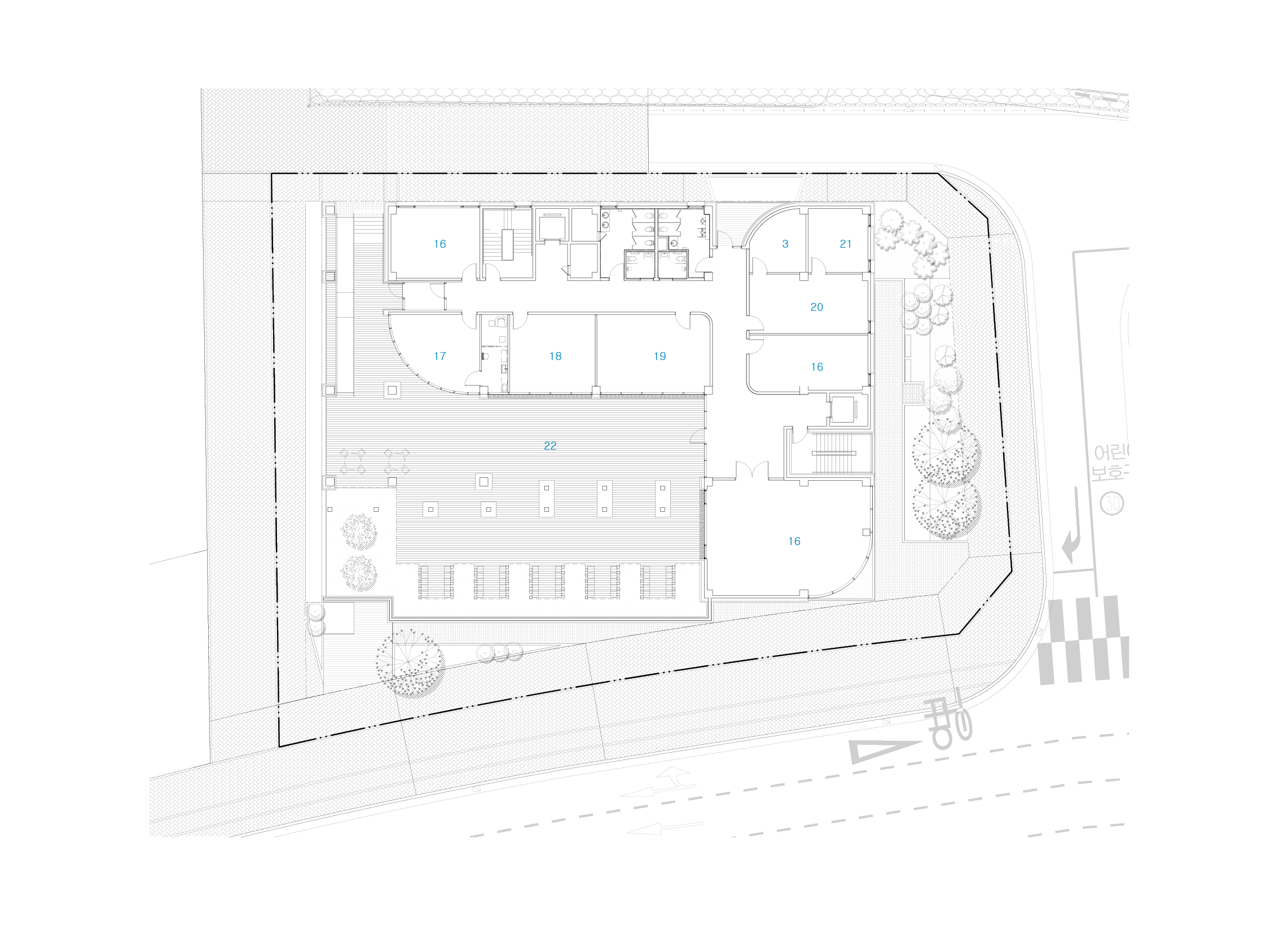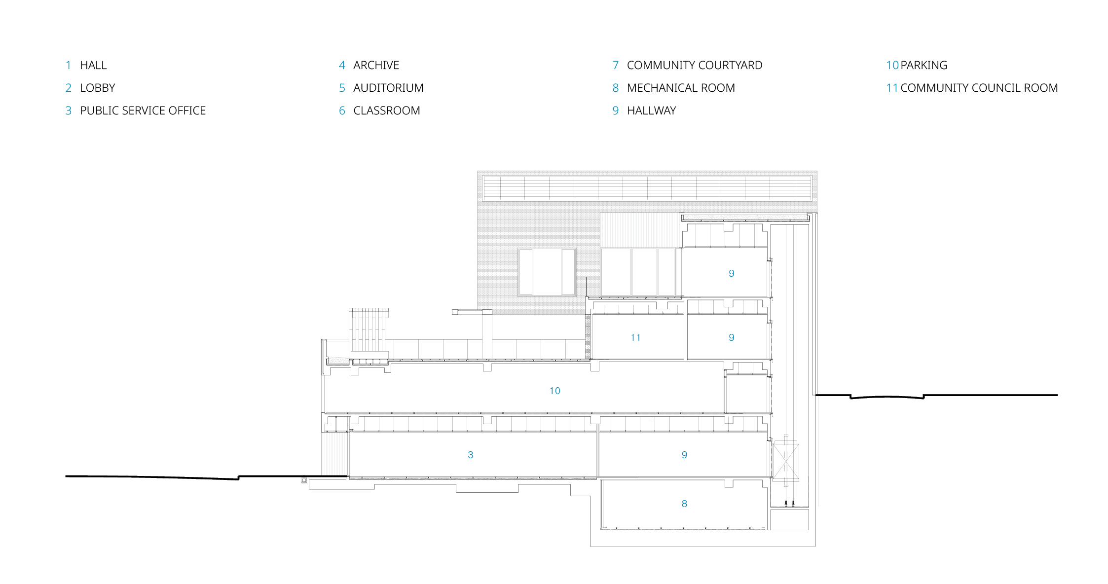 대지는 도시계획과 지형 측면에서 독특한 조건을 가지고 있다. 대지는 약 7m에 이르는 고저차가 있으며, 법적으로 차량 진입이 가능한 구간은 3m 범위로 제한되어 있다. 이러한 특성에 따라, 지상 2층에 주차장이 마련되어 있다. 이로 인해 업무 공간과 주민자치 공간이 단면상 자연스럽게 분리되고, 절토를 최소화한 지상층 중심으로 친환경 계획이 되어 있다.