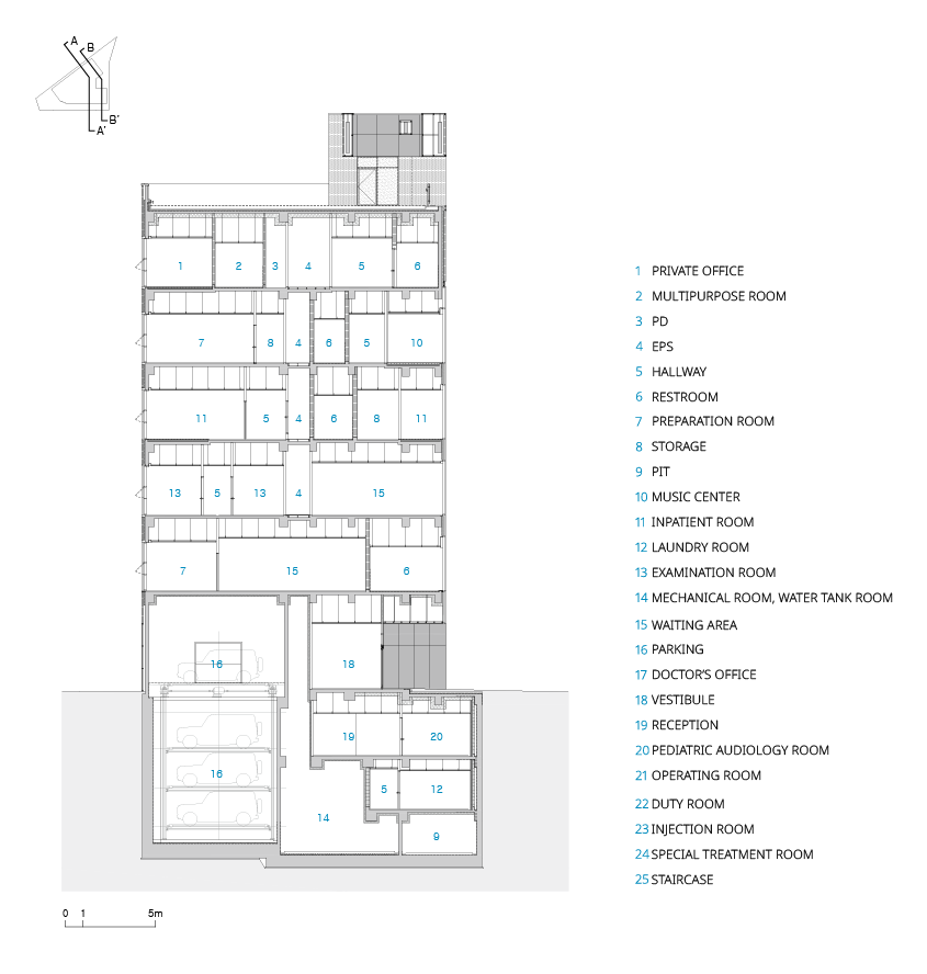 소리의원은 국내 최대 규모의 귀 전문 클리닉으로, 개원 이후 선진적인 전문성과 인력, 진료 시스템을 바탕으로 점차 성장하고 있는 병원이다. 소리의원은 귀와 관련된 다양한 분야의 센터를 총망라하며 1차 의료기관의 기능부터 3차 의료기관의 기능까지 한 건물에 담아내길 희망하는 건축주의 요청에 따라 간단한 진료와 투약부터 정밀한 진단과 수술 등 환자의 생애주기와 관련된 모든 기능이 담겼다.
