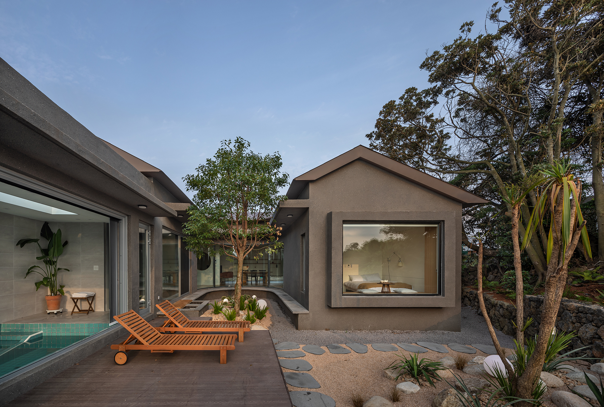 스테이 오후는 제주도에서만 느낄 수 있는 요소도 있다. 초가 형태를 반영한 지붕과 스테이 건물을 둘러싼 돌담은 스테이 오후가 주변 경관과 자연스럽게 어우러지게 만든다.