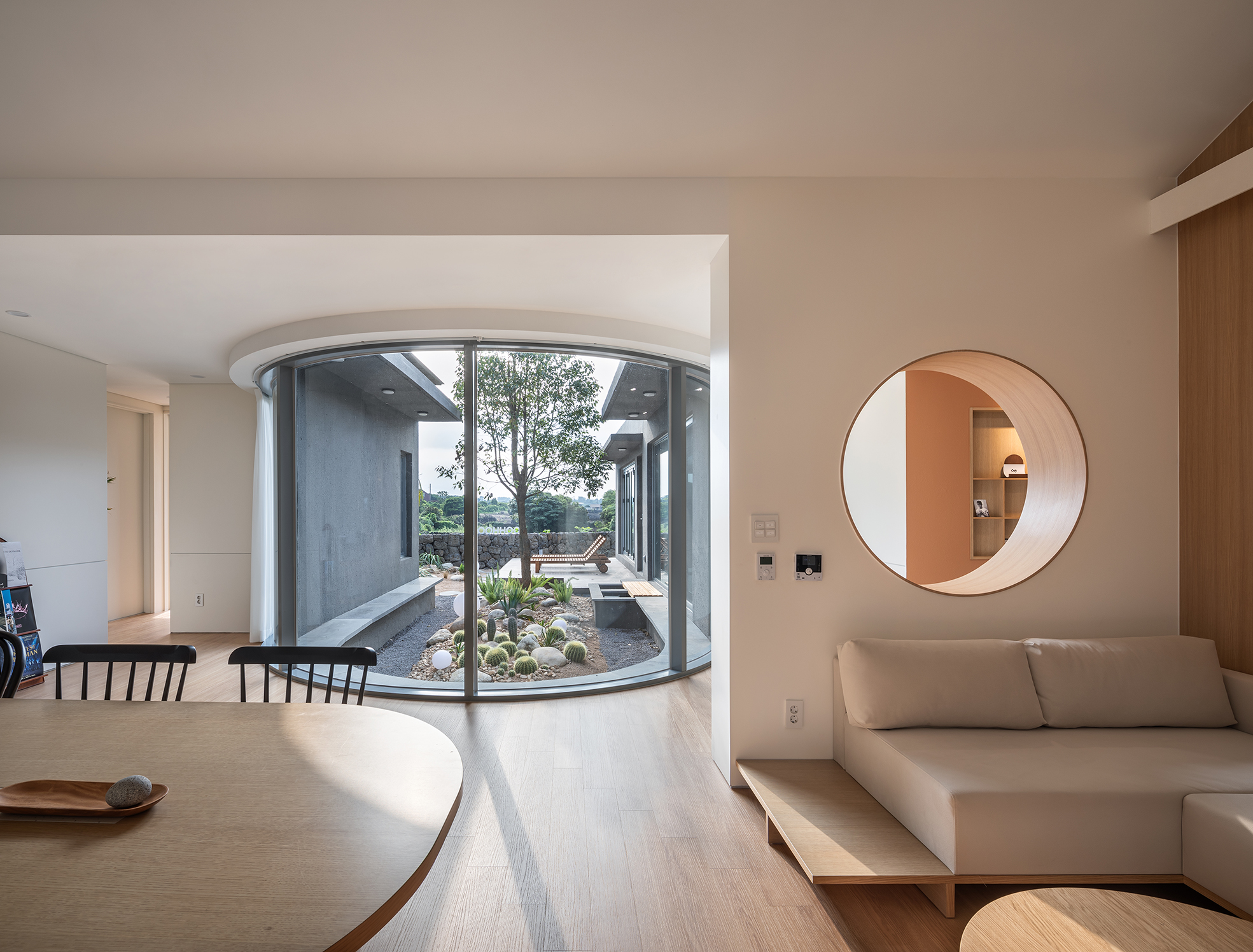 각각의 독립된 현관을 지나면 거실과 함께 중정을 마주하게 된다. 수영장은 대지의 형태에 따라 위치와 방향을 달리해 배치되었으며, 실내 공간과 자연스럽게 연결된다. 거실에서 도로를 향해 난 창문은 최대한 낮게 계획되어 있다. 낮은 위치에 계획된 창문은 도로로부터 프라이버시를 보호하면서도, 채광은 받아들일 수 있게 한다.