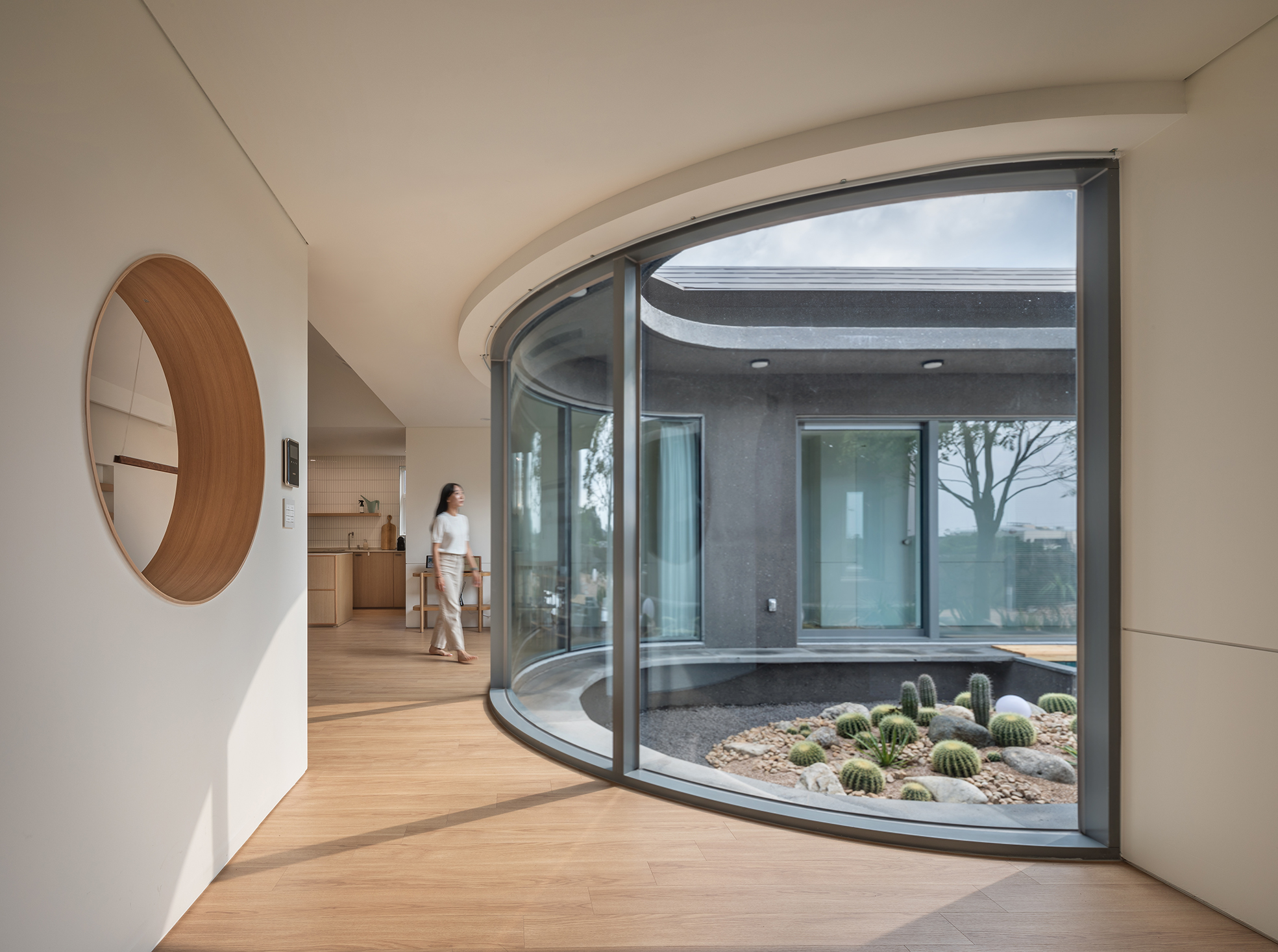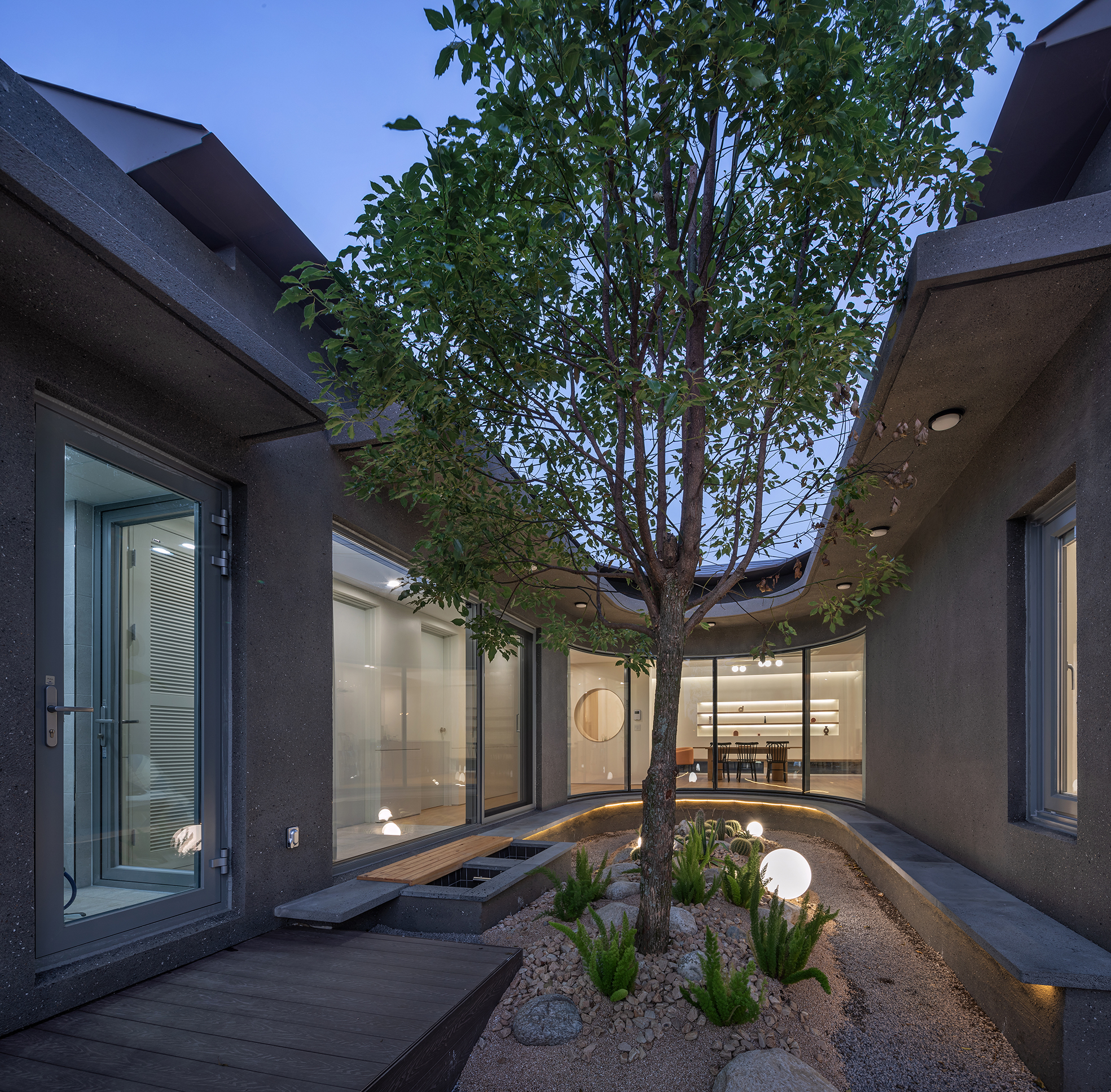각각의 독립된 현관을 지나면 거실과 함께 중정을 마주하게 된다. 수영장은 대지의 형태에 따라 위치와 방향을 달리해 배치되었으며, 실내 공간과 자연스럽게 연결된다. 거실에서 도로를 향해 난 창문은 최대한 낮게 계획되어 있다. 낮은 위치에 계획된 창문은 도로로부터 프라이버시를 보호하면서도, 채광은 받아들일 수 있게 한다.