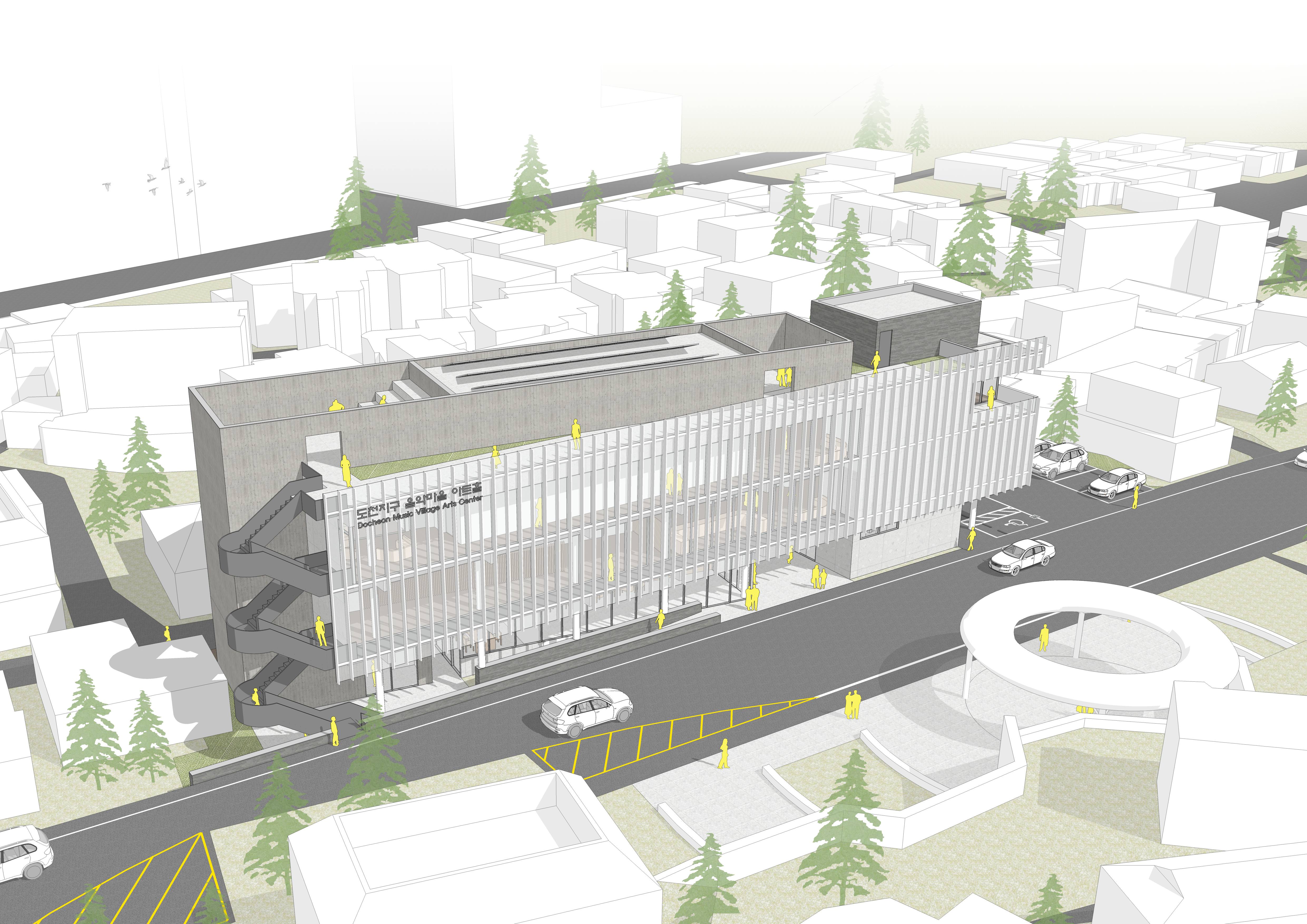 두 축의 단순한 덩어리로 구성된 마을의 틈에 자리한 음악마을 아트홀은 마을과 조화를 이루기 위한 전략적 주체로 설계되었다. 다양한 주민을 위한 프로그램과 음악 공간, 전시 공간이 적절히 결합되어, 공공 프로그램이 맞은편의 달무리 광장과 유기적인 관계를 맺으며 다층적이고 혼합된 풍경을 형성한다.