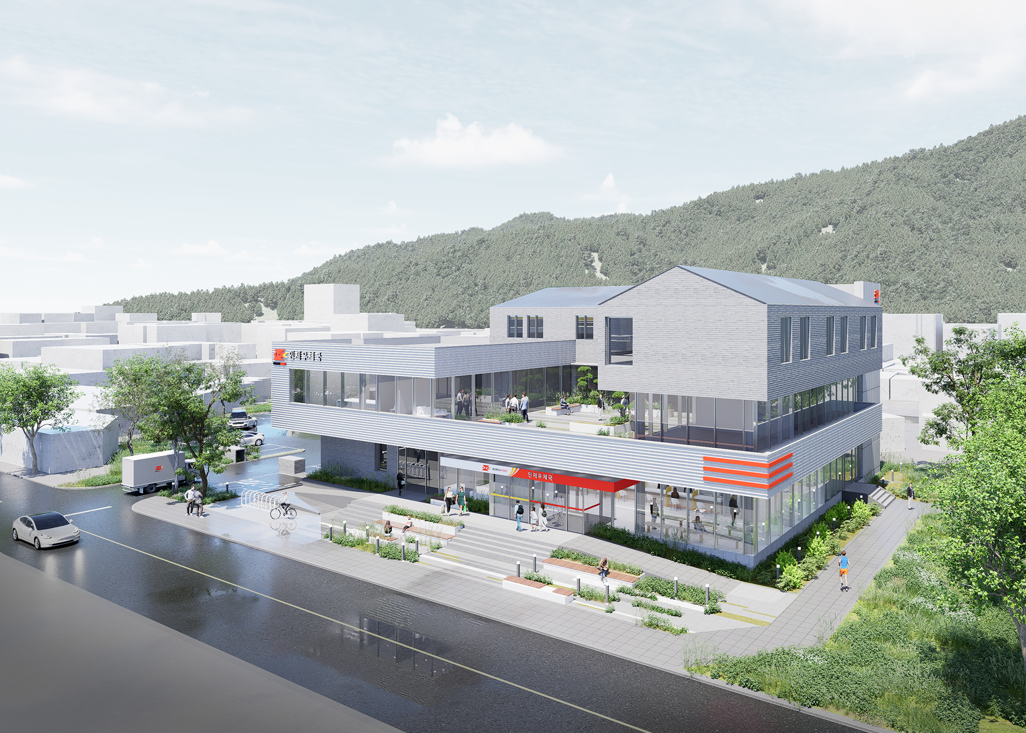 외관은 수평적인 입면을 통해 우체국의 공공성과 안정감을 드러내고, 박공 형태의 지붕으로 마을의 풍경과 조화를 이루는 친근한 이미지의 건축물을 지향했습니다.