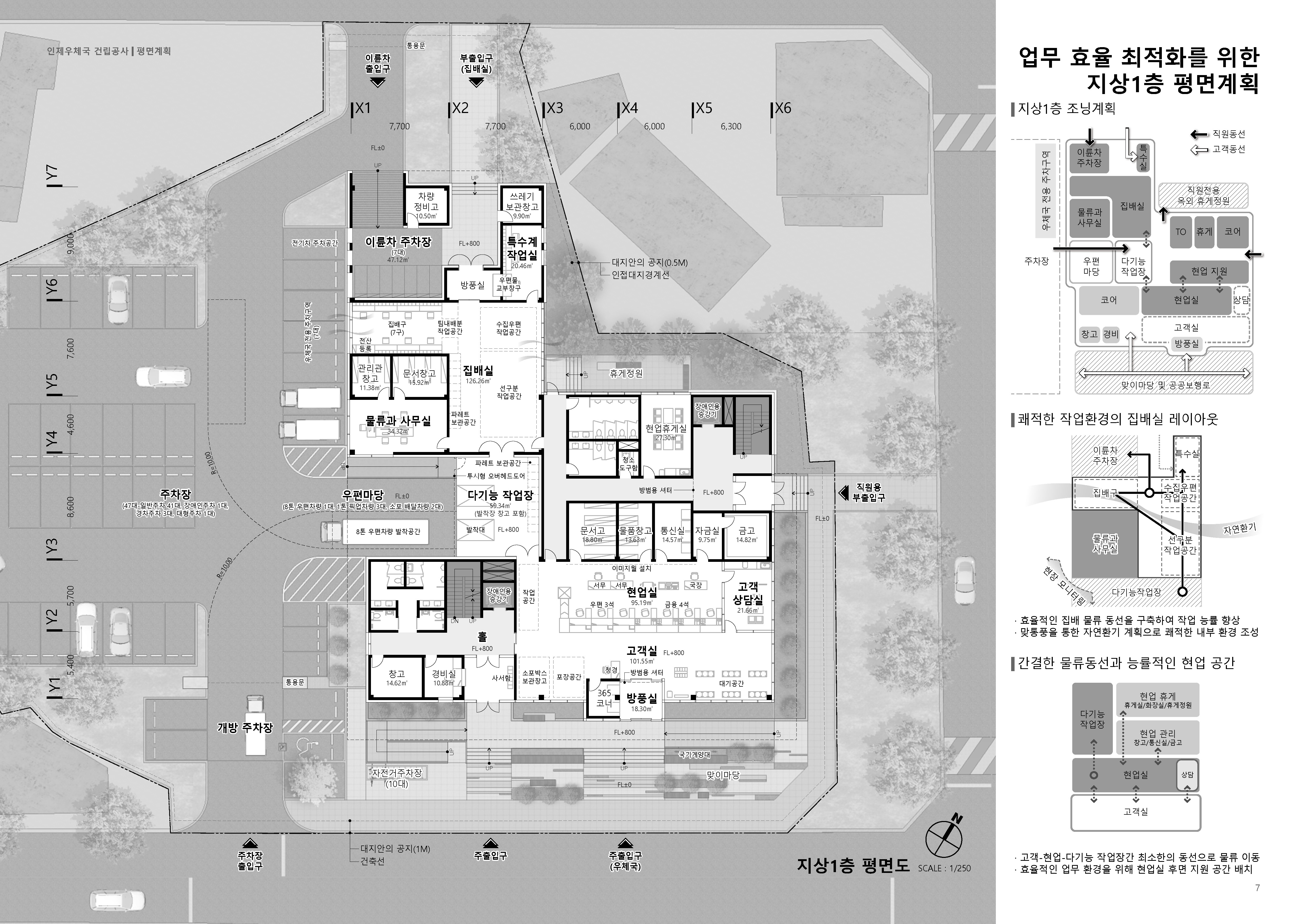 전체 공간은 우편마당을 중심으로 고객·현업·집배 영역을 유기적으로 배치하여, 서로 기능적으로 분리되면서도 자연스럽게 연결되도록 구성하였습니다.