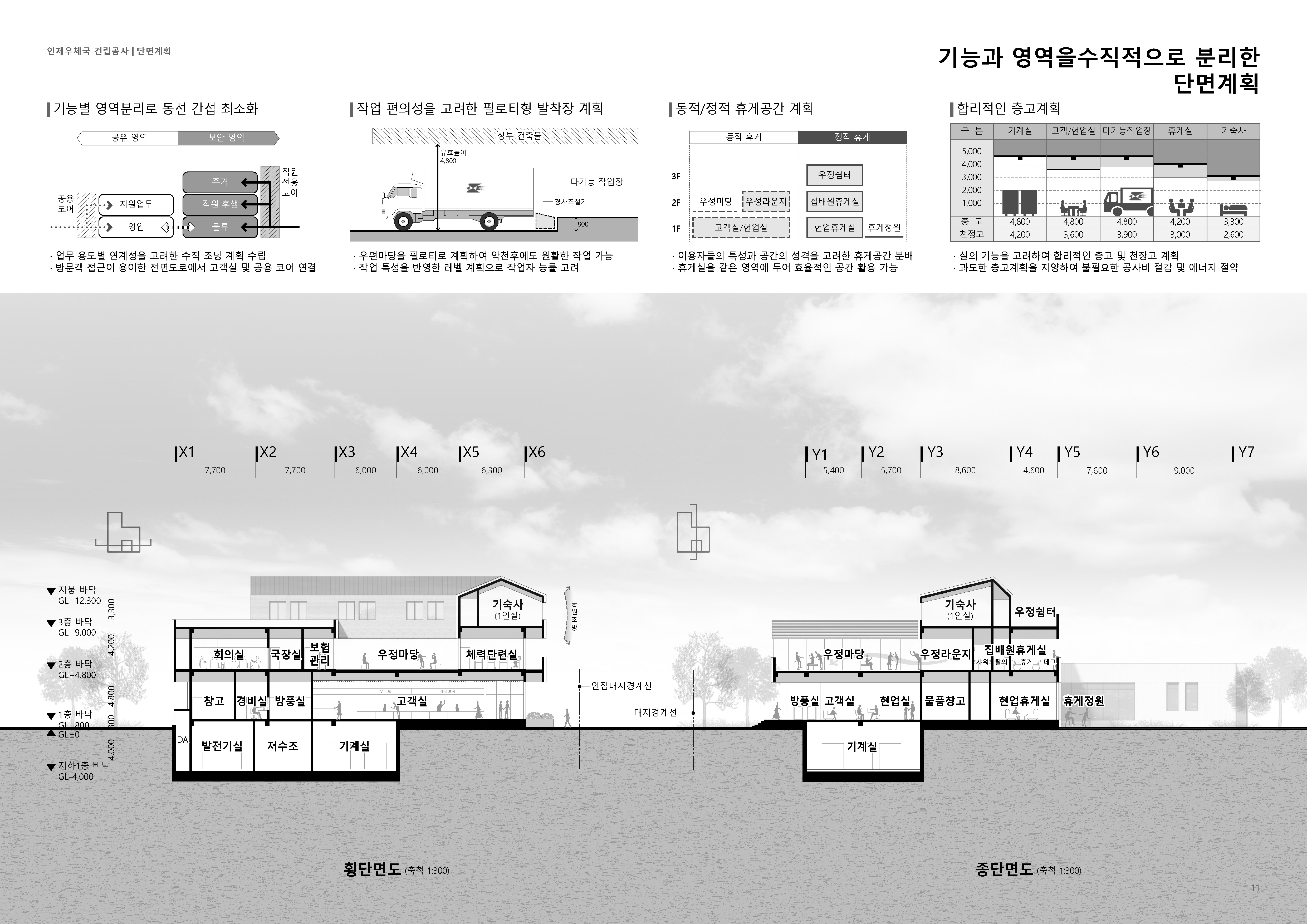 전체 공간은 우편마당을 중심으로 고객·현업·집배 영역을 유기적으로 배치하여, 서로 기능적으로 분리되면서도 자연스럽게 연결되도록 구성하였습니다.