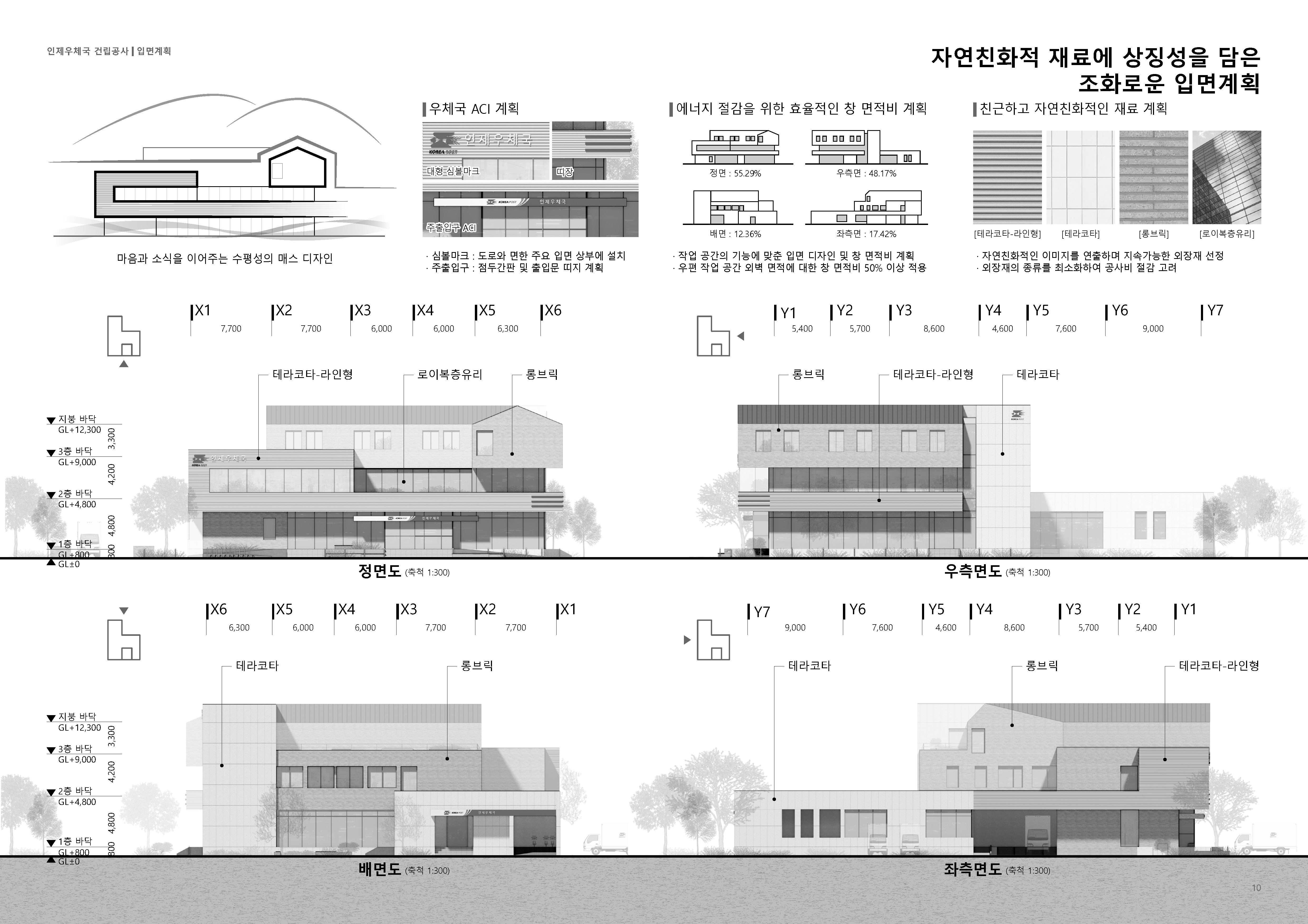 외관은 수평적인 입면을 통해 우체국의 공공성과 안정감을 드러내고, 박공 형태의 지붕으로 마을의 풍경과 조화를 이루는 친근한 이미지의 건축물을 지향했습니다.