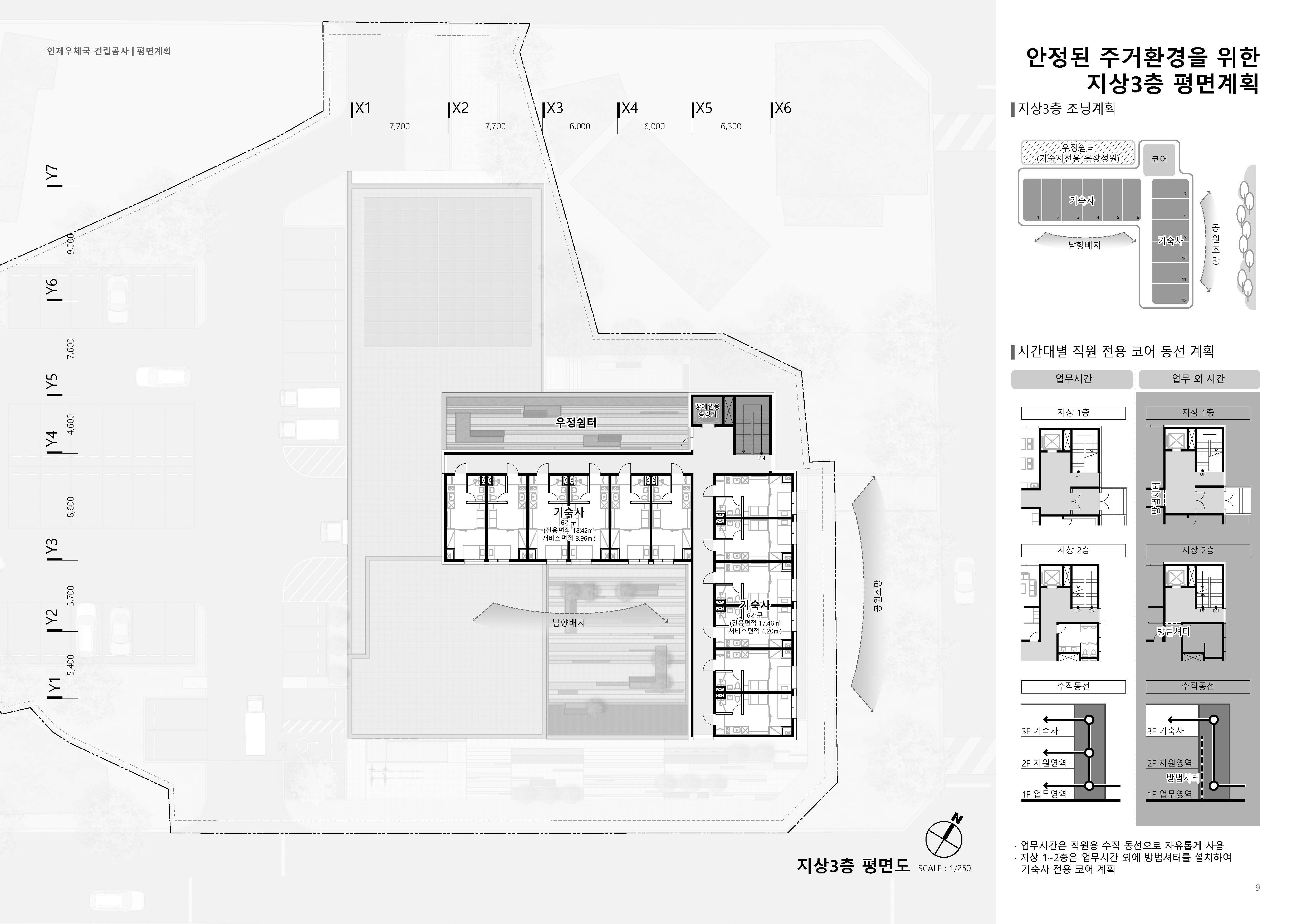 또한 업무, 휴게, 주거 영역을 층별로 나누어 입체적인 공간 구조를 형성하고, 일과 생활이 조화롭게 이어질 수 있도록 계획했습니다.