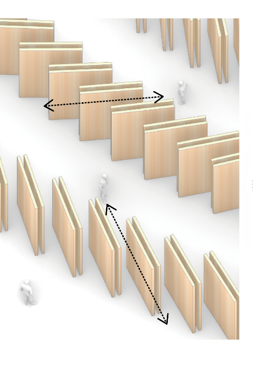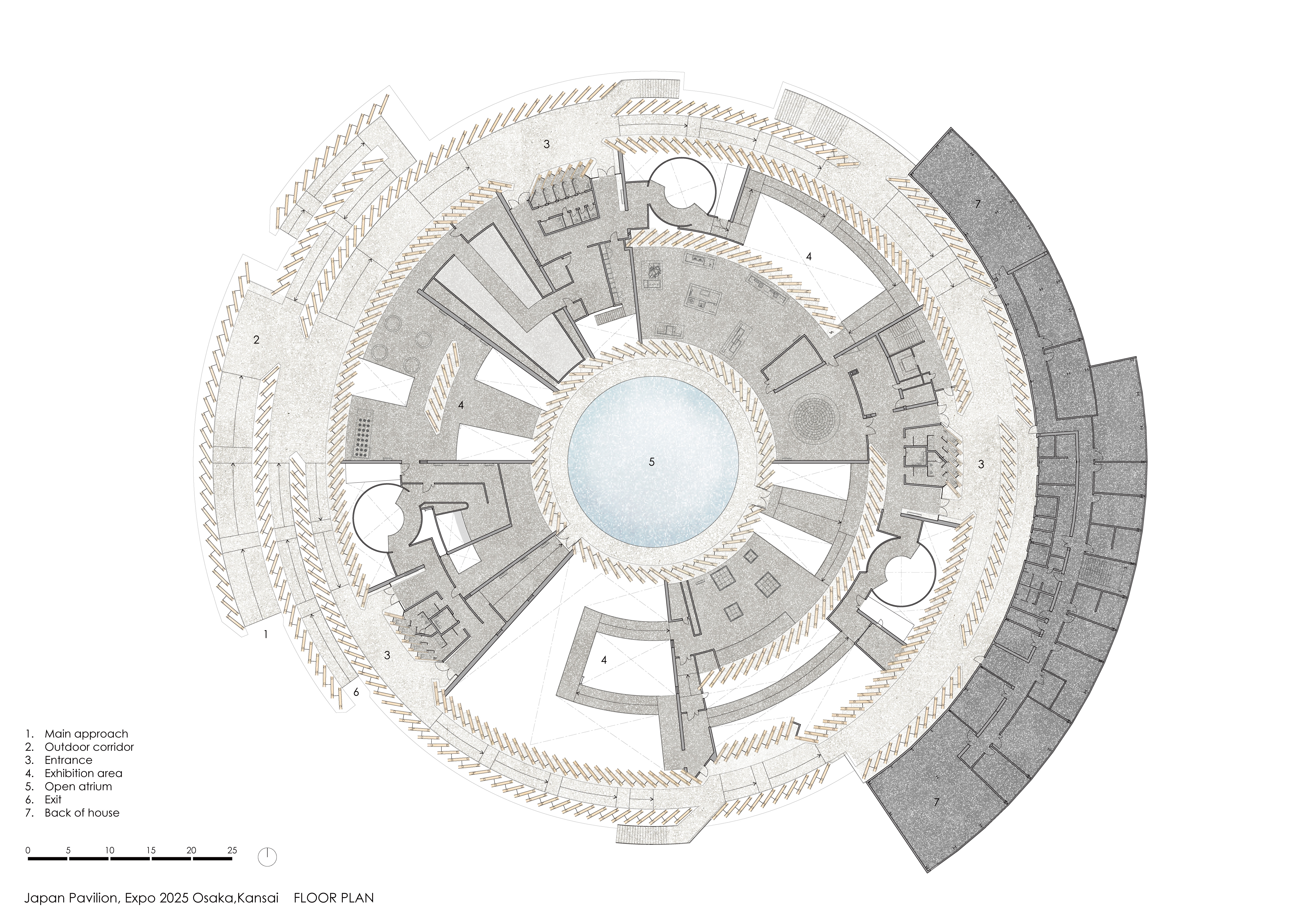 목재는 생명의 순환과 서큘러 이코노미(Circular Economy)를 상징하는 재료이다. 그 중에서도 CLT는 소경목을 박판의 라미나로 잘라서 쌓아 올려 큰 패널을 만들어 내는, 목재 활용의 가능성을 향상시킨 새로운 활로이다. 또한 본 프로젝트에 사용된 CLT의 일부는 일반사단법인 일본 CLT 협회에서 대여하여, 전시 기간 종료 후에 해체 및 반납함으로써 향후 새로운 건축물의 건립때 재사용되도록 하였다. 이와 같이 전시관 전체의 콘셉트인 ‘순환’을 표현하는 건물에 꼭 맞는 재료인 CLT 을 건물의 원주 방향을 따라 반복적으로 배열하여, 네모난 패널로 원형의 건물을 구성하였다. CLT 판과 판 사이에는 시선이 통과할 수 있는 틈을 두어, ‘외부와 내부’, ‘전시와 건축’이 연속적으로 이어지면서 순환과는 별개로 존재하는 또 하나의 틈을 상기시키도록 기획하였다.