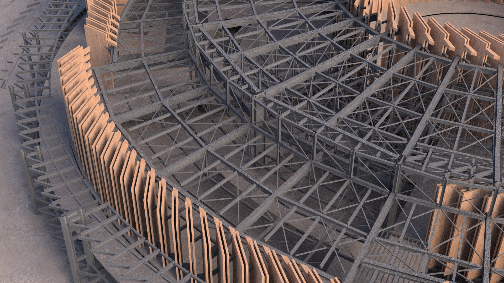 유연성과 융통성을 갖춘 전시 공간의 구현과 CLT의 상징적 표현을 동시에 만족하기 위하여 주요 구조를 철골조로 하고, 내진 요소로 CLT를 드러내어 이용한 골조를 형성하였다. 중소 단면 철골로 구성된 방사 방향의 원 프레임 라멘 구조를 평균 피치로 배치하고, 원주 방향은 각 프레임 사이를 작은 보로만 접합하는 단순한 구성을 취하여 합리적인 원형 플랜을 이루었다. 또한 반복적으로 비스듬히 배열한 CLT 내진벽을 평면 계획의 외주와 중간, 내주 부분에 반대 방향으로 배치함으로써, 원형 플랜의 각 존마다 적절한 비틀림 강성을 자연스럽게 확보하게 하여 균형잡힌 내진 구조를 실현하였다.
