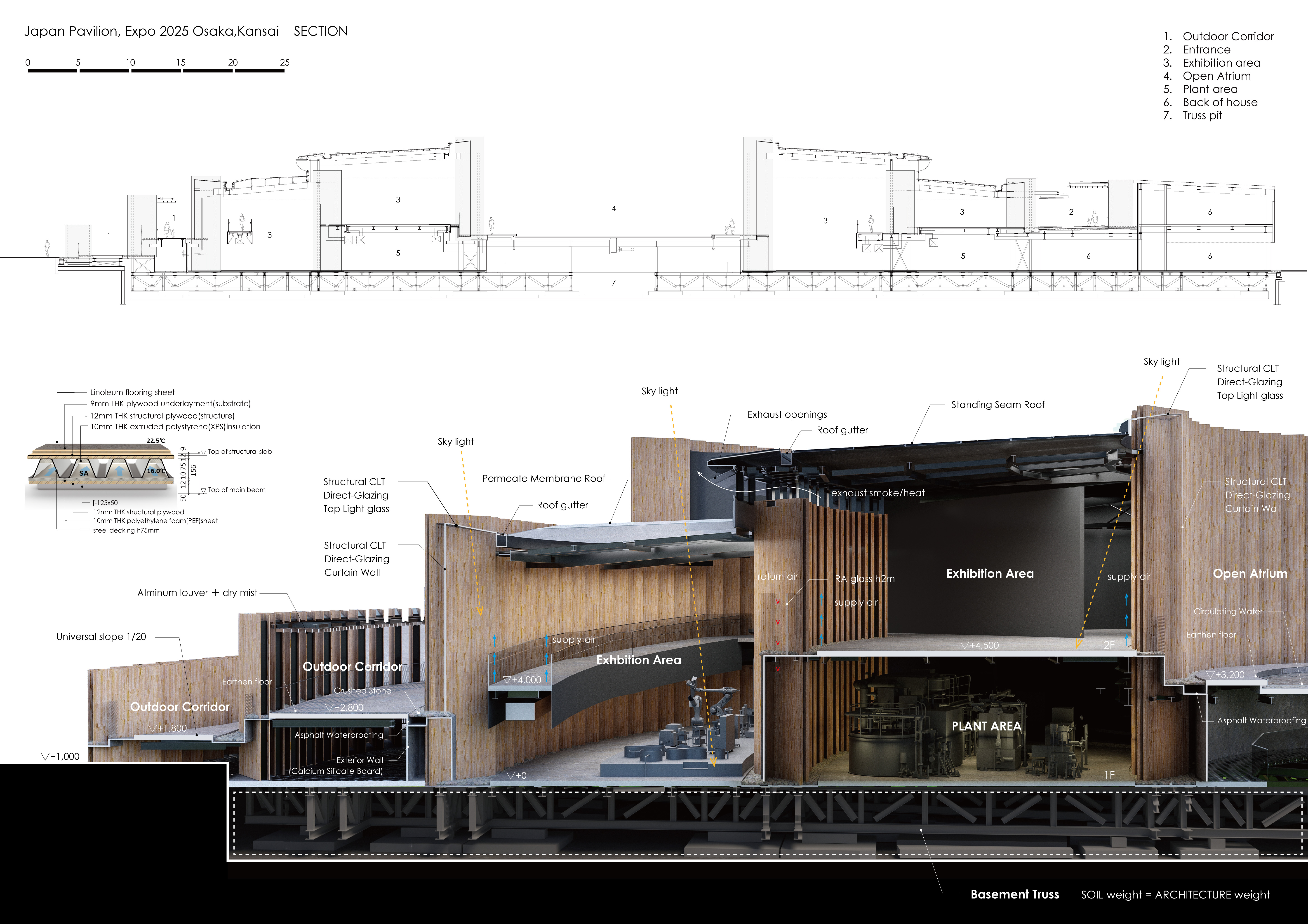 본 계획에서는 가설 건축물이 갖는 기간 한정이라는 특수성을 고려하여, CLT를 내외부에 노출시키는 특징적 건축 표현을 구현하였다. 이때 구조 내력 상의 안정성과 야외 환경에 대응 가능한 설비 등을 감안하여, CLT는 3층 3중(내벽측)과 3층 4중(외벽측) 구성을 기본으로 했다. 본 건축물이 들어서는 지역은 매립지로서 지반이 취약하므로, 건물 중량의 경량화와 시공에 소요되는 기간의 단축, 해체의 용이성을 갖추어야 했다. 전시 공간 바닥에 콘크리트를 사용하지 않고, 구조용 합판과 데크 플레이트를 나사로 연결한 건식 합성 바닥을 깔았다. 데크 플레이트와 철골보를 접합할 때에도, 해체의 용이성을 고려하여 용접을 하지 않고 탭핑 드릴 나사를 이용하여 건식 접합하였다. 데크 플레이트와 구조용 합판을 일체화하였고, 실제 크기의 모델을 제작해 시험을 실시하여 보행감과 진동 성질을 사전 확인하는 절차를 거쳤다. 또한 데크와 합판의 사이에 발생하는 공간을 공조용 덕트로 활용하여, 바닥 토출을 거주역 공조에 활용하고 있다.