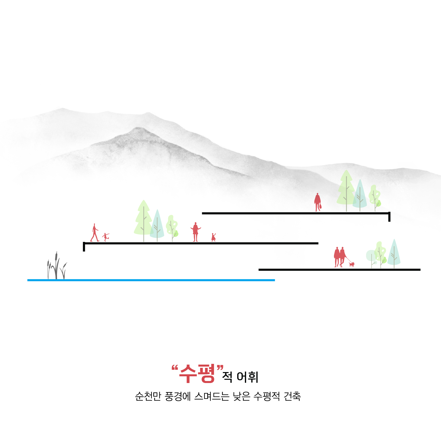 셋째, 순천만 풍경에 자연스레 스며드는 낮은 "수평적 건축"