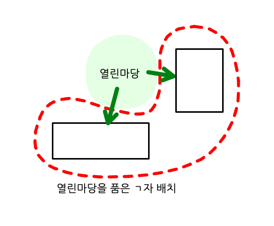 이러한 특징을 고려하여 남측의 인접녹지와 접한 부지에 열린 마당을 배치하고, 이를 중심으로 두 동을 ㄱ자 형태로 배치함으로써 물리적으로 분리되어 있는 두 시설이 시각적·공간적으로 유기적으로 연결되어 하나의 공간처럼 인식될 수 있도록 계획하였다. 또한 열린 마당을 통해 자연광을 끌어들이는 동시에, 지역 전체에 시각적 개방감을 확산시키도록 하였다.