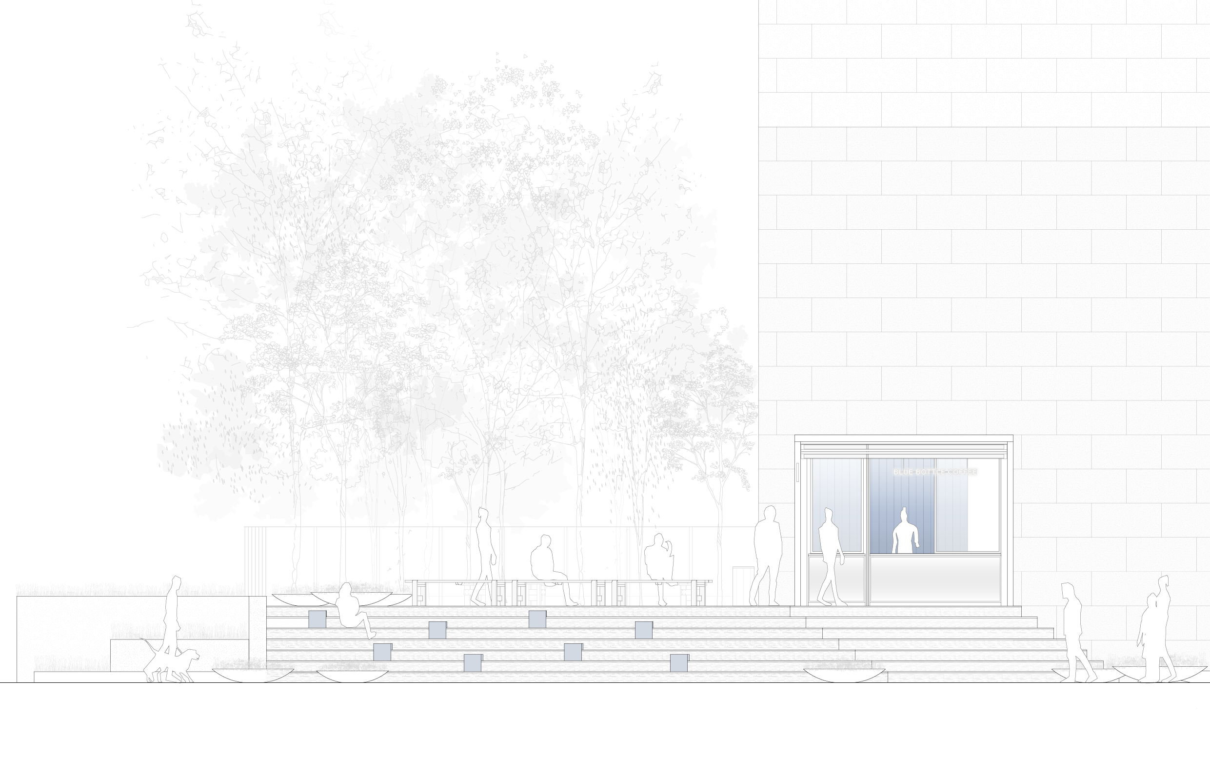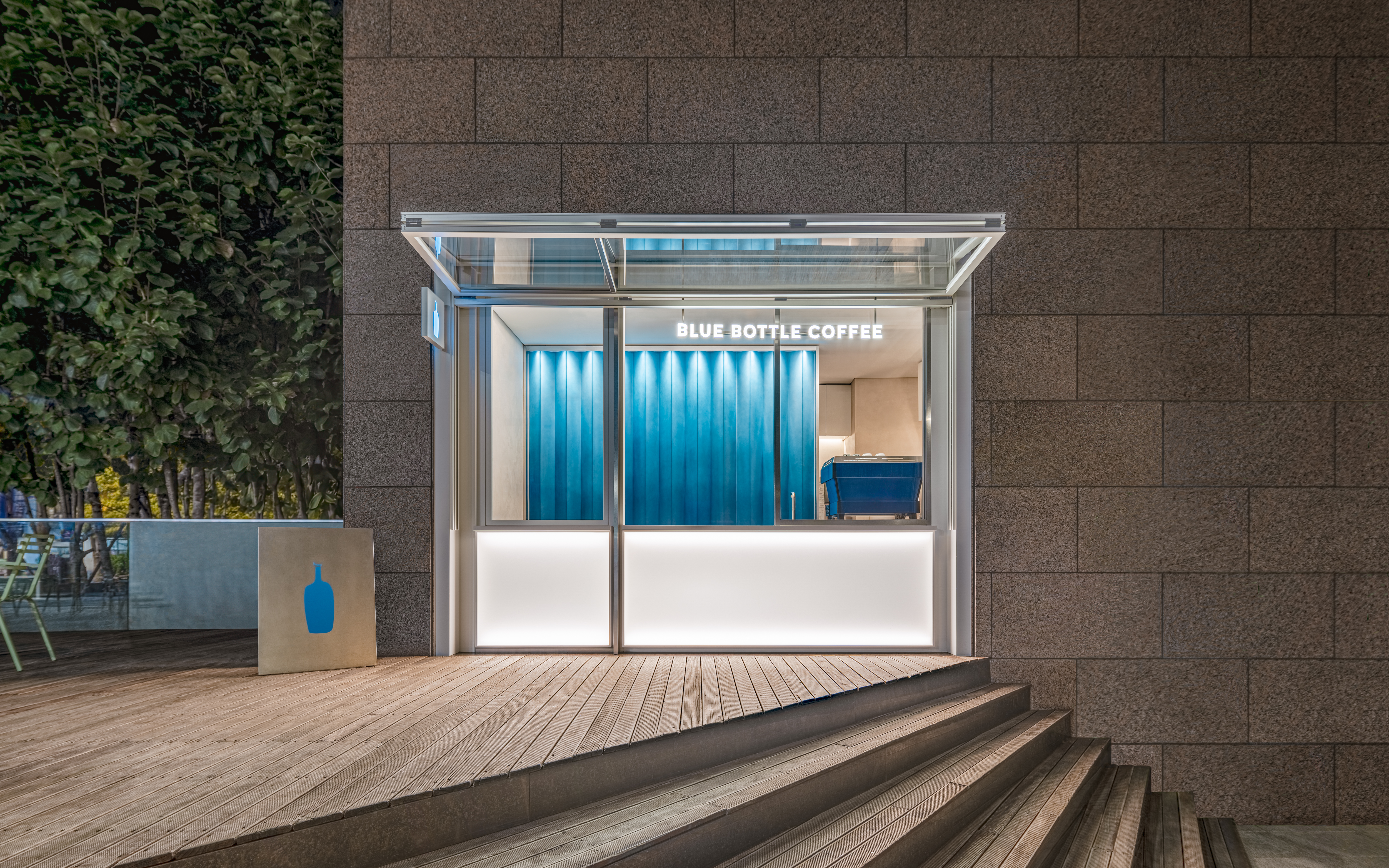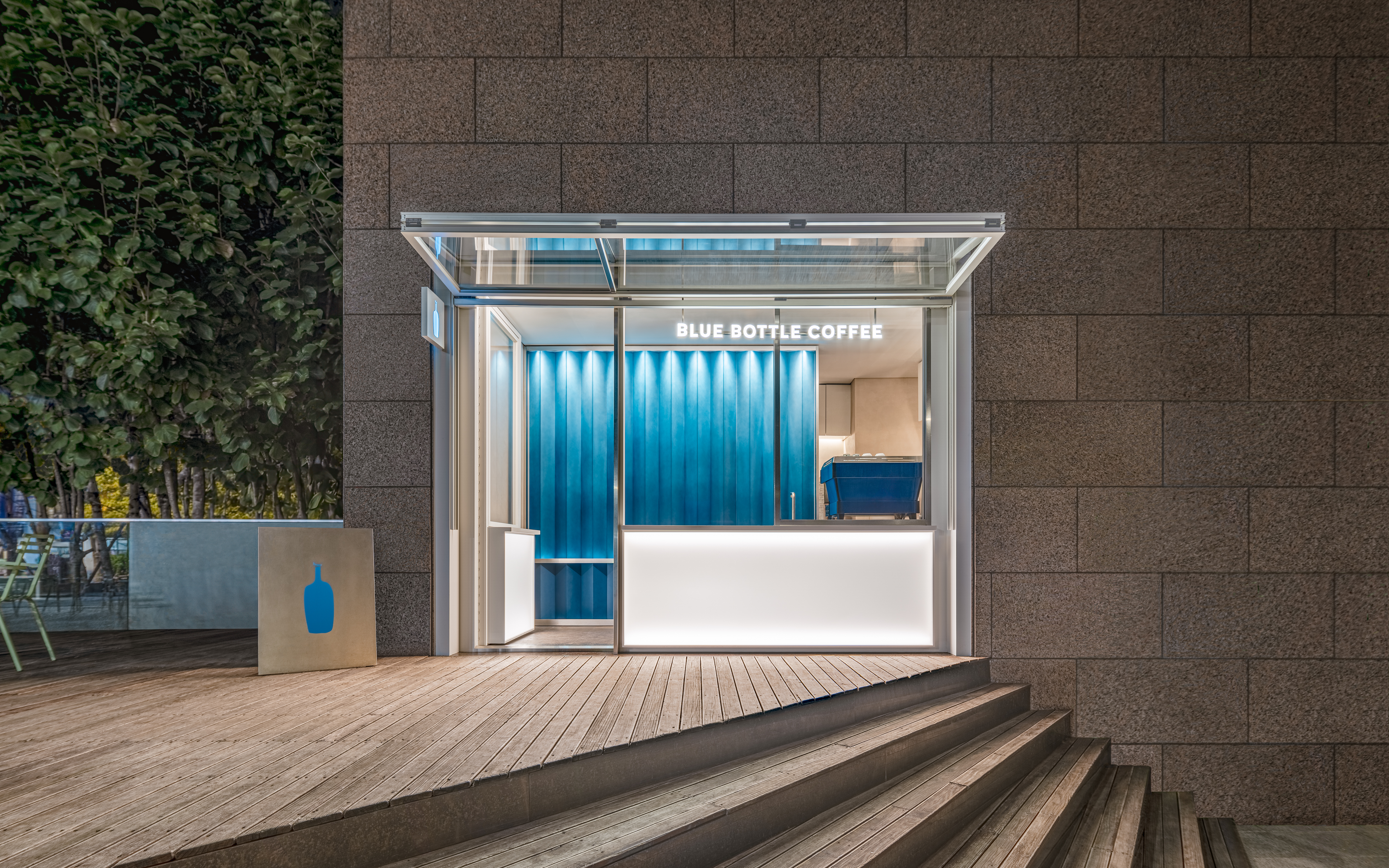 블루보틀 삼성 카페는 서울 도심 한가운데 위치한 15번째 정규 매장으로, 2021년부터 약 1년간 장기 팝업 형태로 운영되던 공간을 새롭게 단장해 개장하였다. ‘온더고(on the go)’ 형태로 계획된 이 매장은 테이크아웃 중심의 간결한 동선과 개방감을 중심으로 구성되었다. 외관에는 폴딩 셔터가 설치되어 낮에는 오픈된 상태로 사이니지와 차양 역할을 하고, 밤에는 반사 재질을 통해 내부 조명이 외부로 은은히 퍼져 도심 속 시각적 포인트를 형성한다. 카페 내부는 개방형 바 스테이션과 그레이디언트 아크릴 벽을 중심으로 설계되어 브랜드 특유의 절제된 미니멀 디자인에 생기를 더하며, 카페 옆 야외 공간은 커피를 테이크아웃하는 손님이 잠시 머물 수 있도록 구성되었다. 이 공간은 삼성 지역 커뮤니티의 흐름과 연결되며, 단순한 매장을 넘어 일상 속 짧은 여백을 경험할 수 있는 장소로 계획되었다.