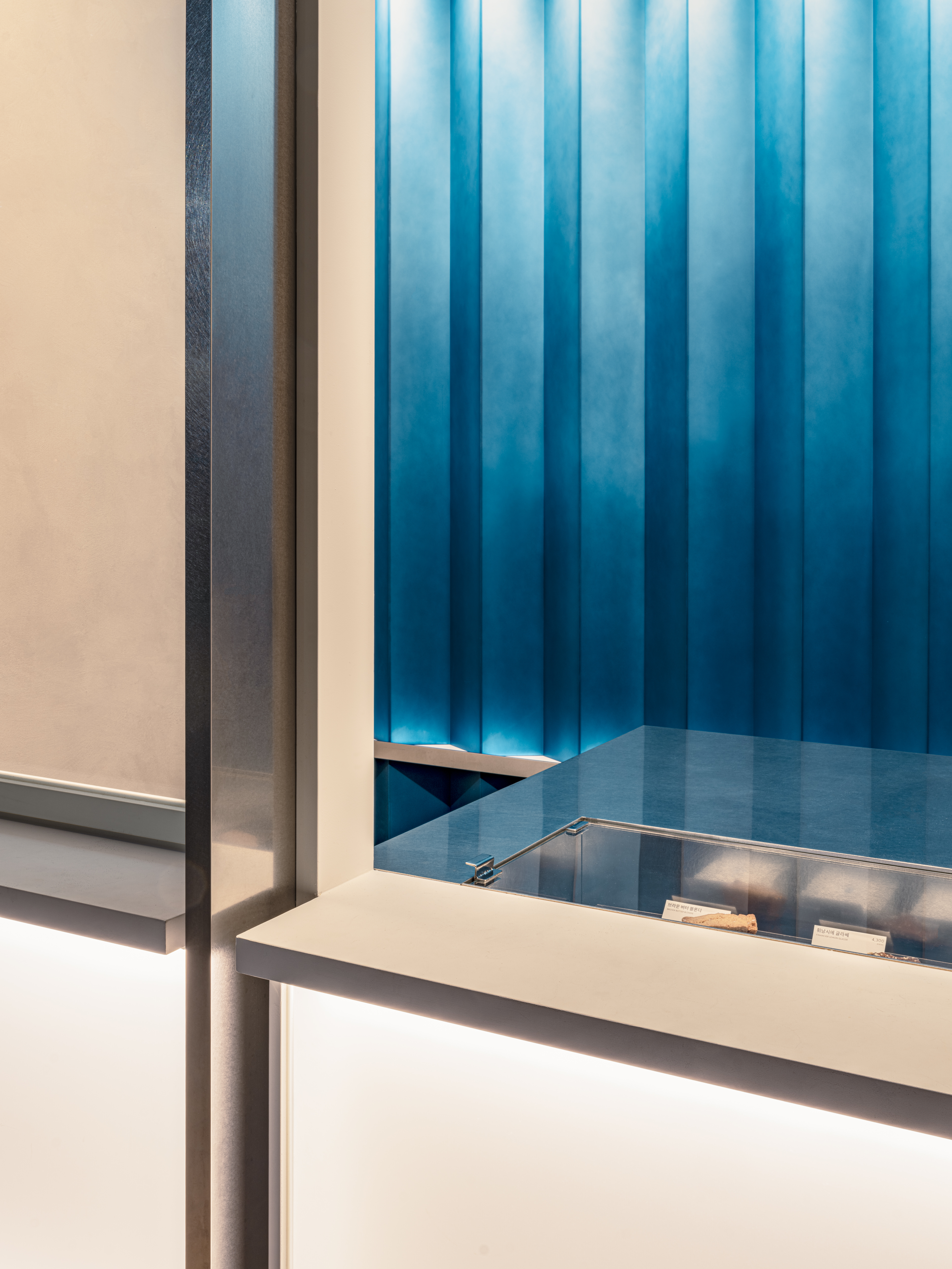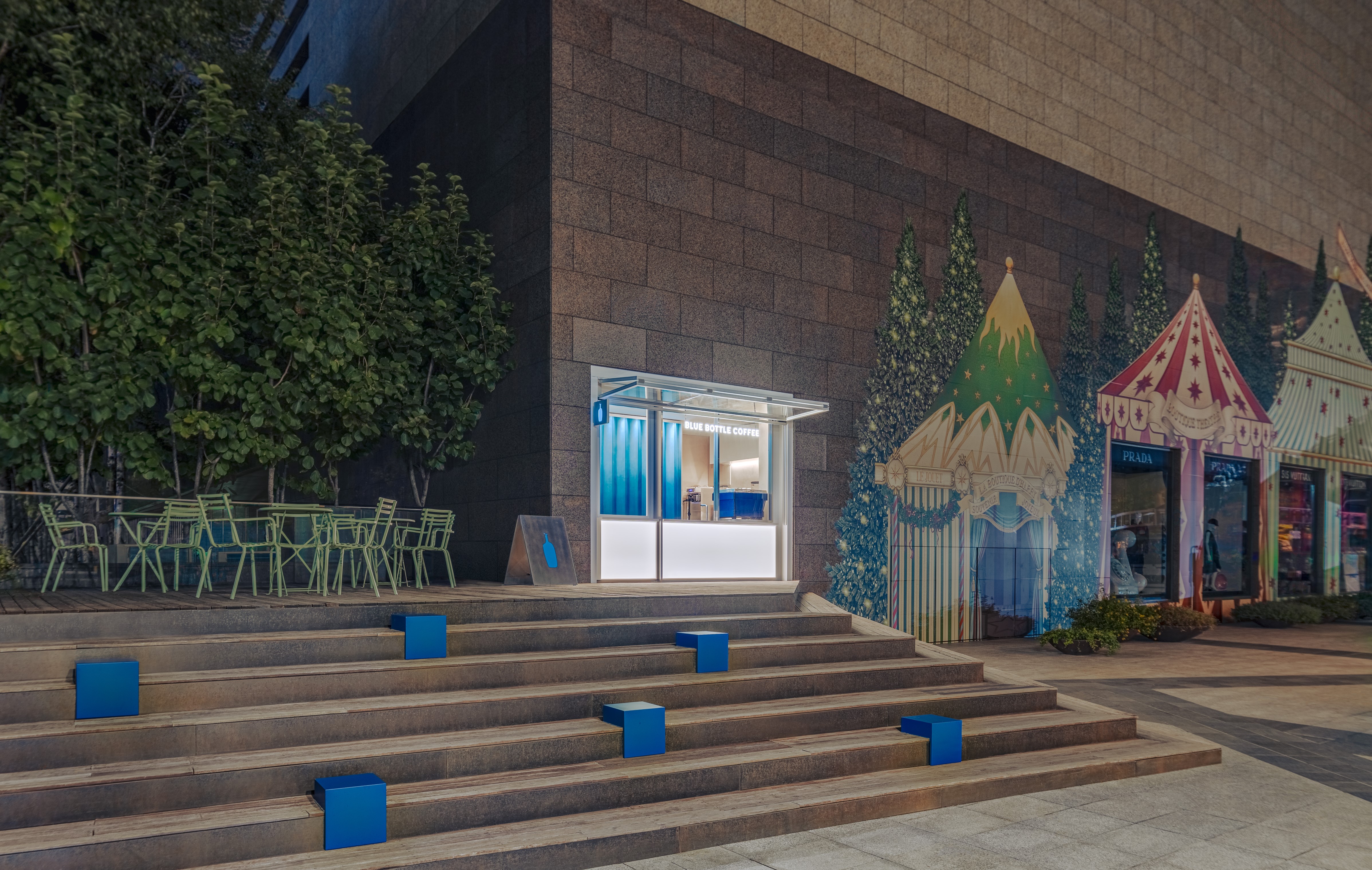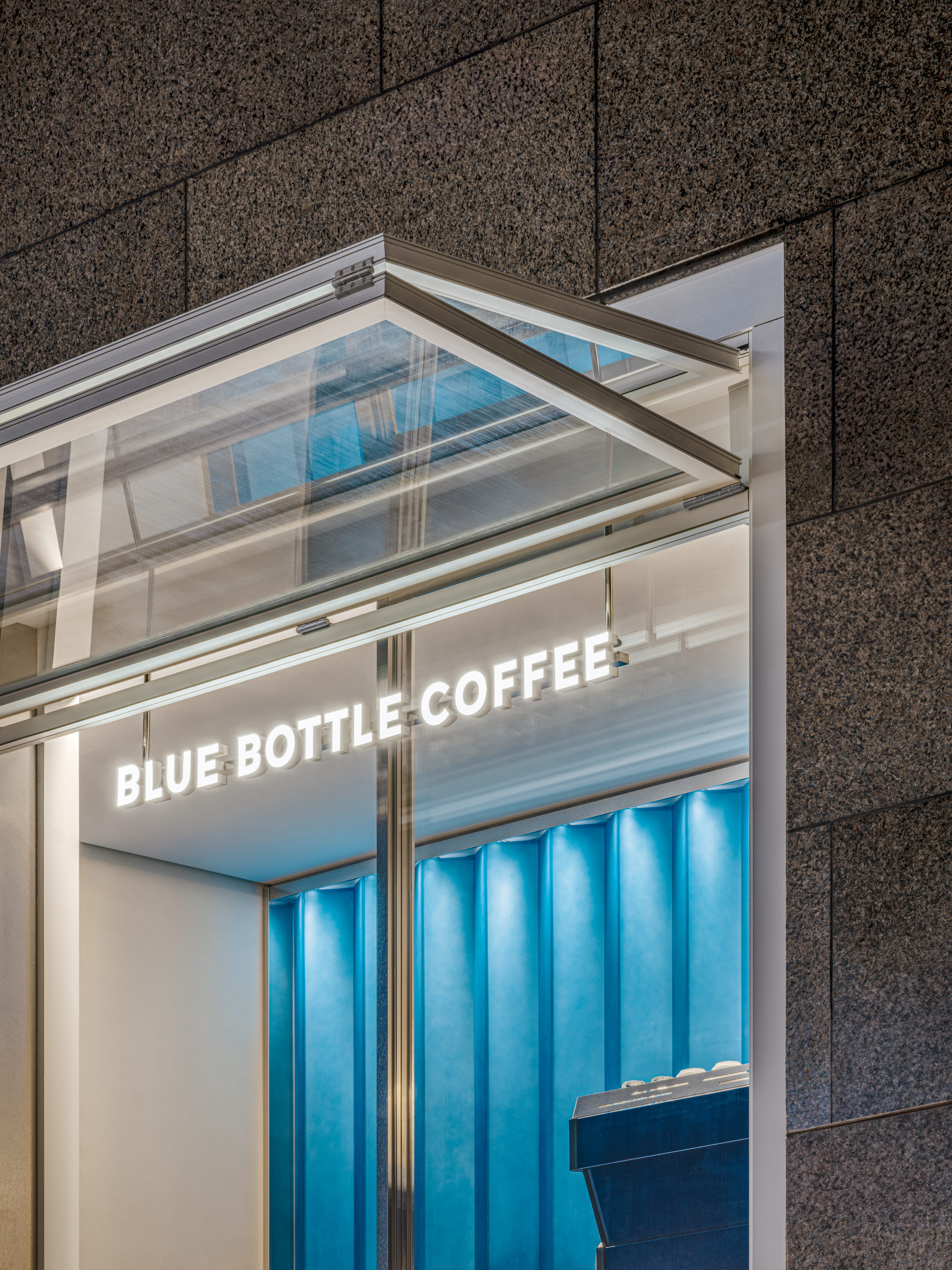블루보틀 삼성 카페는 서울 도심 한가운데 위치한 15번째 정규 매장으로, 2021년부터 약 1년간 장기 팝업 형태로 운영되던 공간을 새롭게 단장해 개장하였다. ‘온더고(on the go)’ 형태로 계획된 이 매장은 테이크아웃 중심의 간결한 동선과 개방감을 중심으로 구성되었다. 외관에는 폴딩 셔터가 설치되어 낮에는 오픈된 상태로 사이니지와 차양 역할을 하고, 밤에는 반사 재질을 통해 내부 조명이 외부로 은은히 퍼져 도심 속 시각적 포인트를 형성한다. 카페 내부는 개방형 바 스테이션과 그레이디언트 아크릴 벽을 중심으로 설계되어 브랜드 특유의 절제된 미니멀 디자인에 생기를 더하며, 카페 옆 야외 공간은 커피를 테이크아웃하는 손님이 잠시 머물 수 있도록 구성되었다. 이 공간은 삼성 지역 커뮤니티의 흐름과 연결되며, 단순한 매장을 넘어 일상 속 짧은 여백을 경험할 수 있는 장소로 계획되었다.